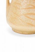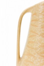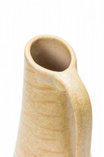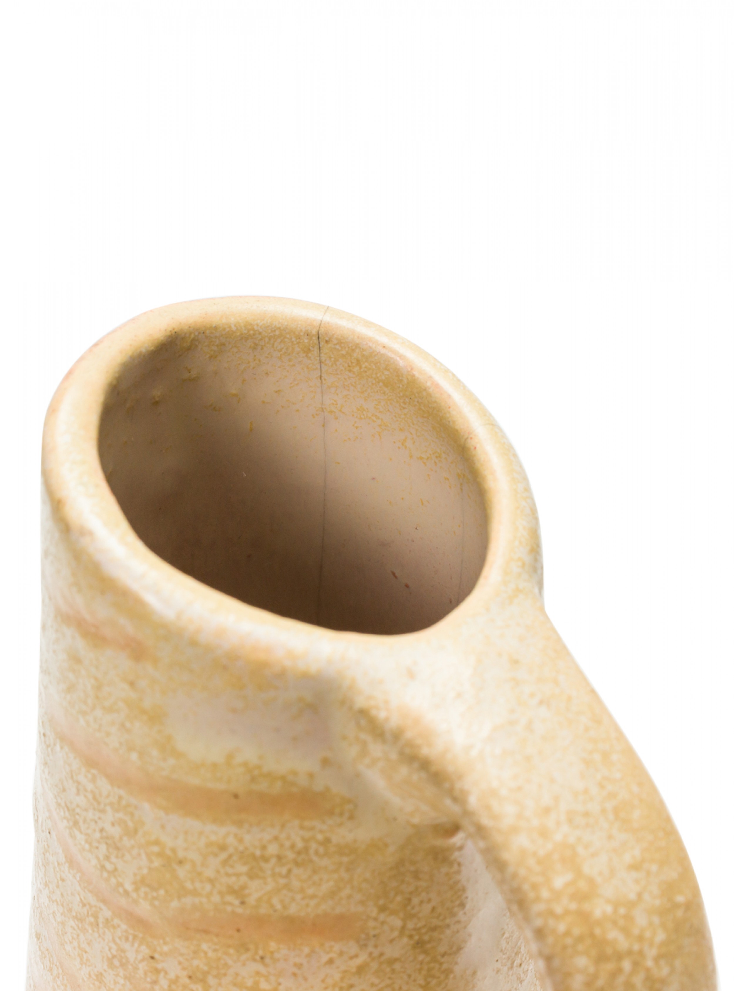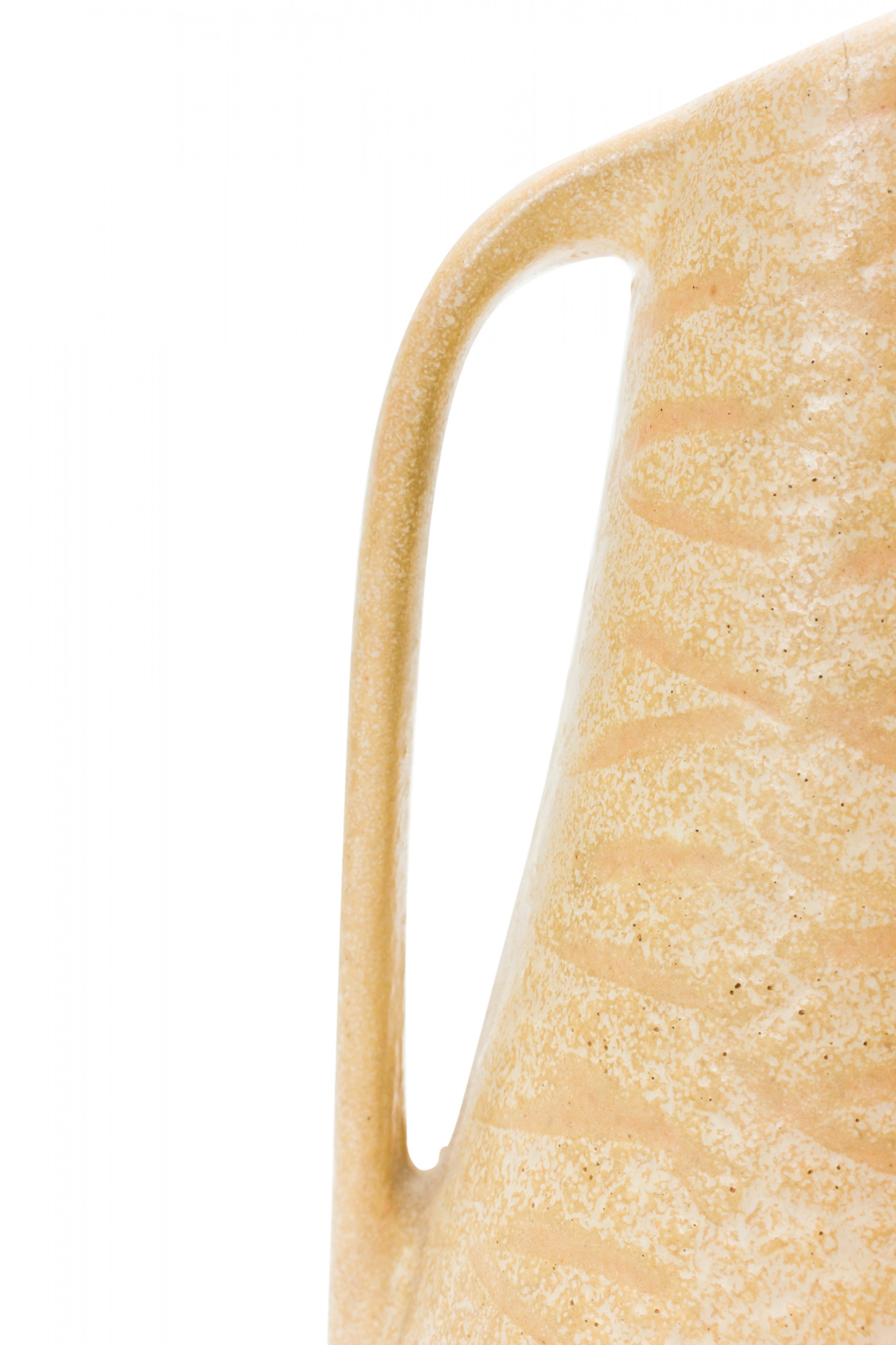 West German Mid-Century ceramic pitcher with a hand painted yellow stripe patterned glaze and a slanted spout. (mark on bottom "GERA" denoting model name from VEB Gräfenroda)