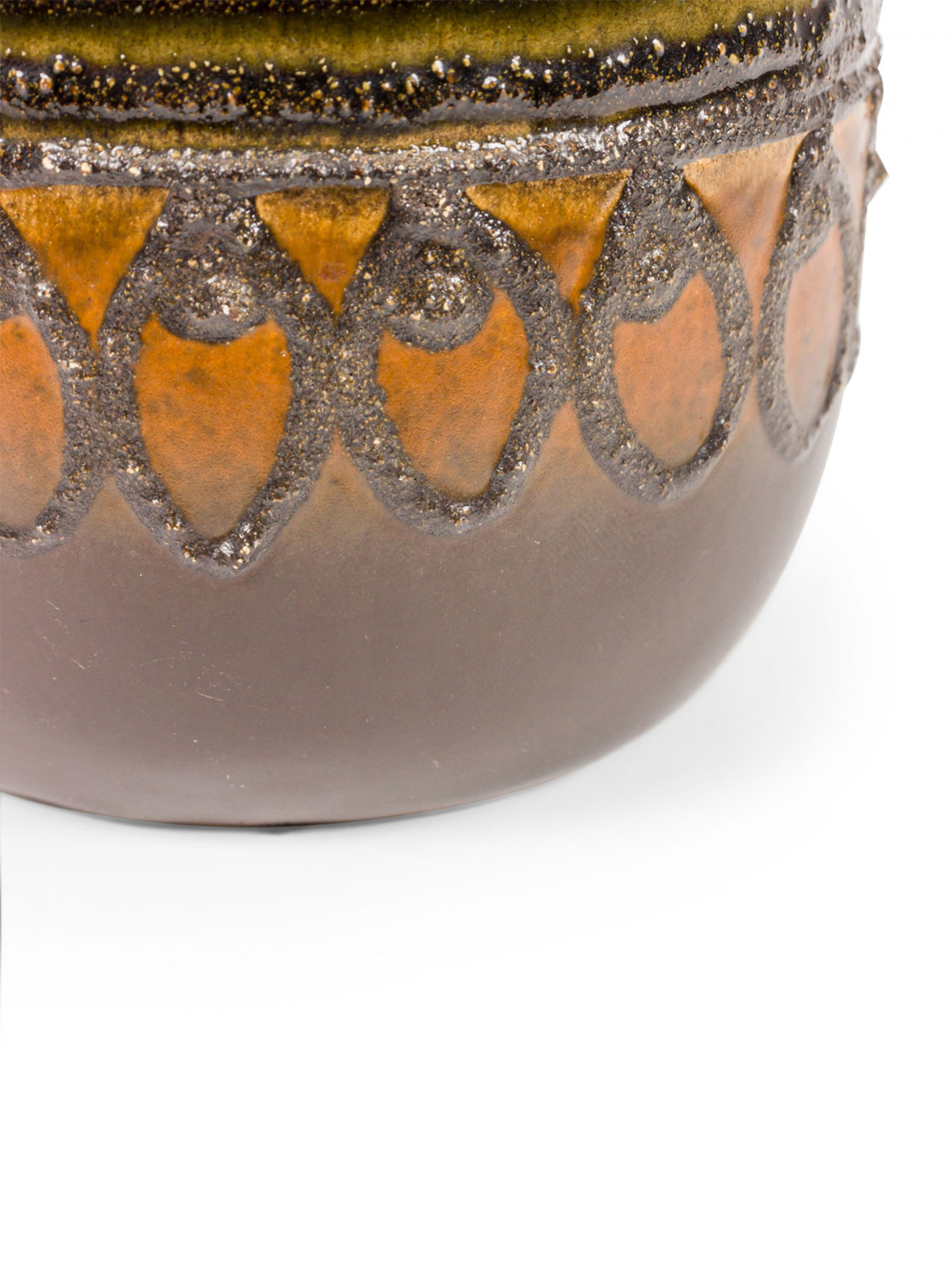 German Mid-Century ceramic vase with a raised and pitted black banded pattern of circles and lines against a dark brown glazed ground. (VEB HALDENSLEBEN mark on bottom, 2801D)