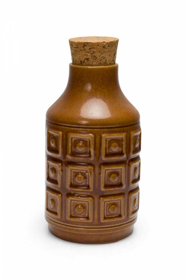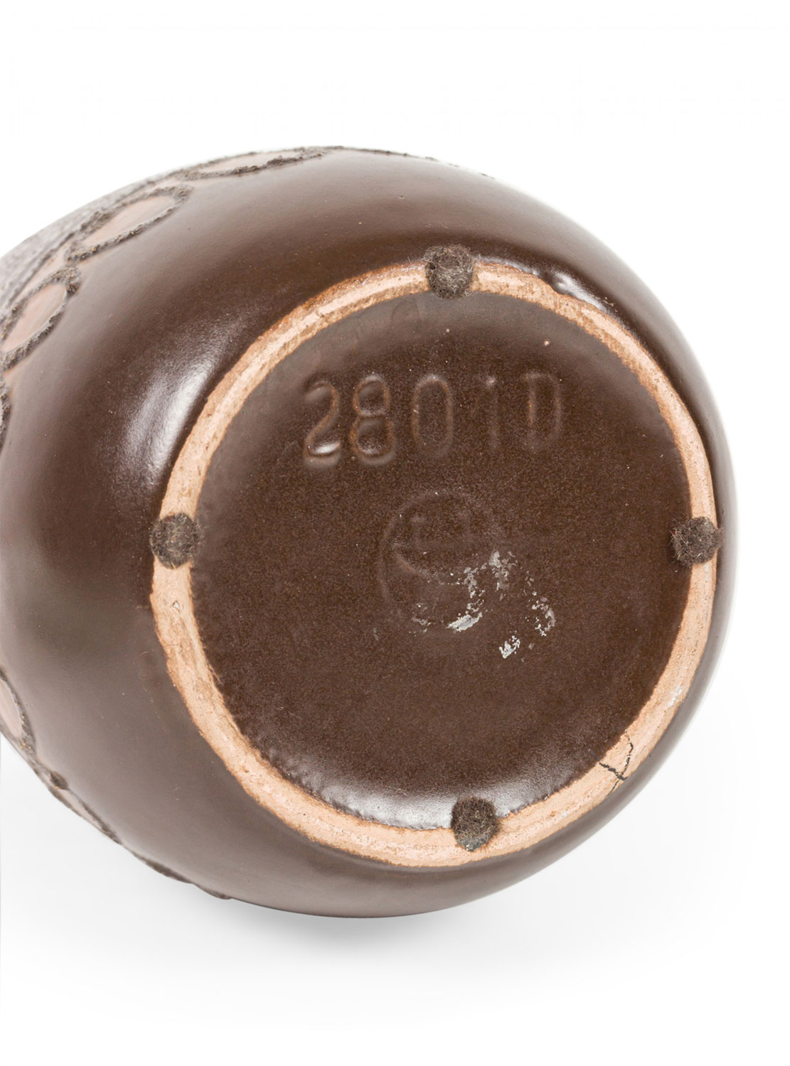 German Mid-Century ceramic vase with a raised and pitted black banded pattern of circles and lines against a dark brown glazed ground. (VEB HALDENSLEBEN mark on bottom, 2801D).