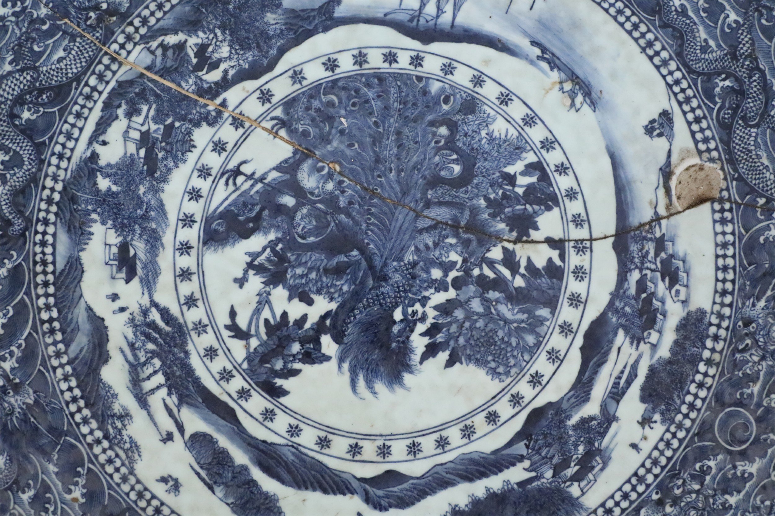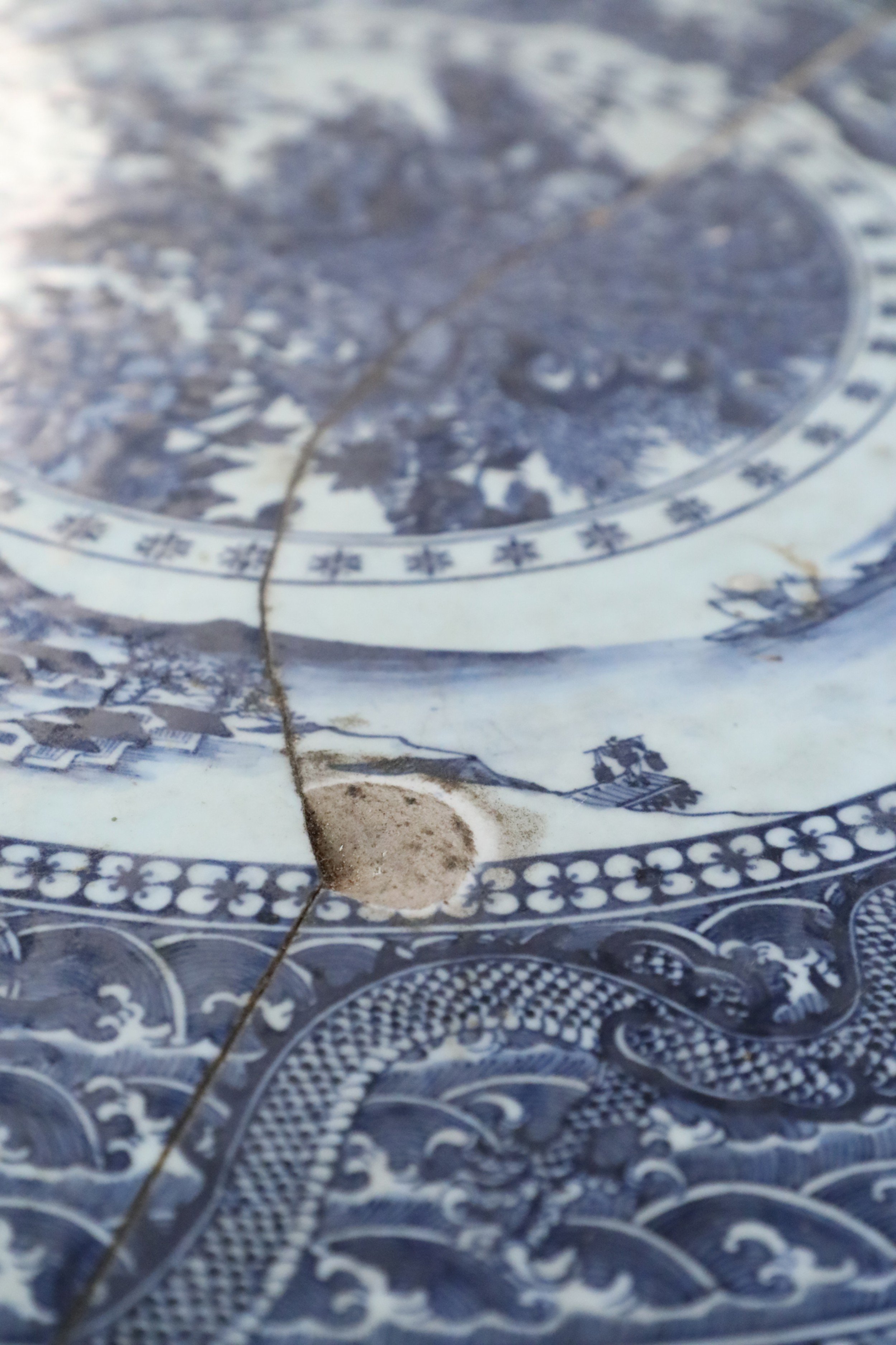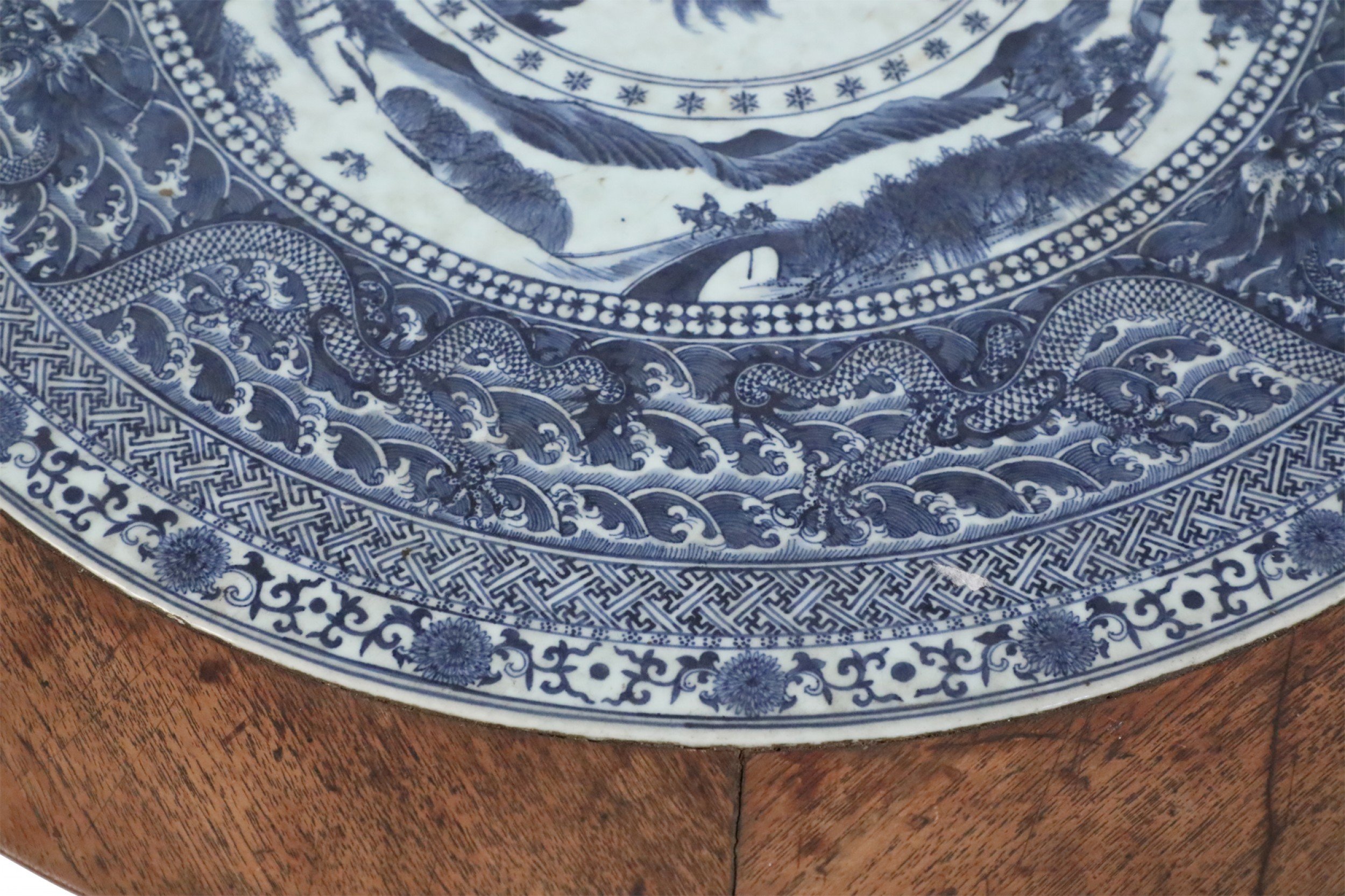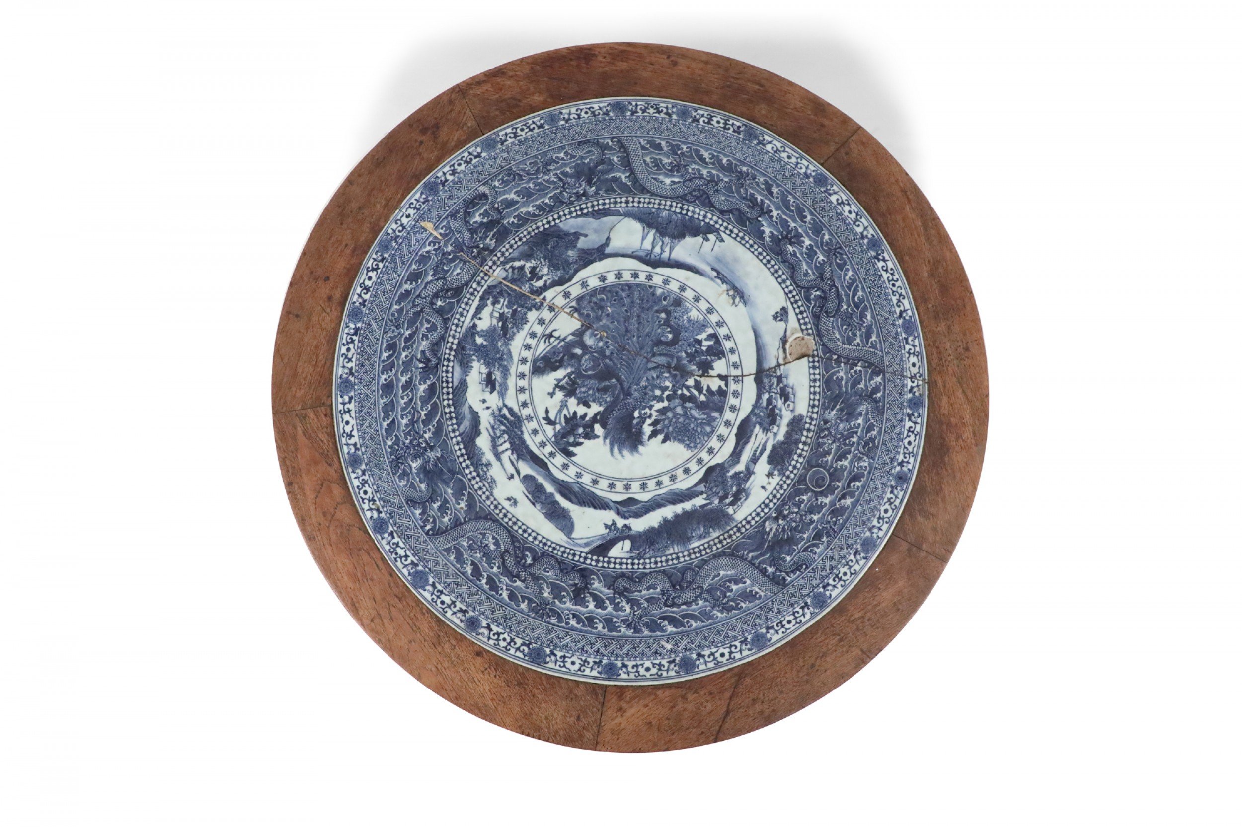 Victorian Aestheticism-style round oak center table having an inset antique, 18th century-style blue and white porcelain plate (as is) decorated in alternating bands of circular patterns and traditional motifs, atop an incised apron supported on four turned and incised legs connected with an x-shaped stretcher carved with floral and geometric designs..