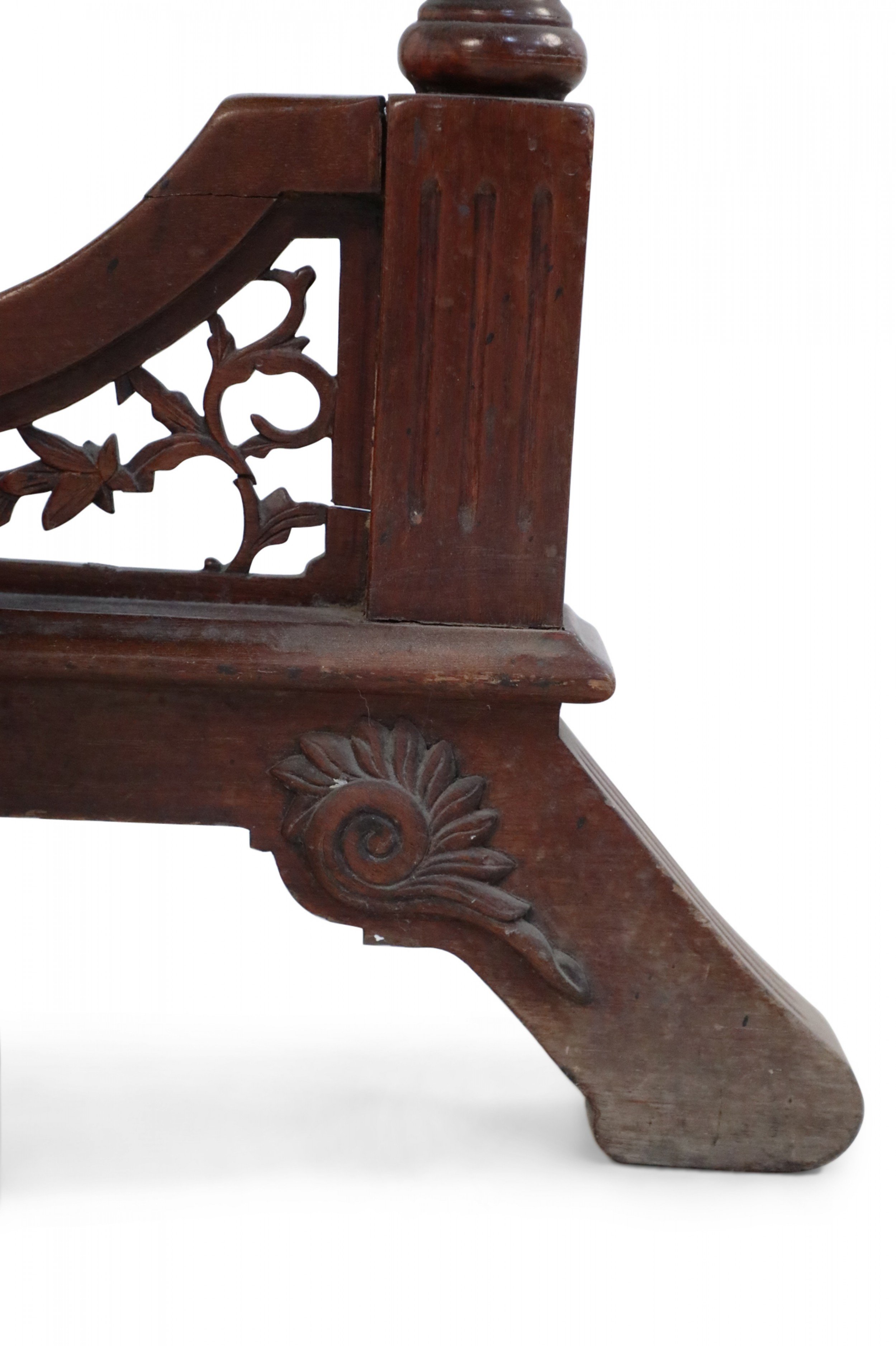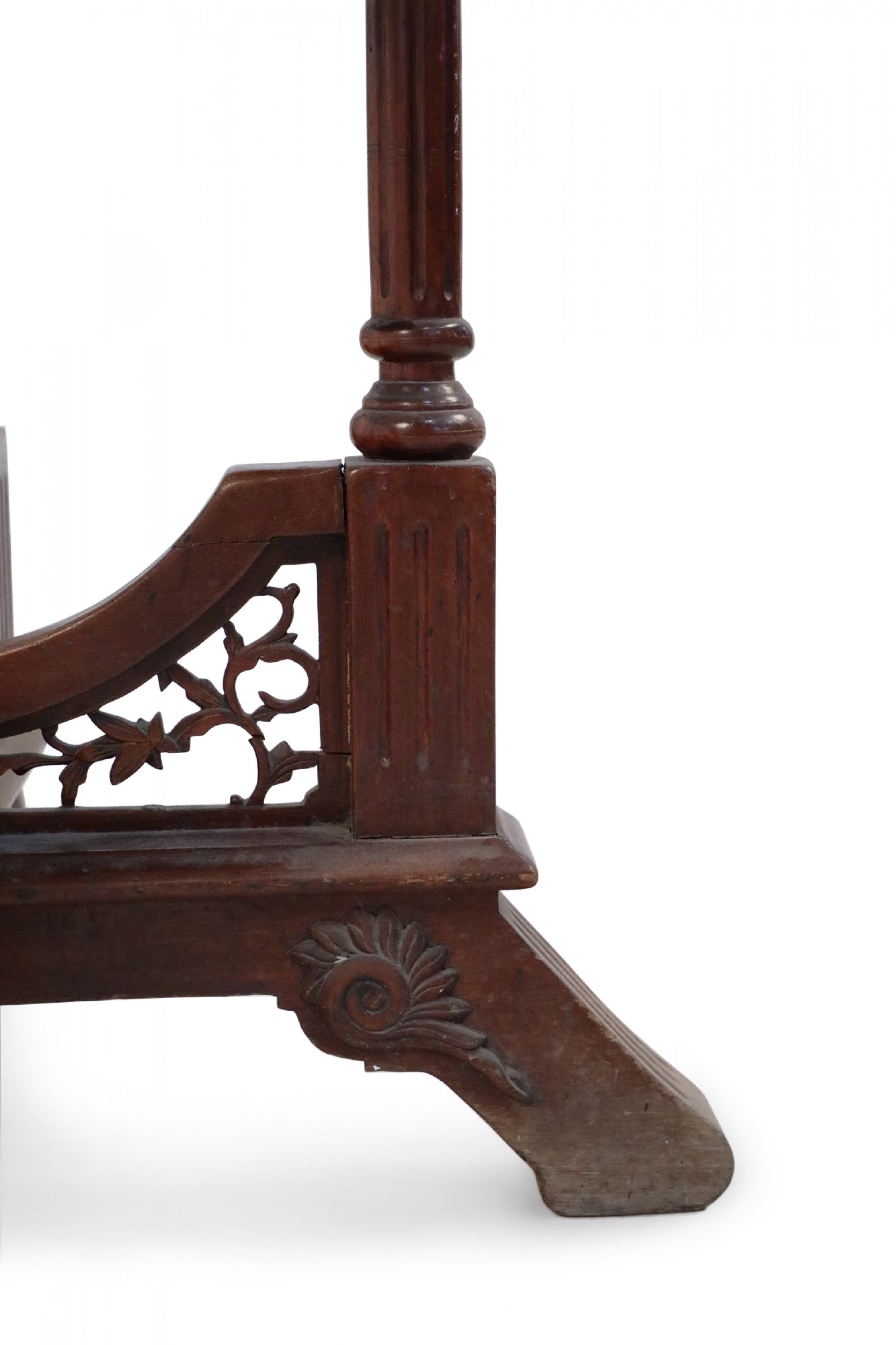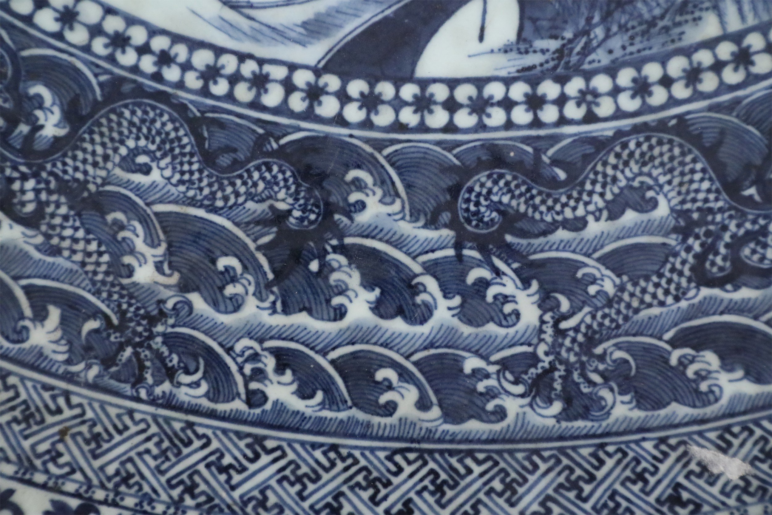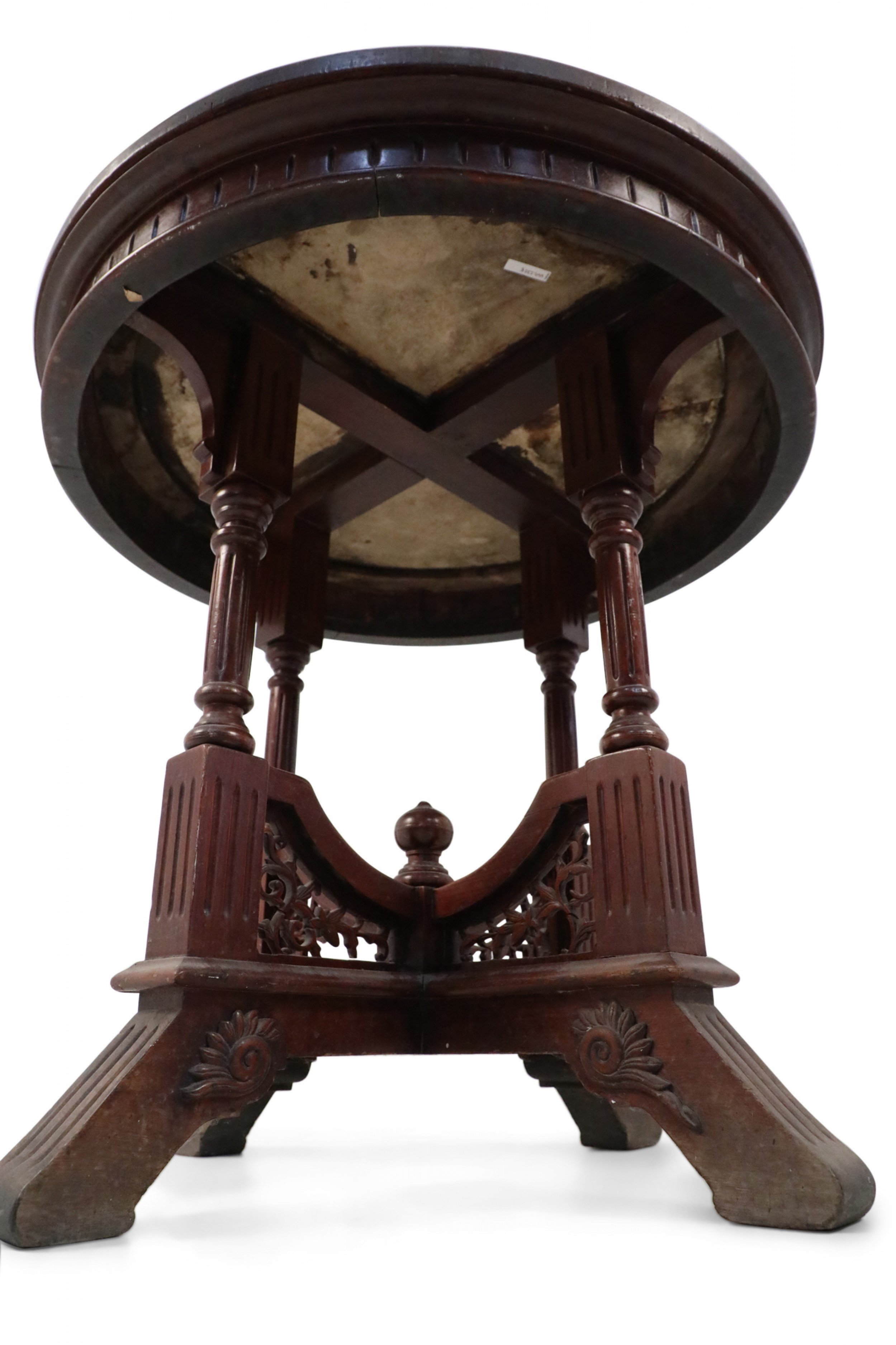 Victorian Aestheticism-style round oak center table having an inset antique, 18th century-style blue and white porcelain plate (as is) decorated in alternating bands of circular patterns and traditional motifs, atop an incised apron supported on four turned and incised legs connected with an x-shaped stretcher carved with floral and geometric designs..