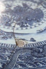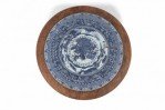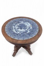 Style: English Materials & Techniques: Porcelain, wood, oak Category: Tables Condition: Inset plate is cracked all the way across and has a large chip missing adjacent to the crack.