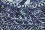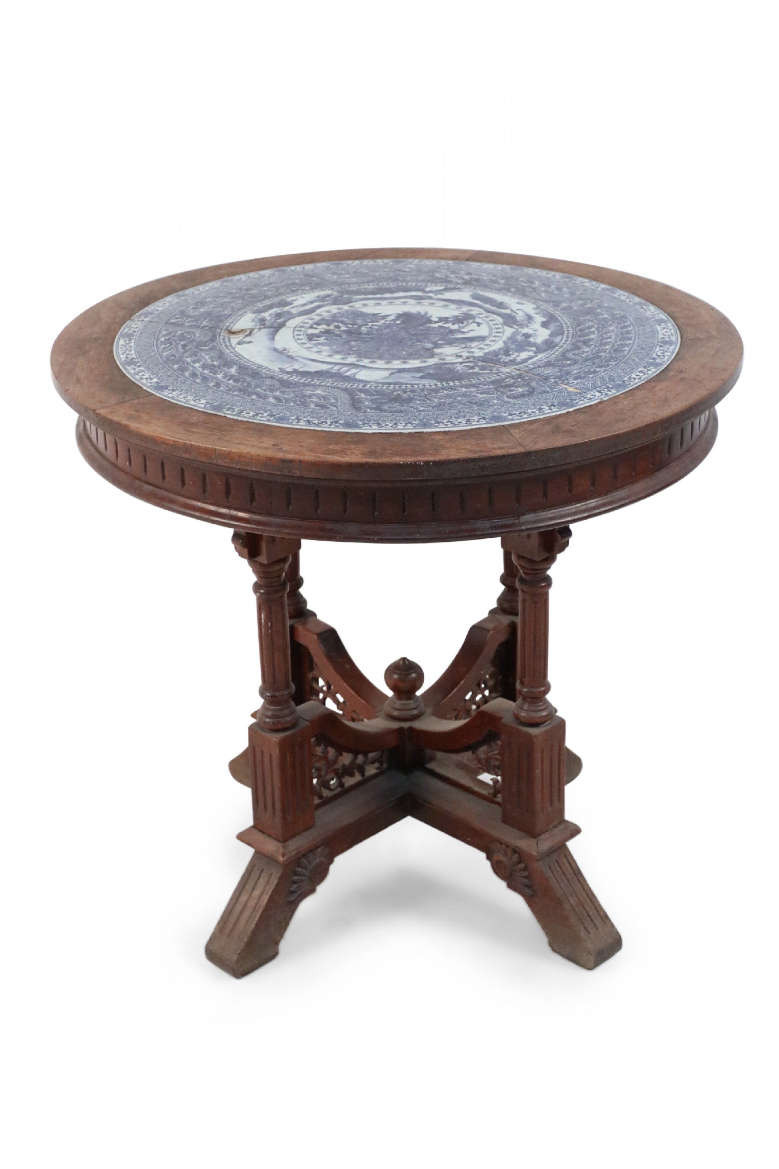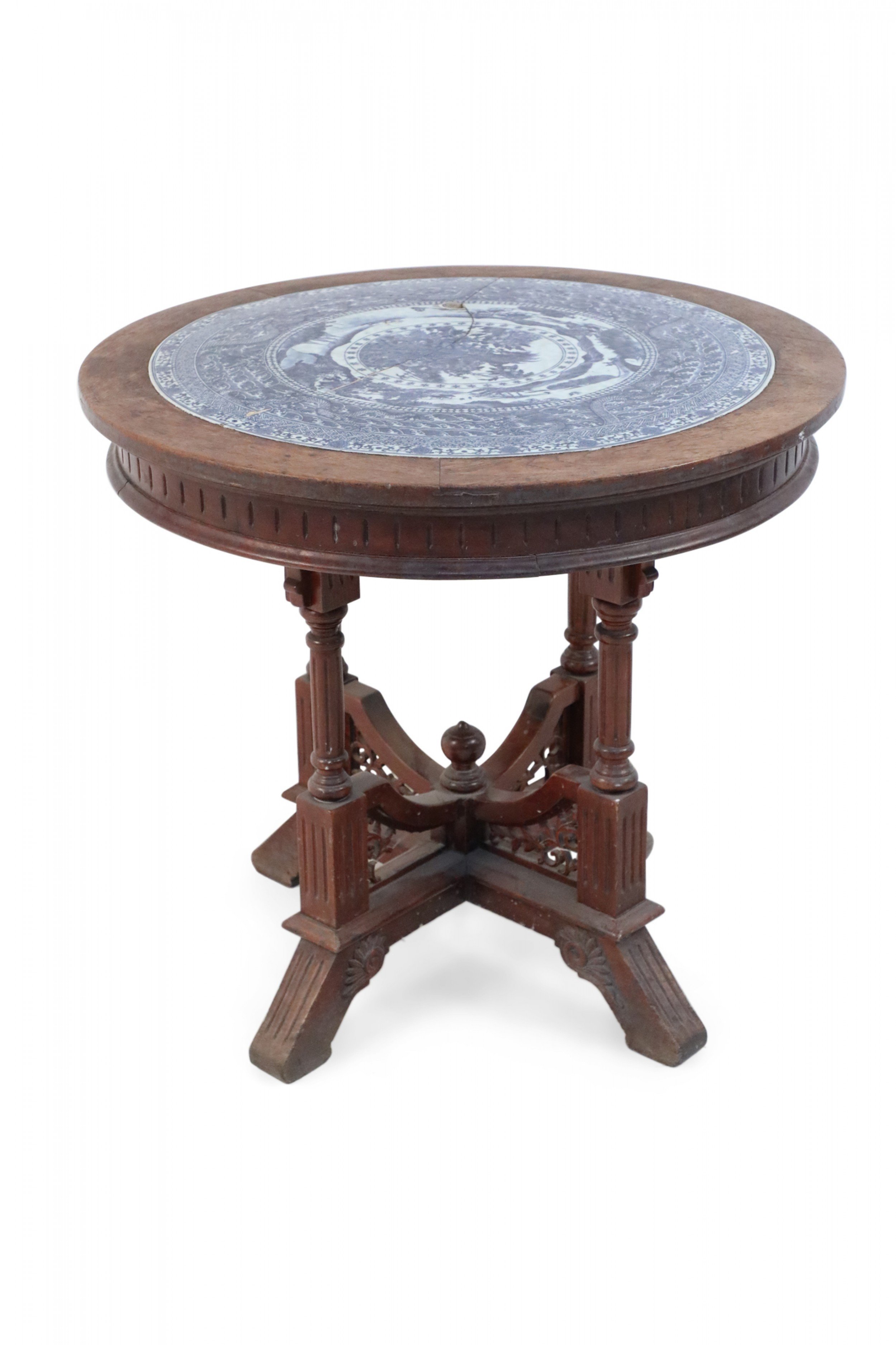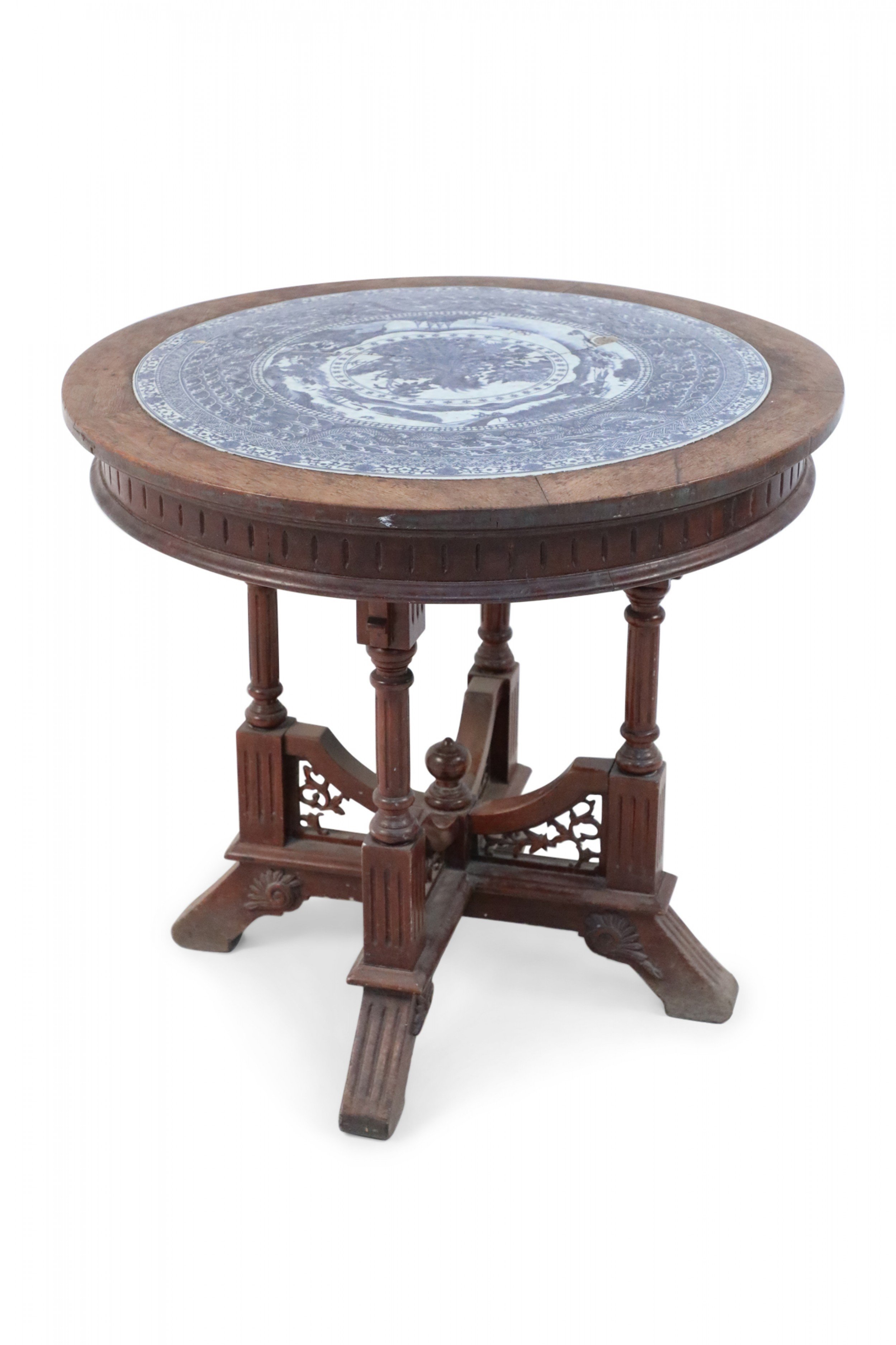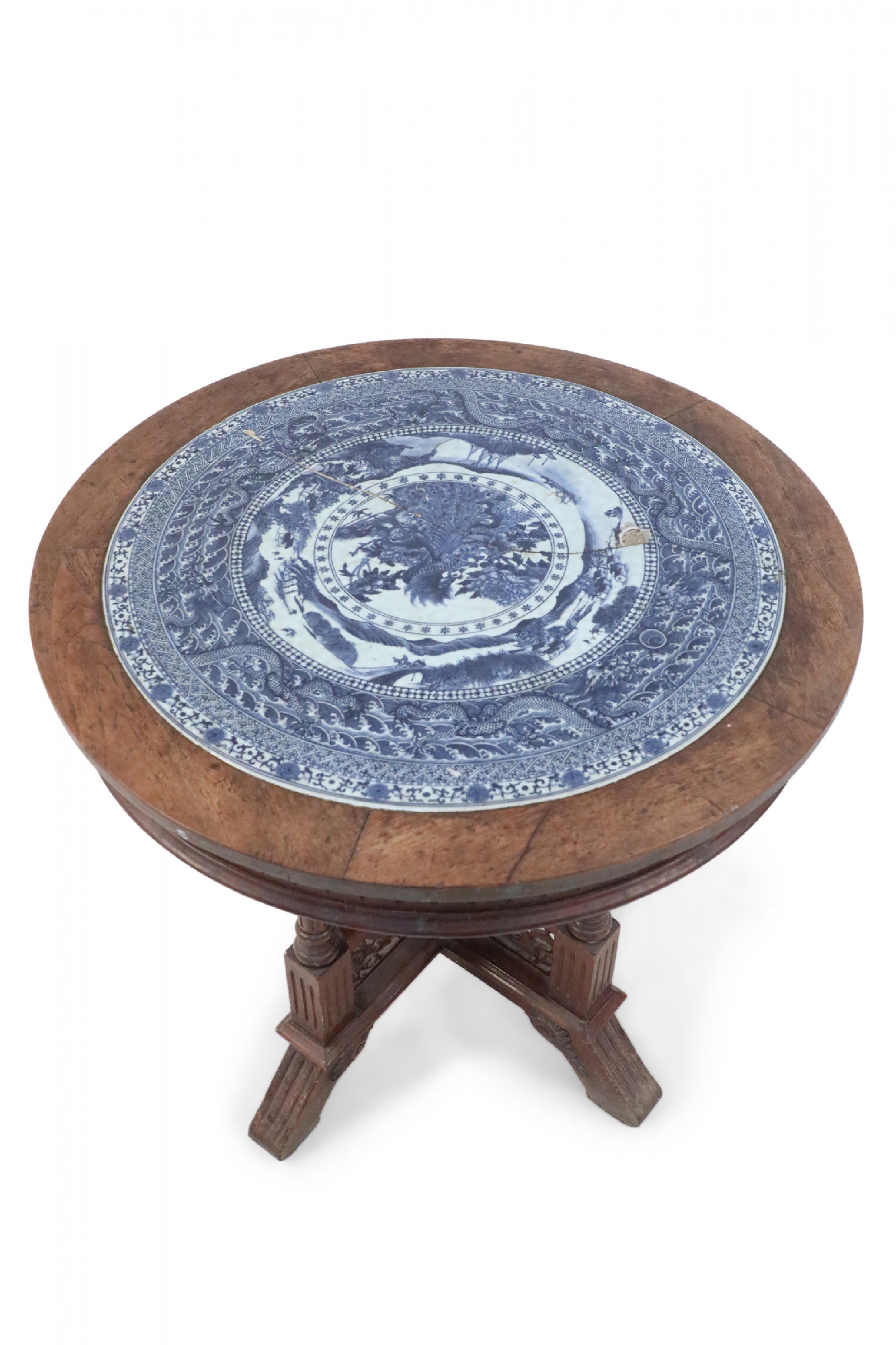 Victorian Aestheticism-style round oak center table having an inset antique, 18th century-style blue and white porcelain plate (as is) decorated in alternating bands of circular patterns and traditional motifs, atop an incised apron supported on four turned and incised legs connected with an x-shaped stretcher carved with floral and geometric designs.