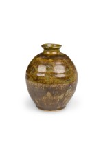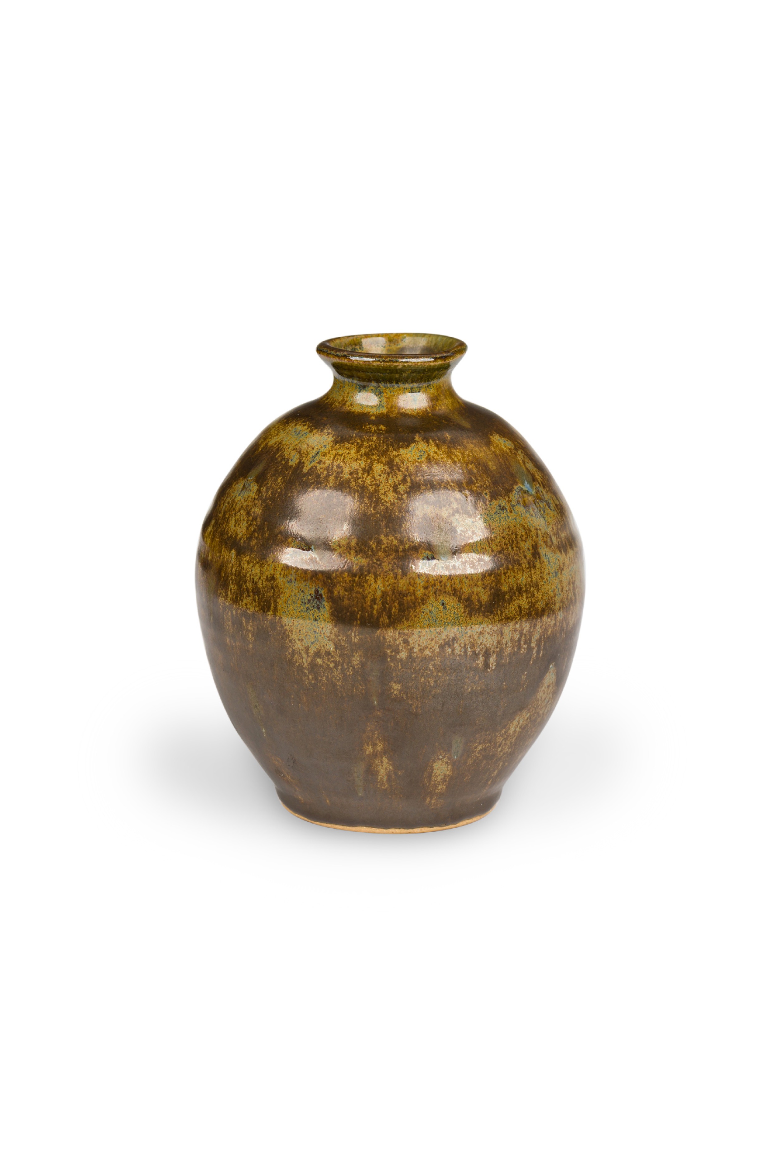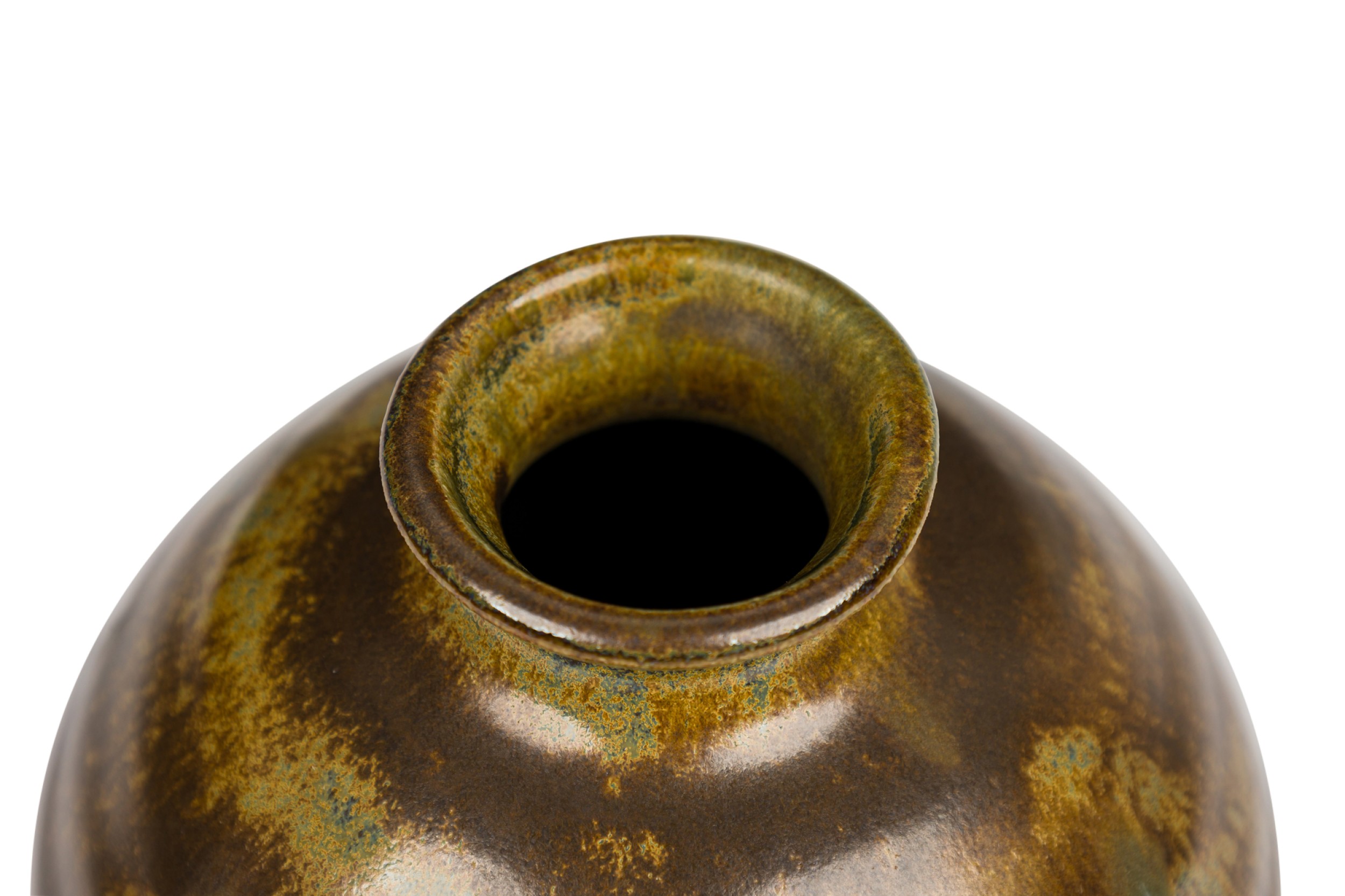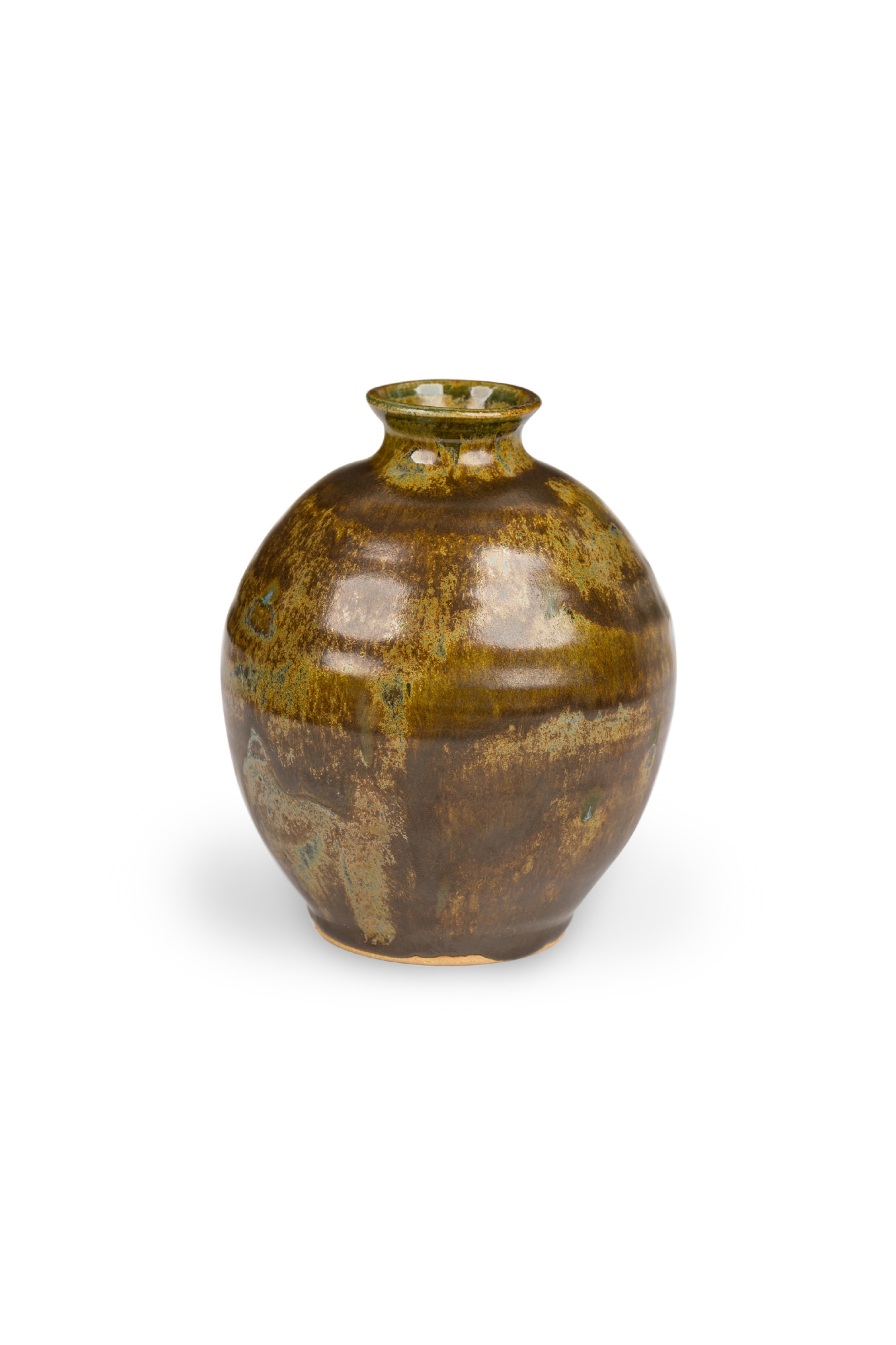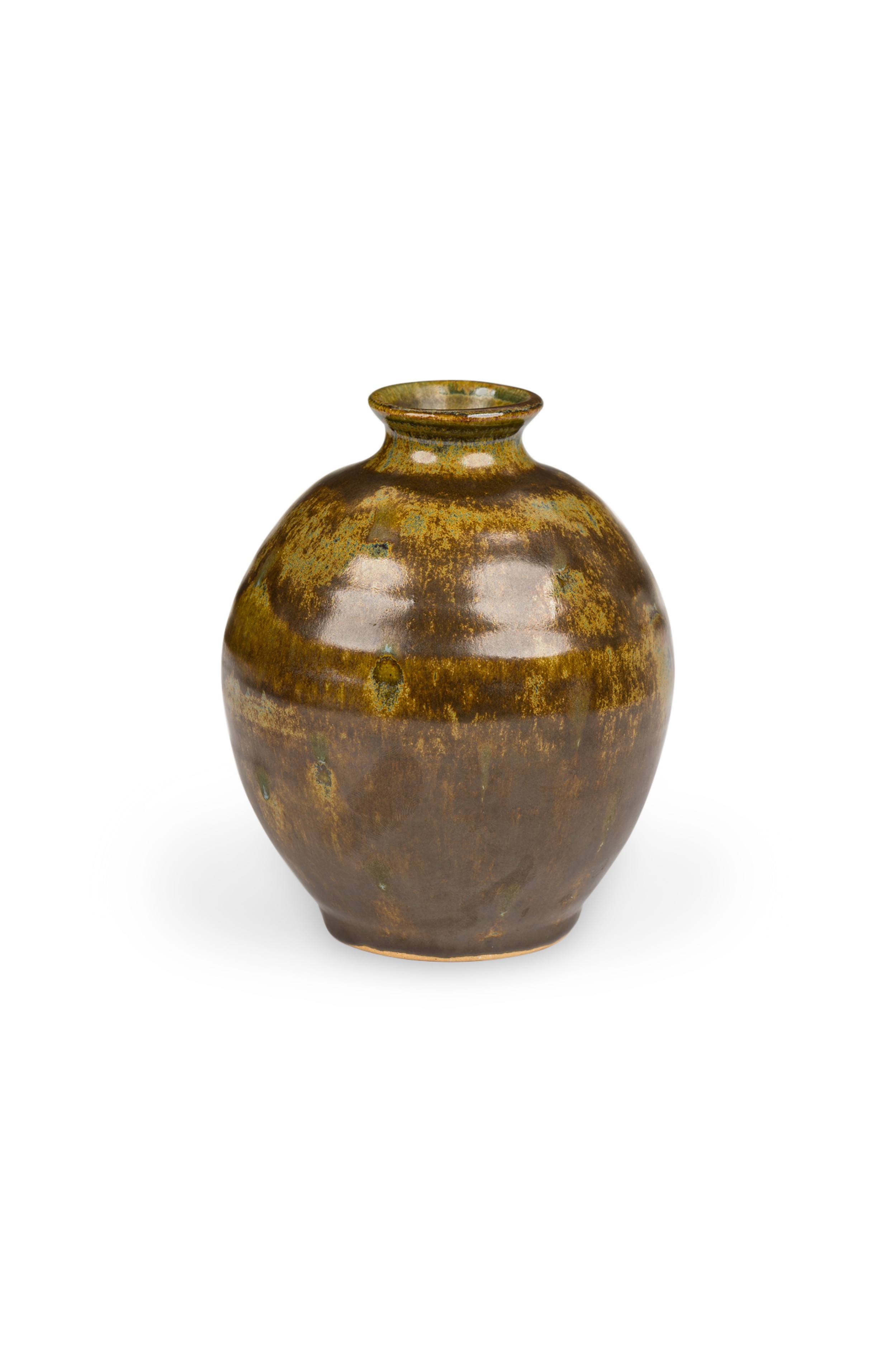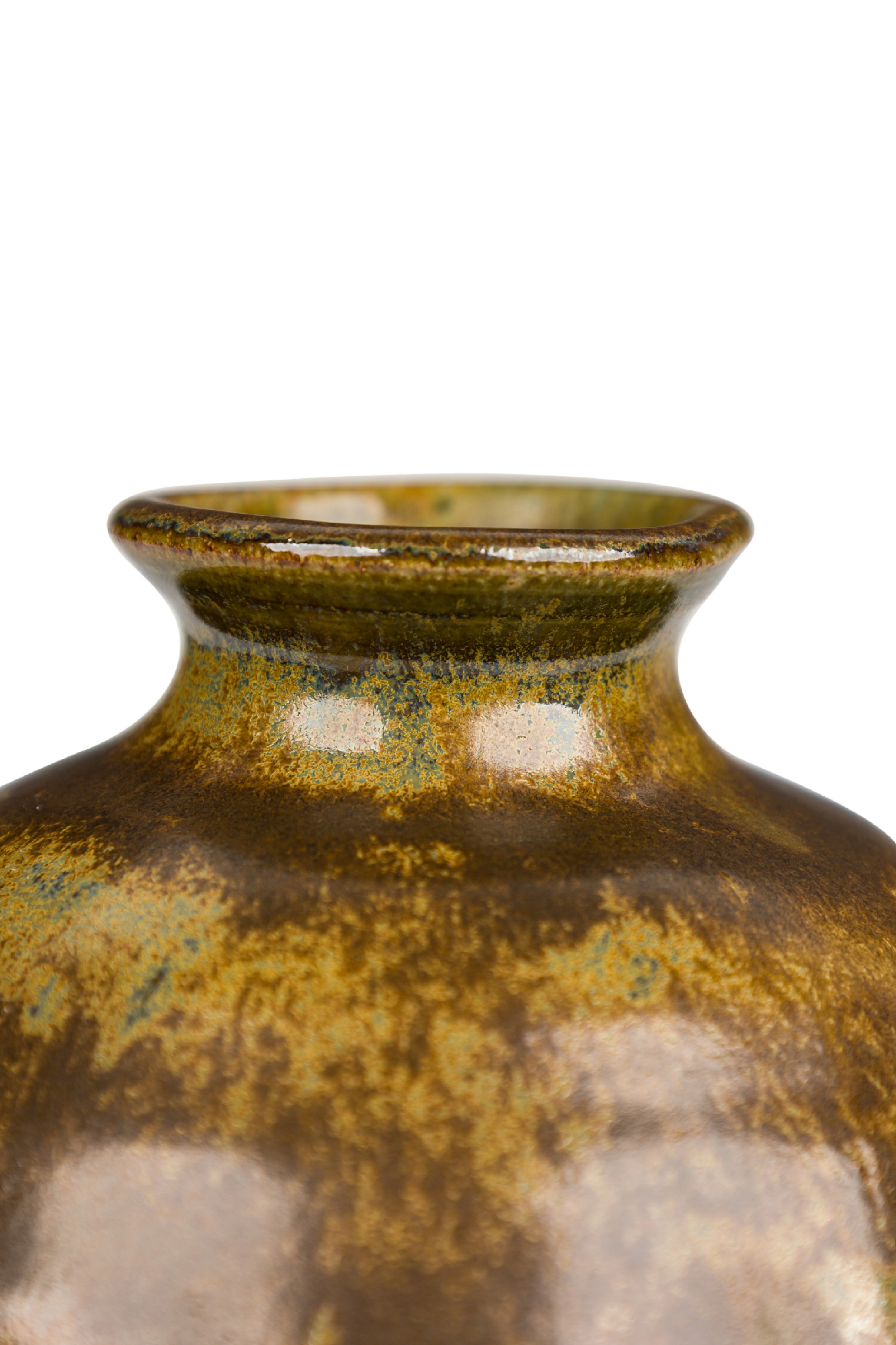 Vintage Asian style round brown and green ceramic urn with a small top rim