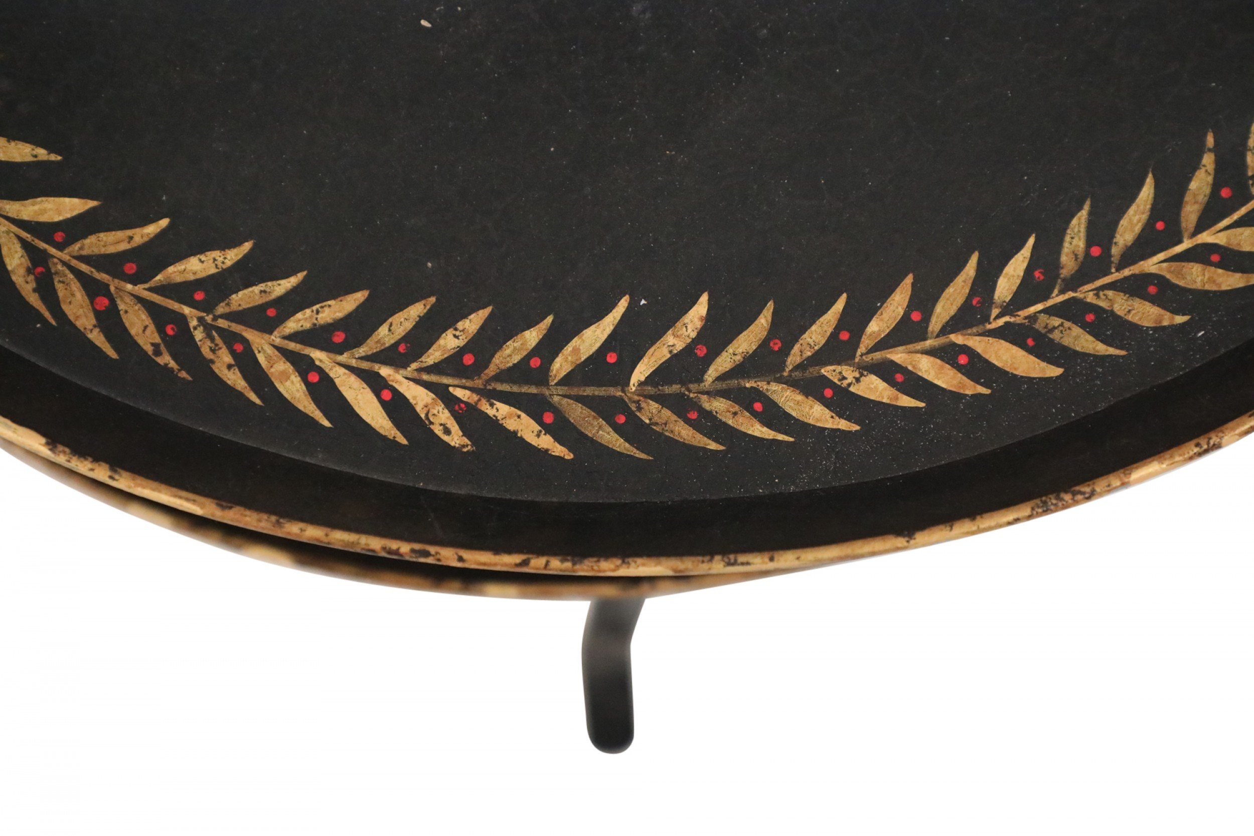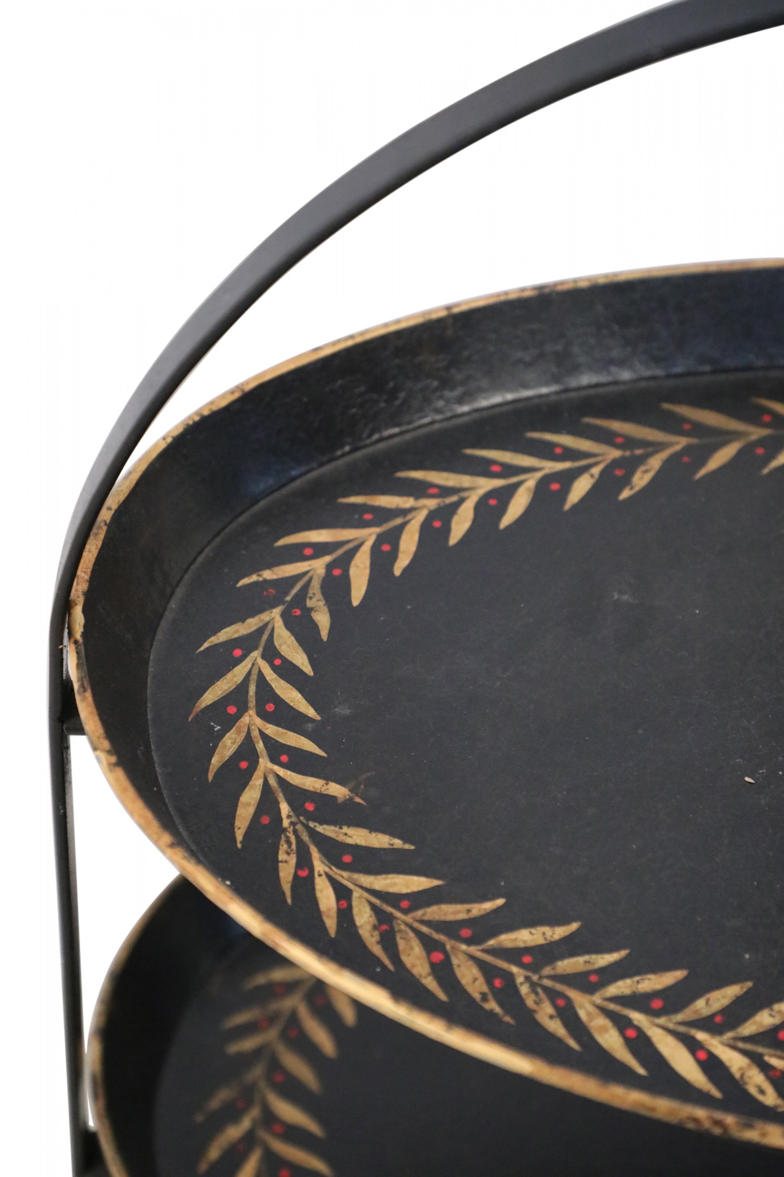 Vintage Chinese black tole, two-tiered server with a black metal frame holding two oval shelves decorated in a garland border of gold leaves with red dots (Available in green: NWL2450)..