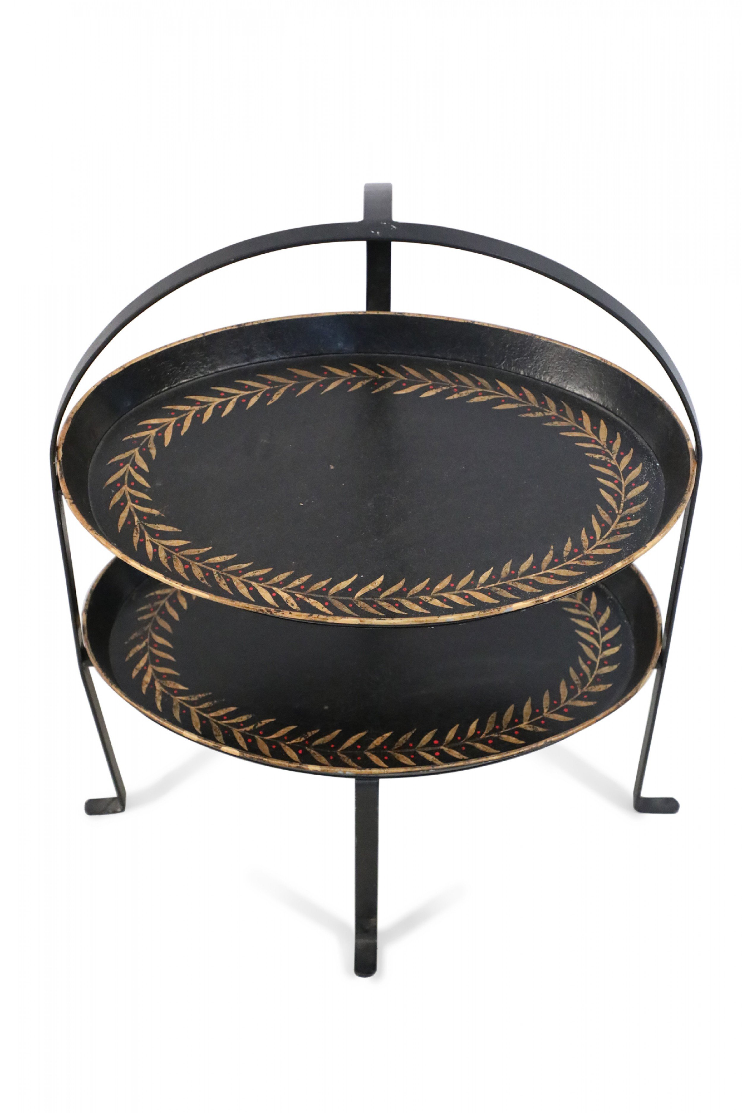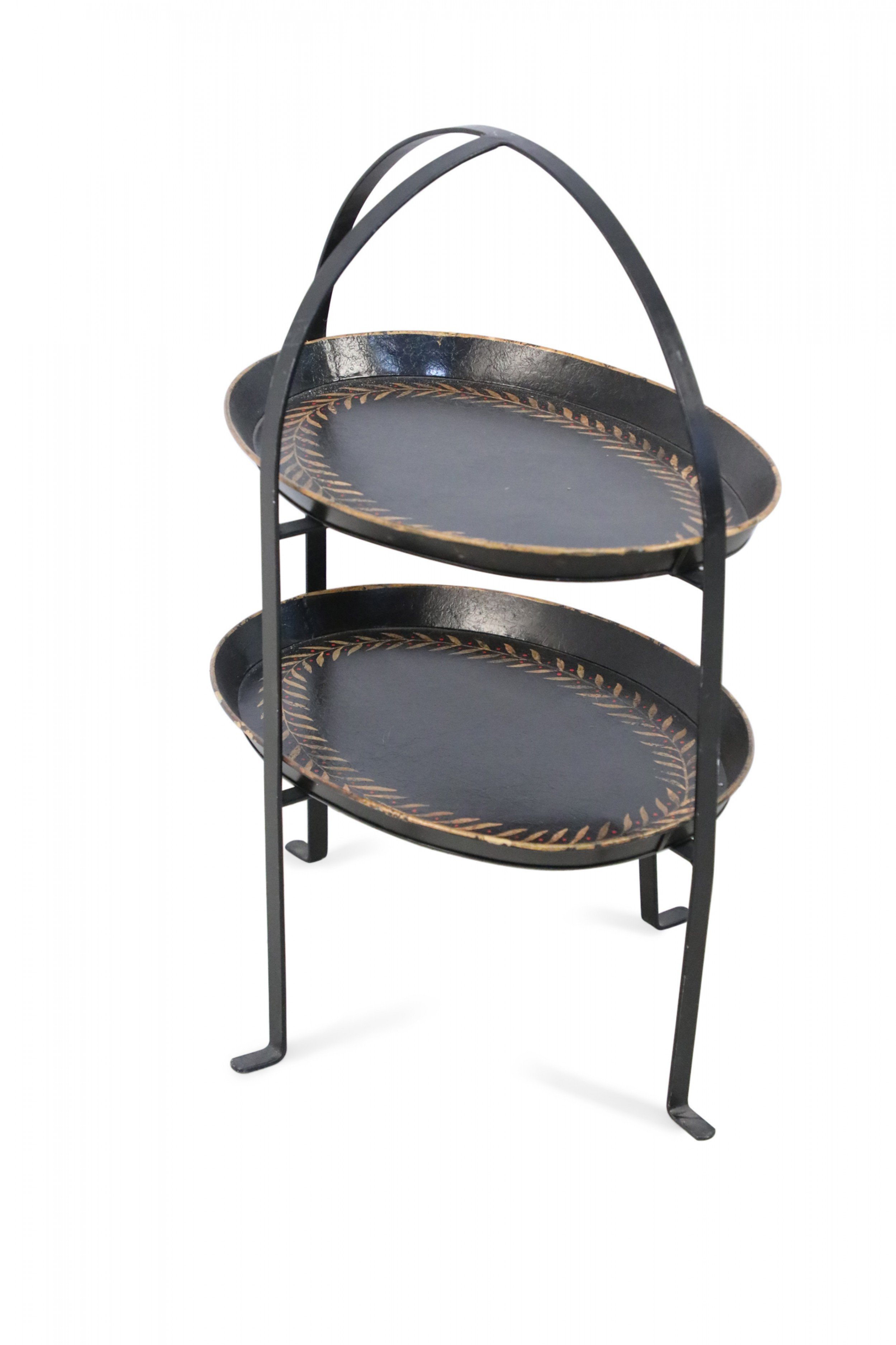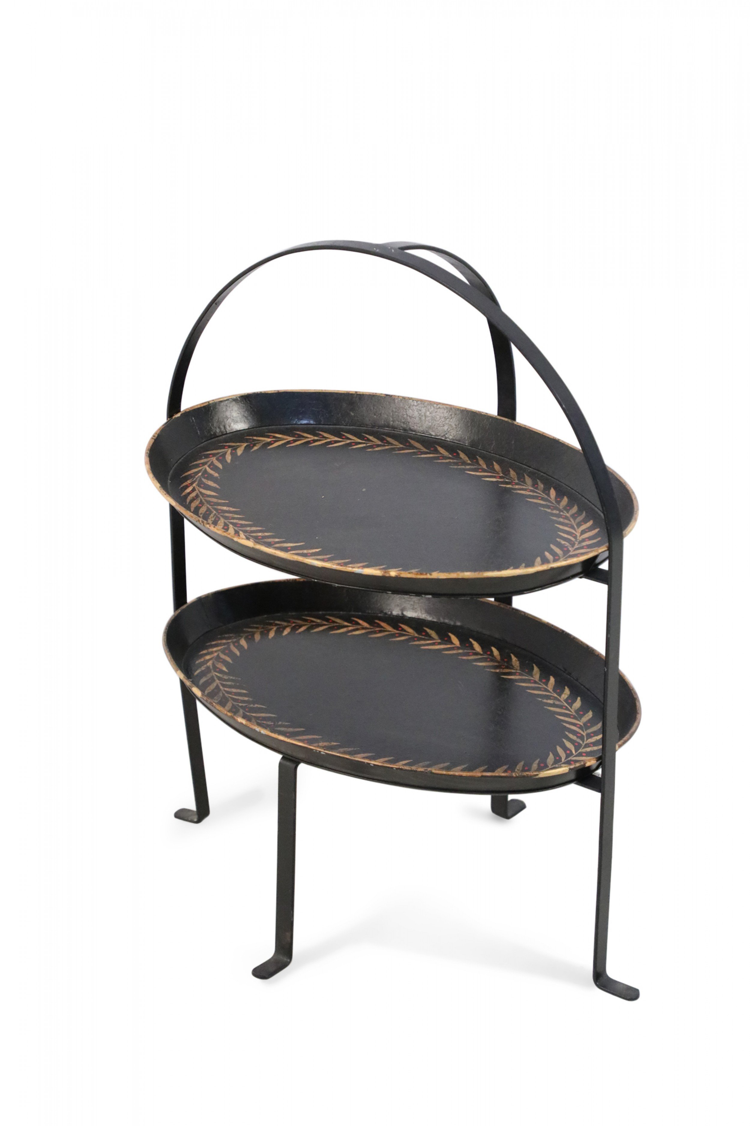 Vintage Chinese black tole, two-tiered server with a black metal frame holding two oval shelves decorated in a garland border of gold leaves with red dots (Available in green: NWL2450).