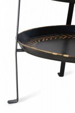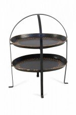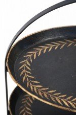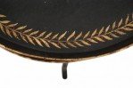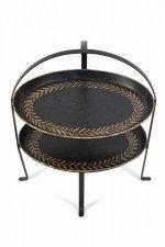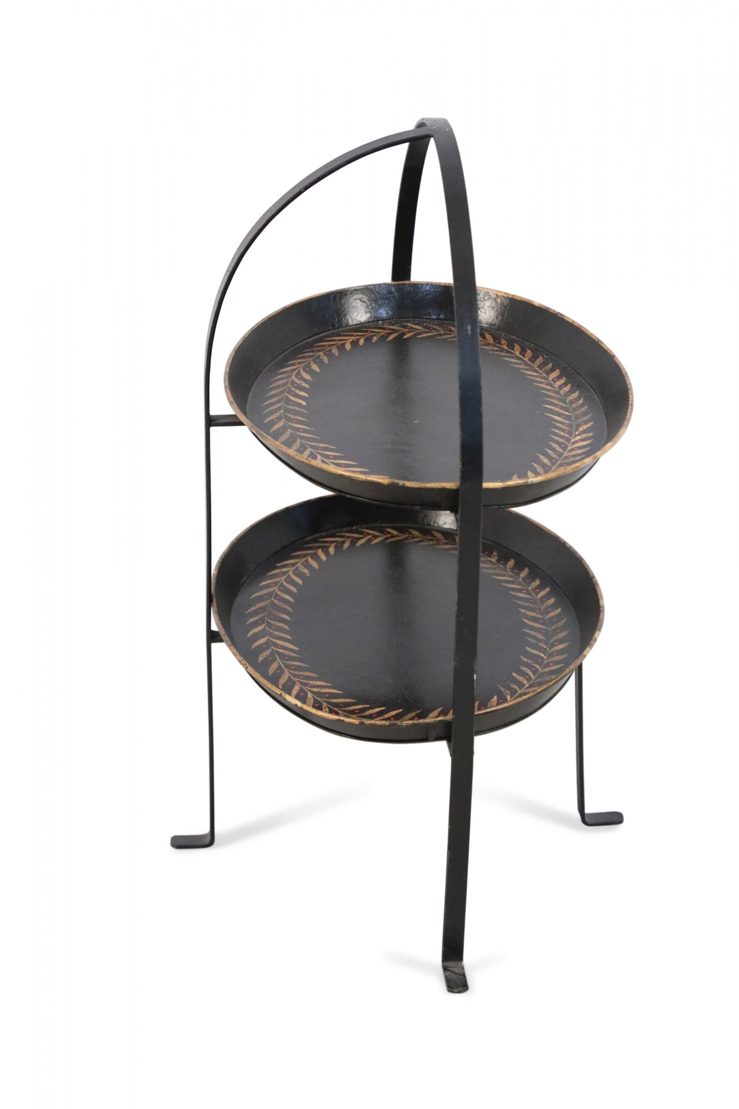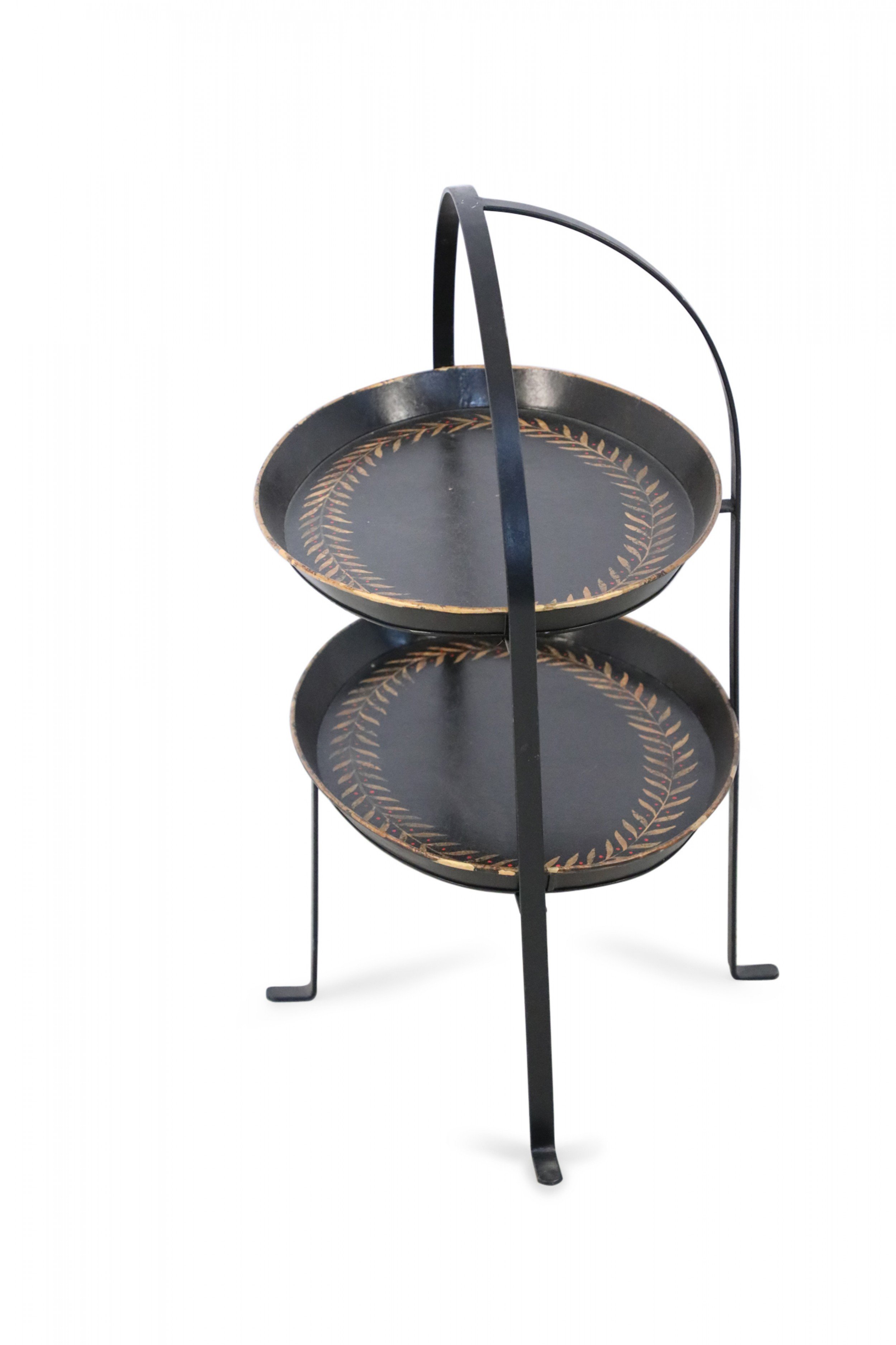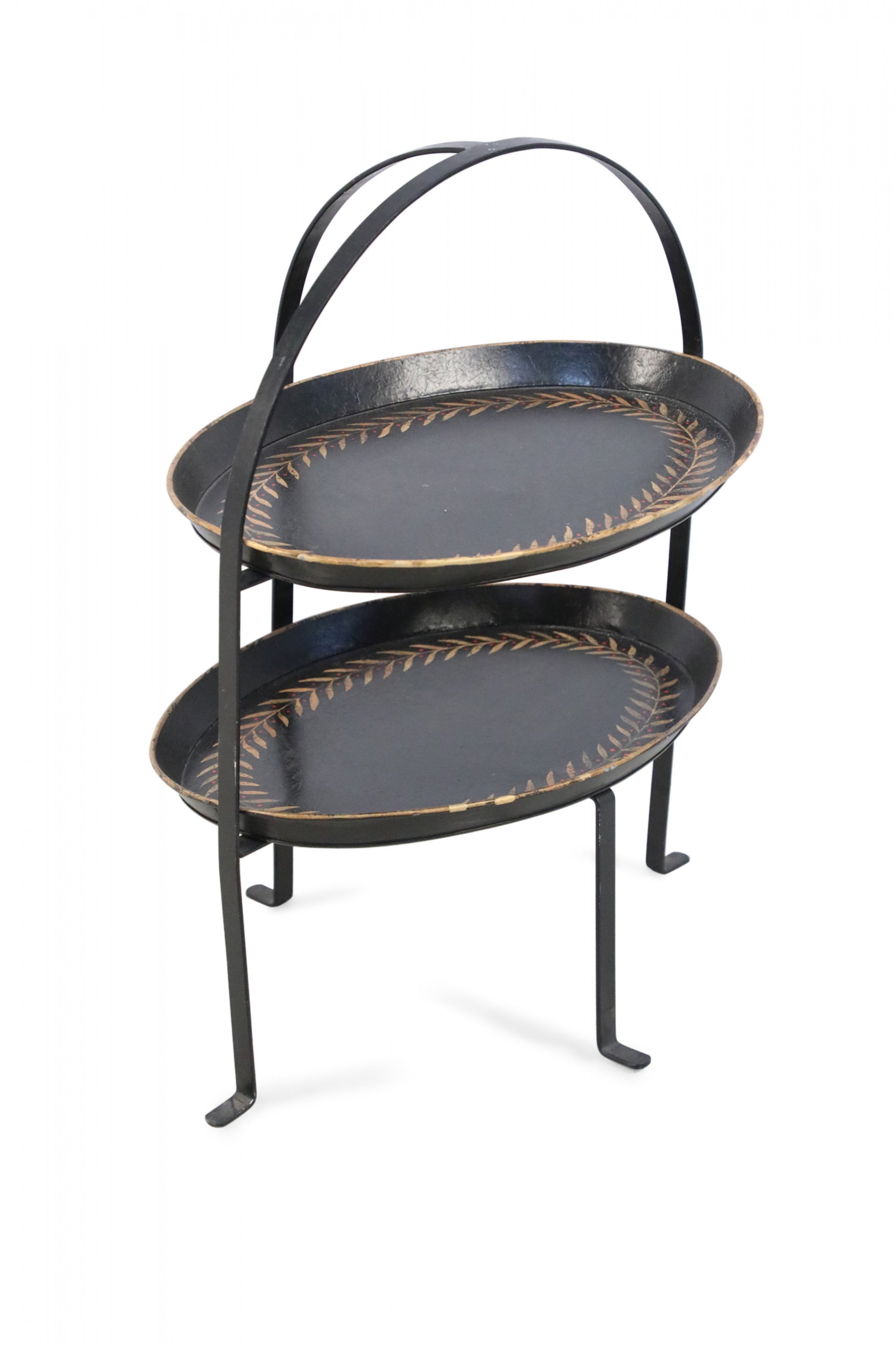 Vintage Chinese black tole, two-tiered server with a black metal frame holding two oval shelves decorated in a garland border of gold leaves with red dots (Available in green: NWL2450).