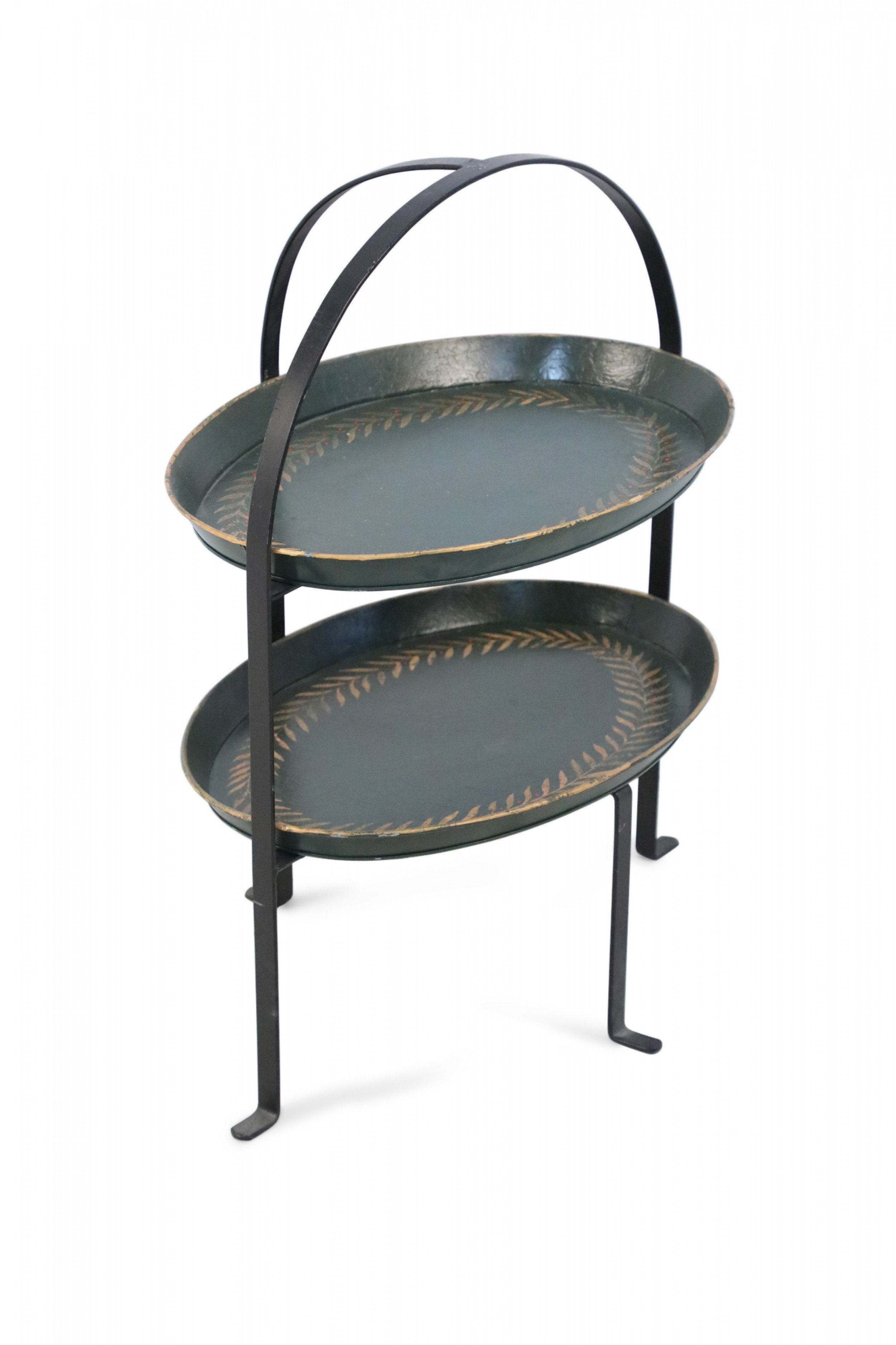 Vintage Chinese dark green tole, two-tiered server with a black metal frame holding two oval shelves decorated in a garland border of gold leaves with red dots (Available in black: NWL2451).