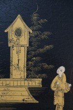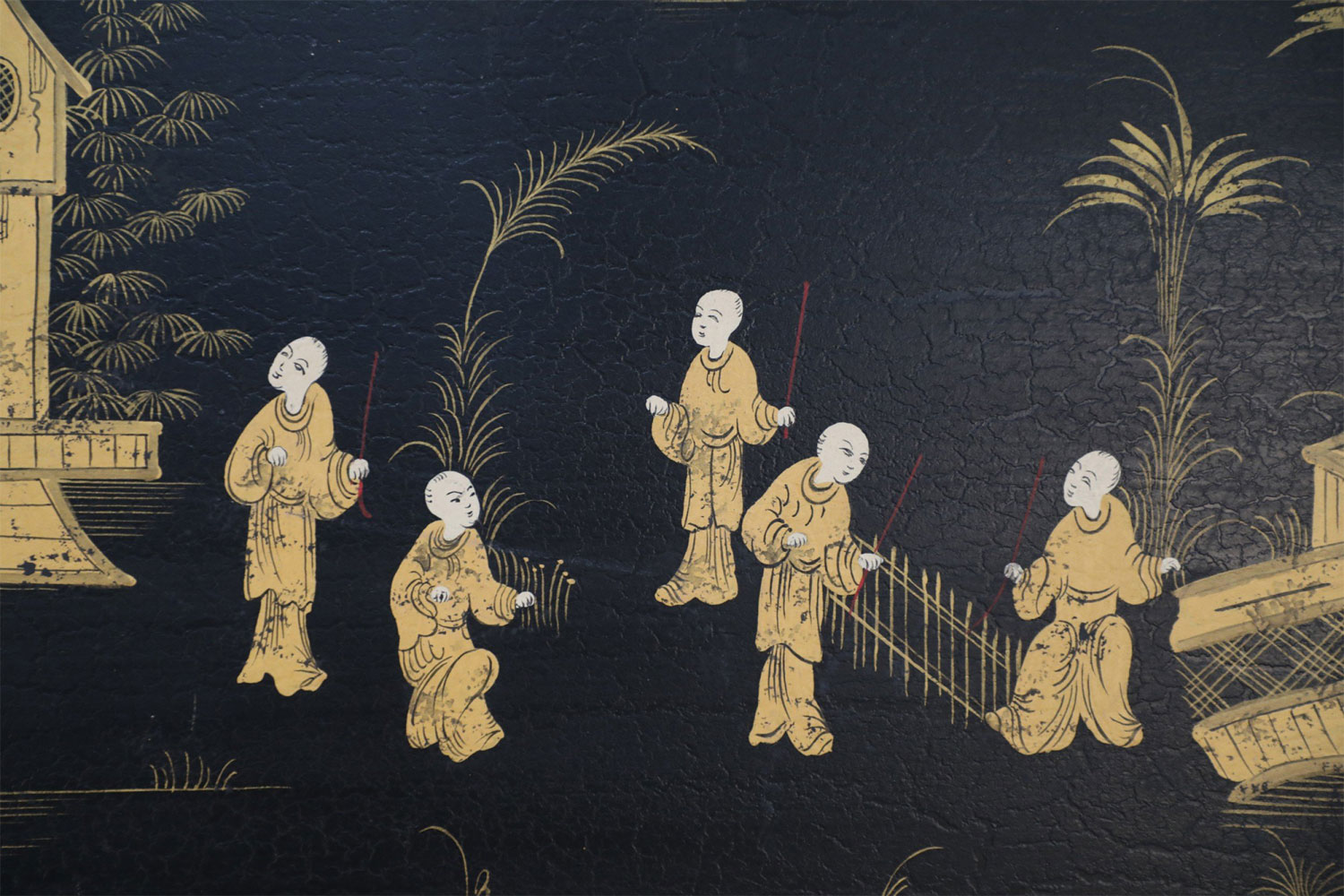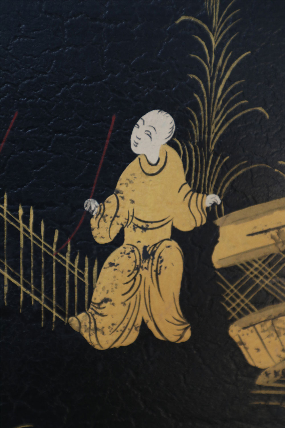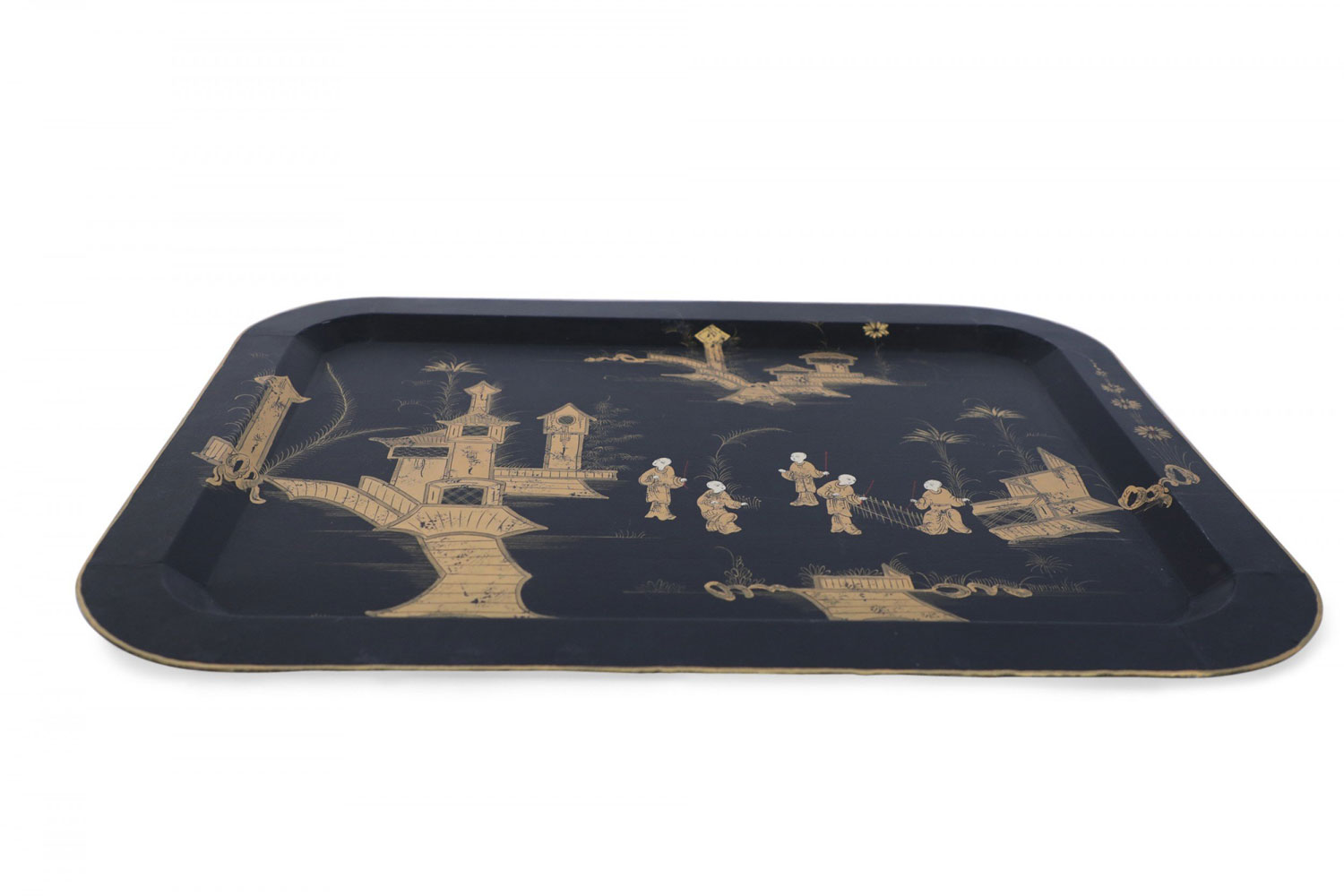 Vintage Chinese rectangular tole serving tray with a painted gold design of a figures in a monestary courtyard on a black background surrounded by a shallow lip with rounded corners.