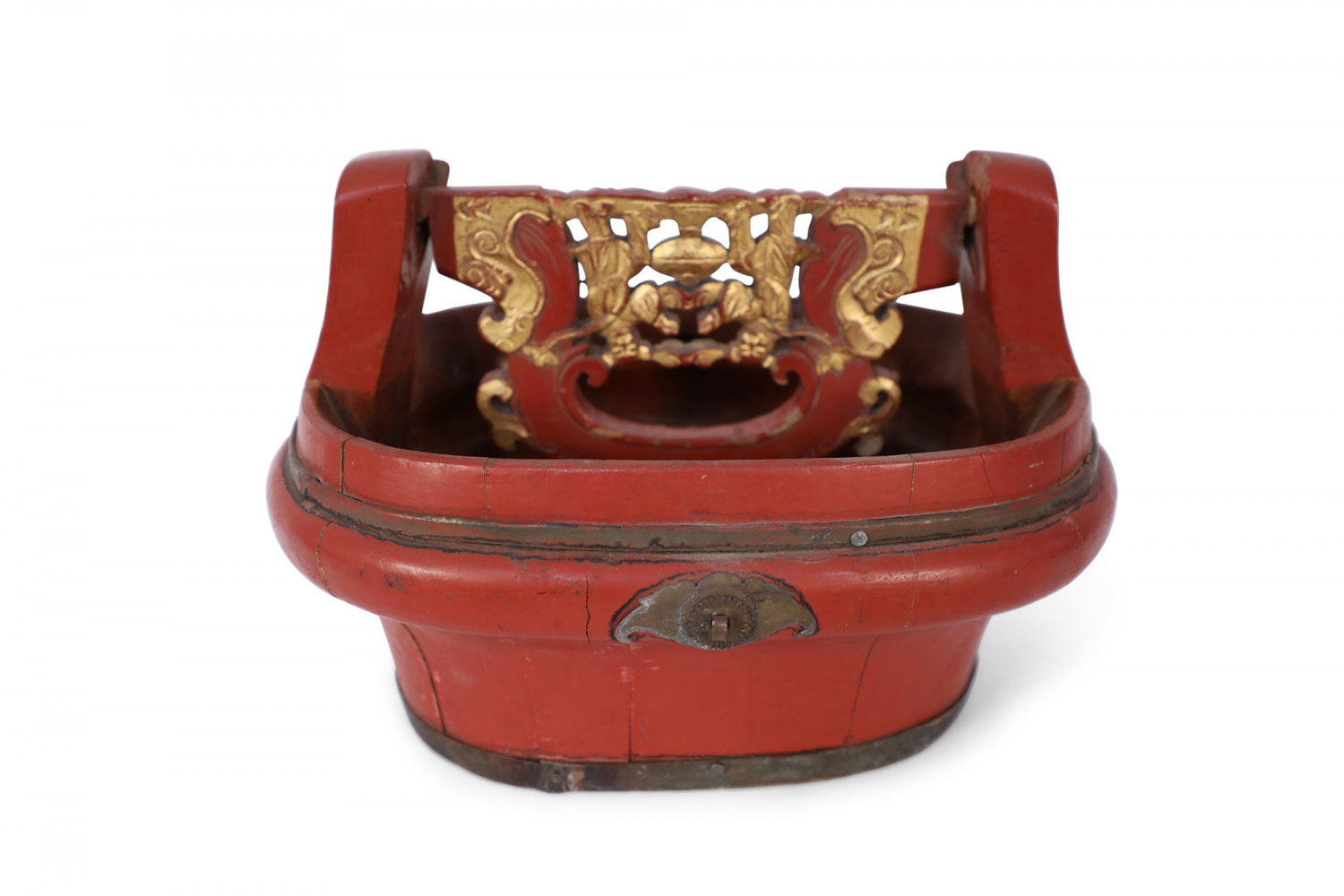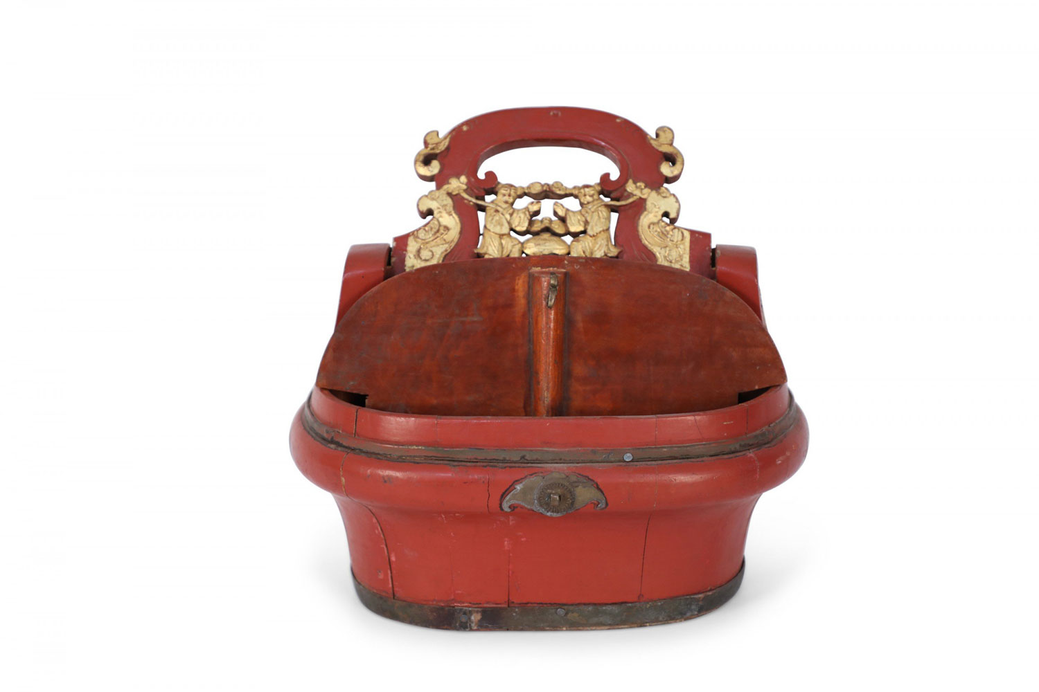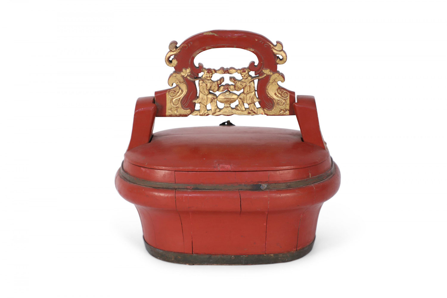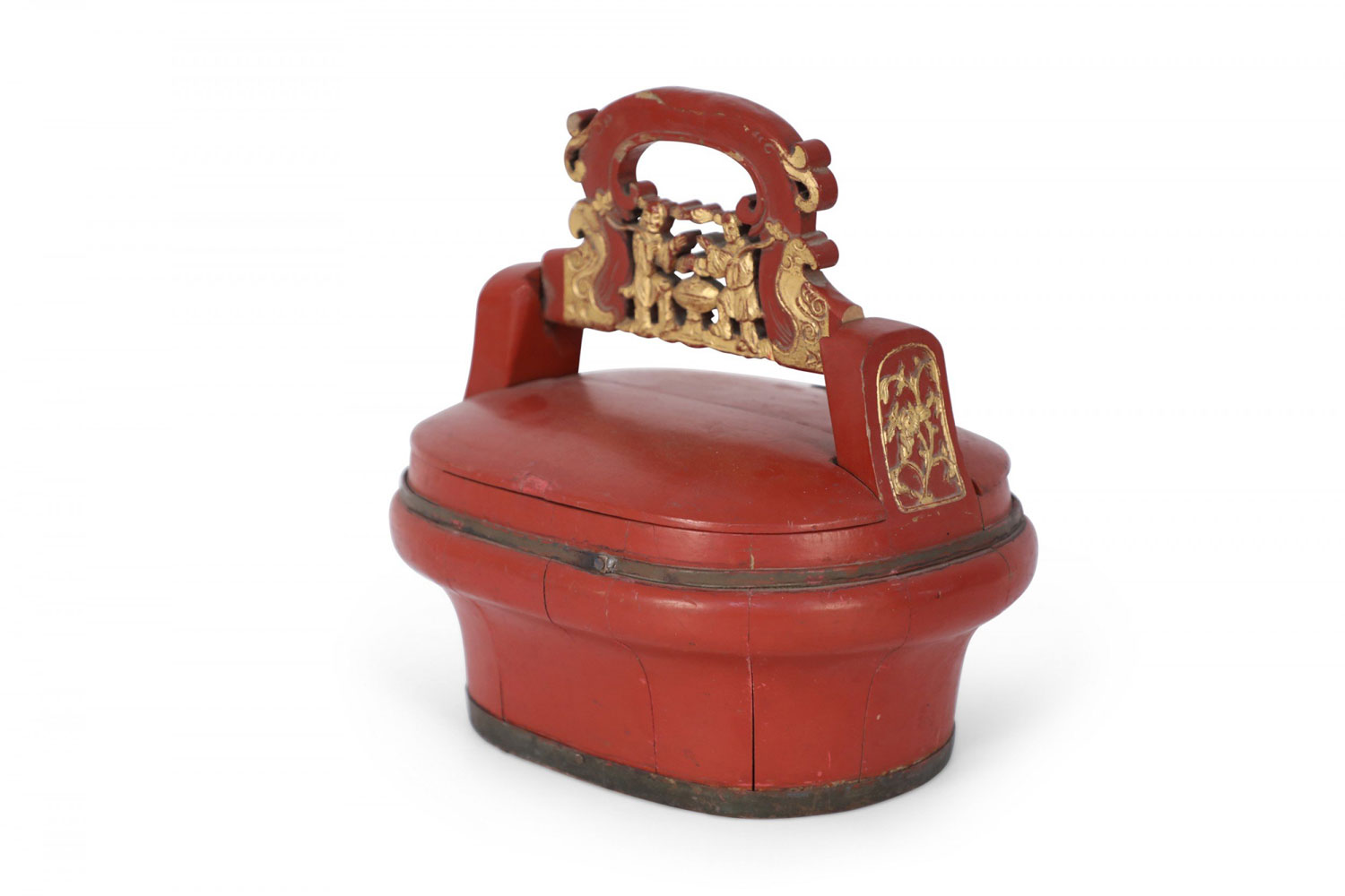 Vintage Chinese red and gold painted decorative wooden box with a metal latch and band around the base and an ornately carved handle featuring a scenic image of two men.