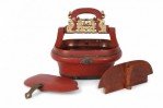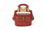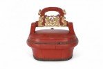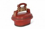 Vintage Chinese red and gold painted decorative wooden box with a metal latch and band around the base and an ornately carved handle featuring a scenic image of two men..