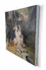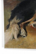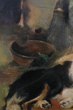 English Victorian style (20th Century) oil painting of a dog reclining alongside a lamb in a barn filled with farm implements on rectangular, unframed canvas (Similar copies of same painting with minor variance: NWL2238A, NWL2238C)..