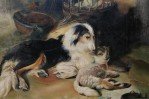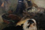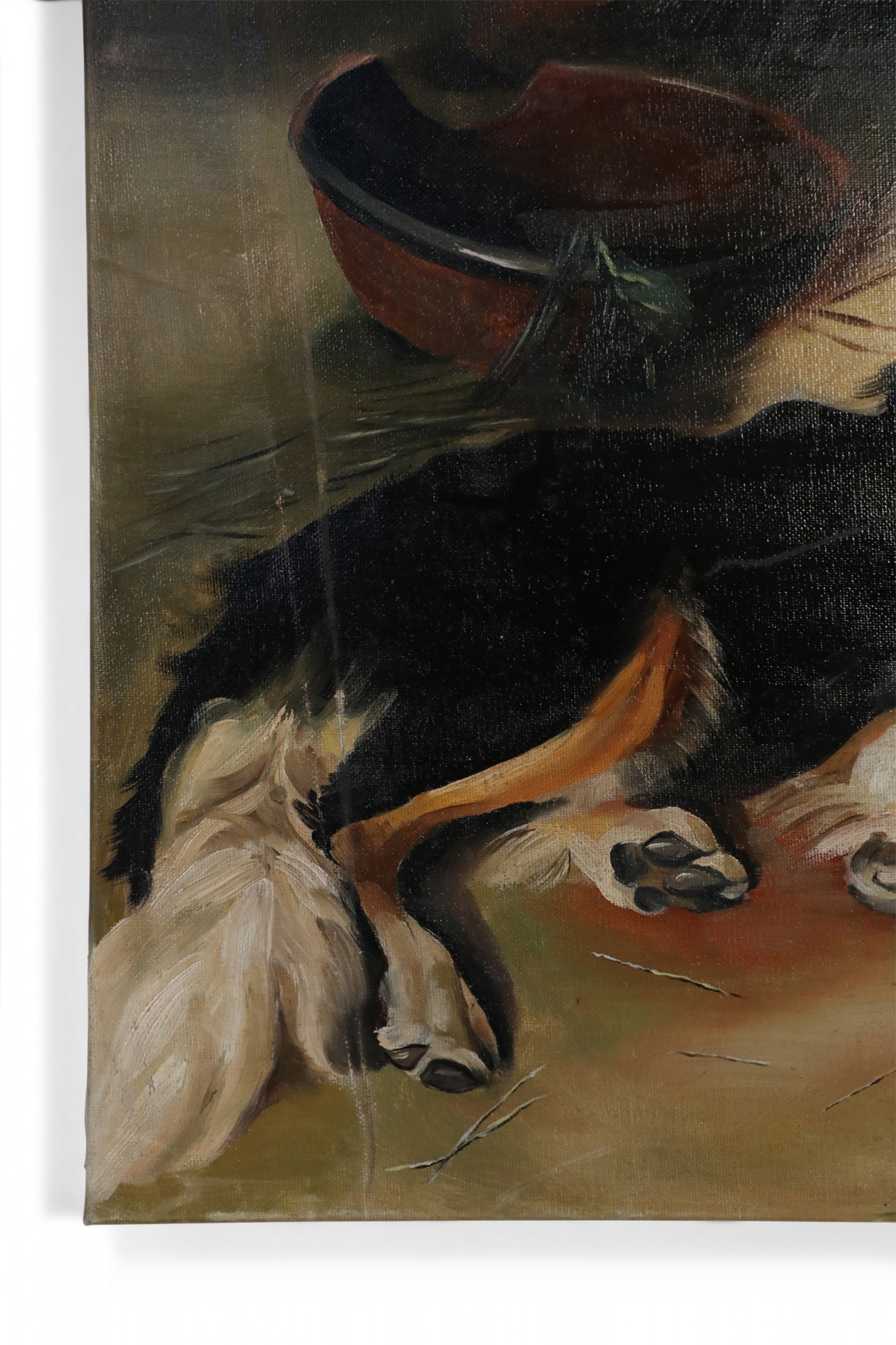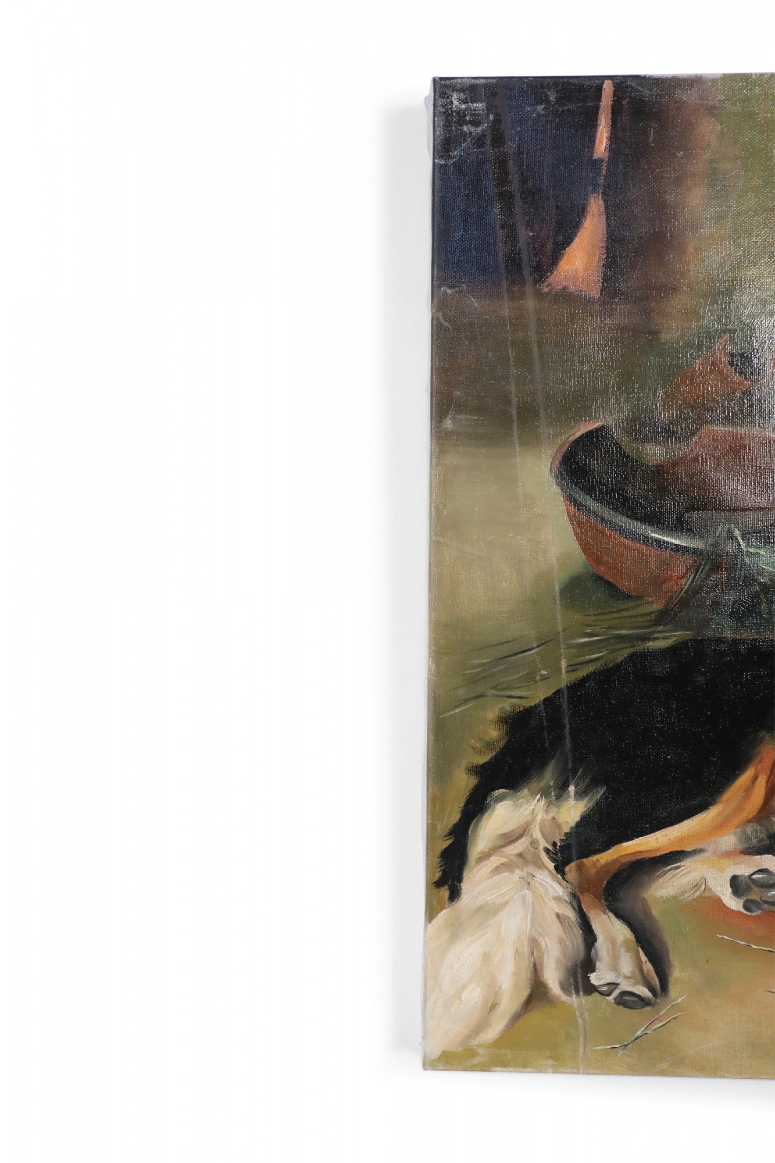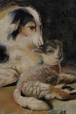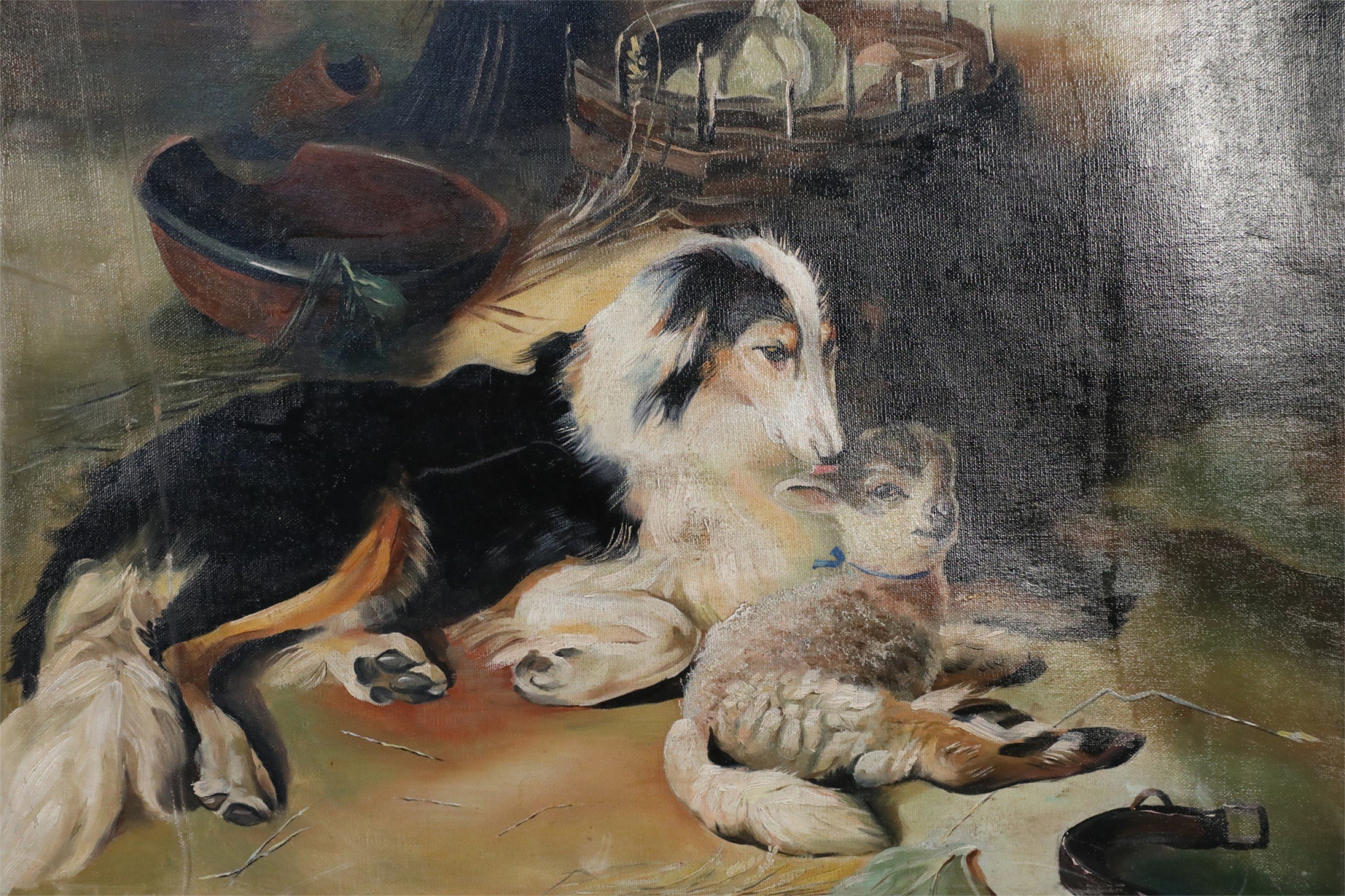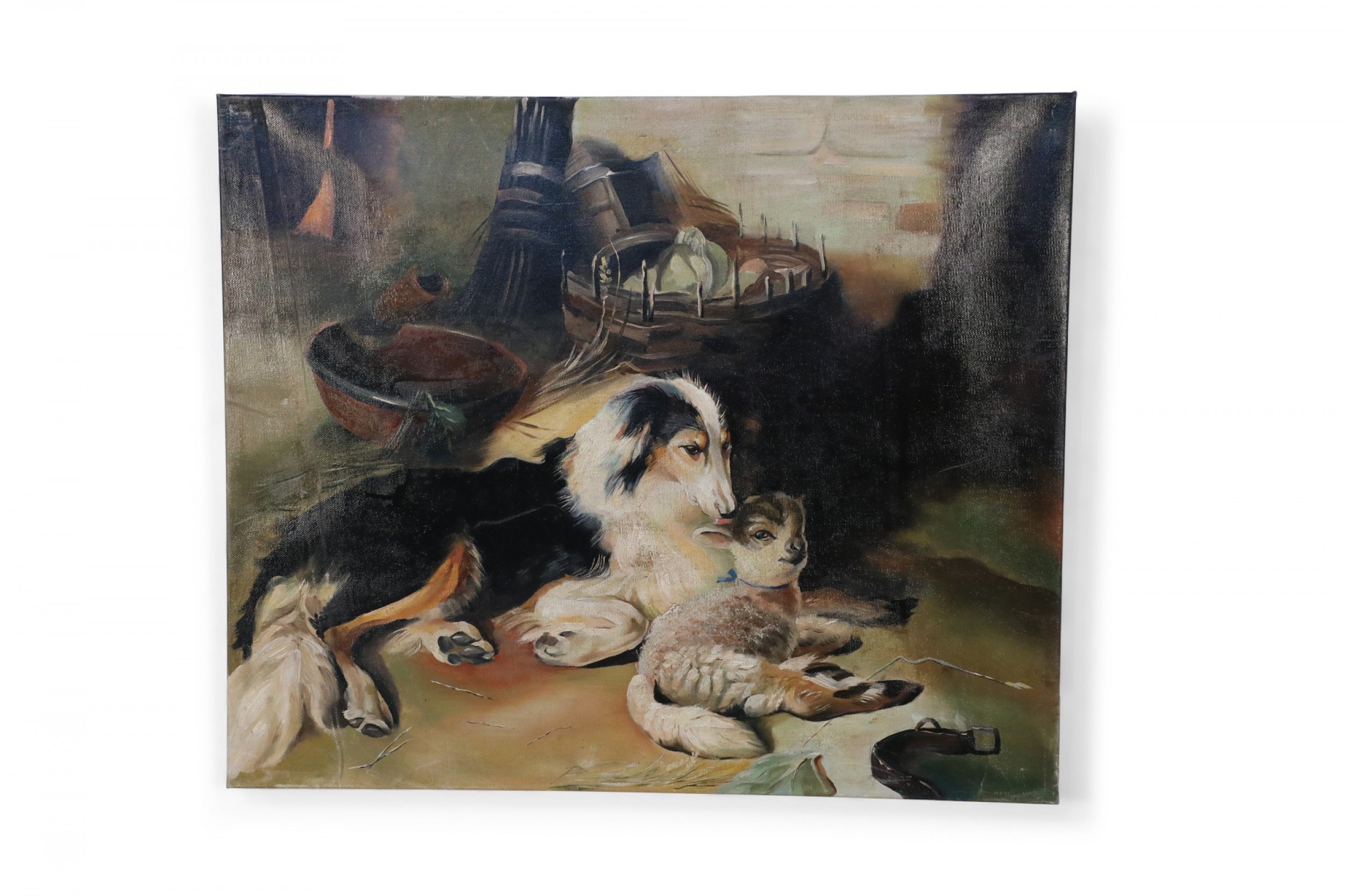 English Victorian style lamb in a barn filled with farm implements on rectangular, unframed canvas (Similar copies of same painting with minor variance: NWL2238A, NWL2238B)..