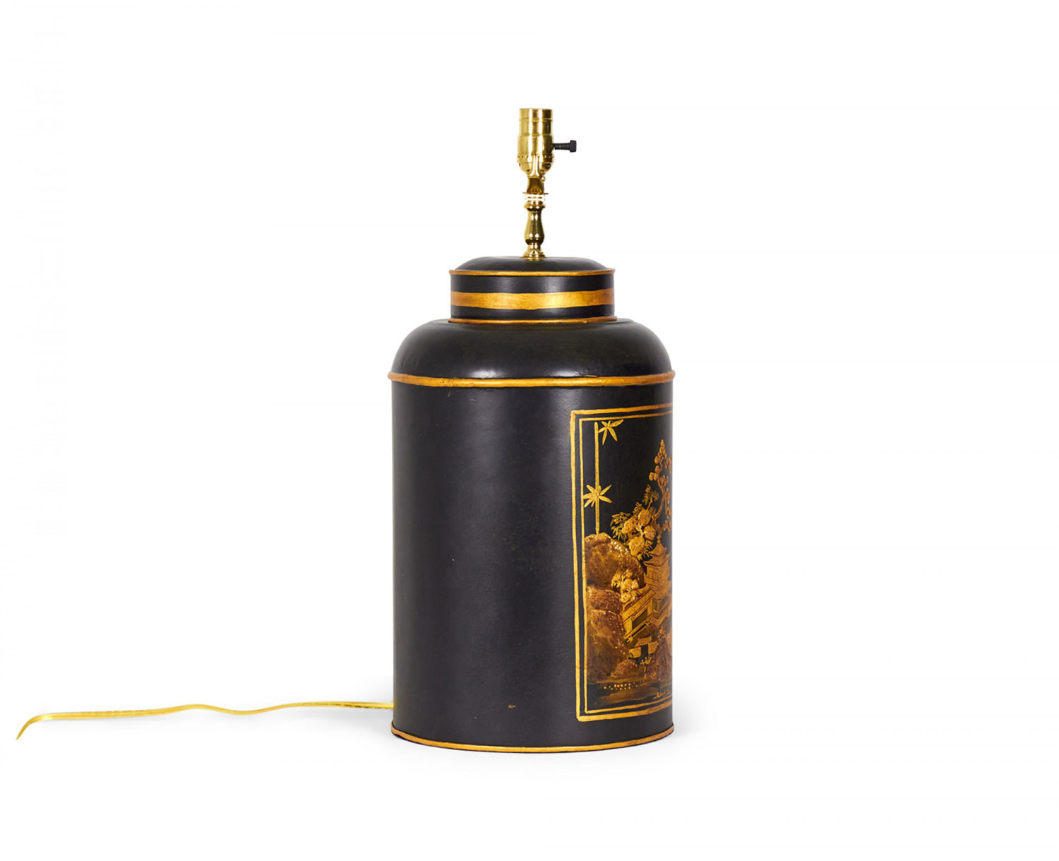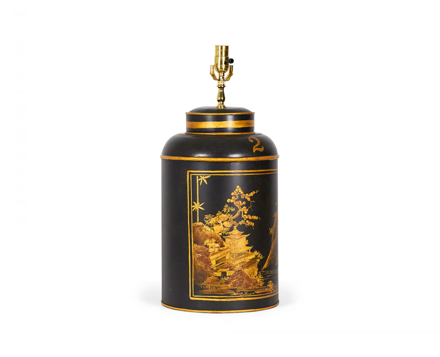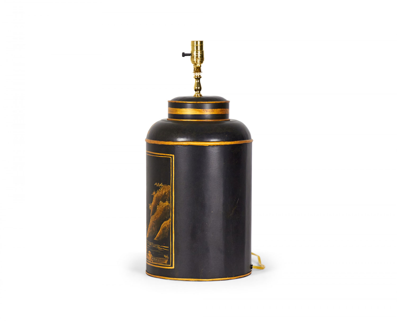 Vintage English Chinoiserie Black and Gold Landscape Hand-Painted Tole Tea Caddy Table Lamp