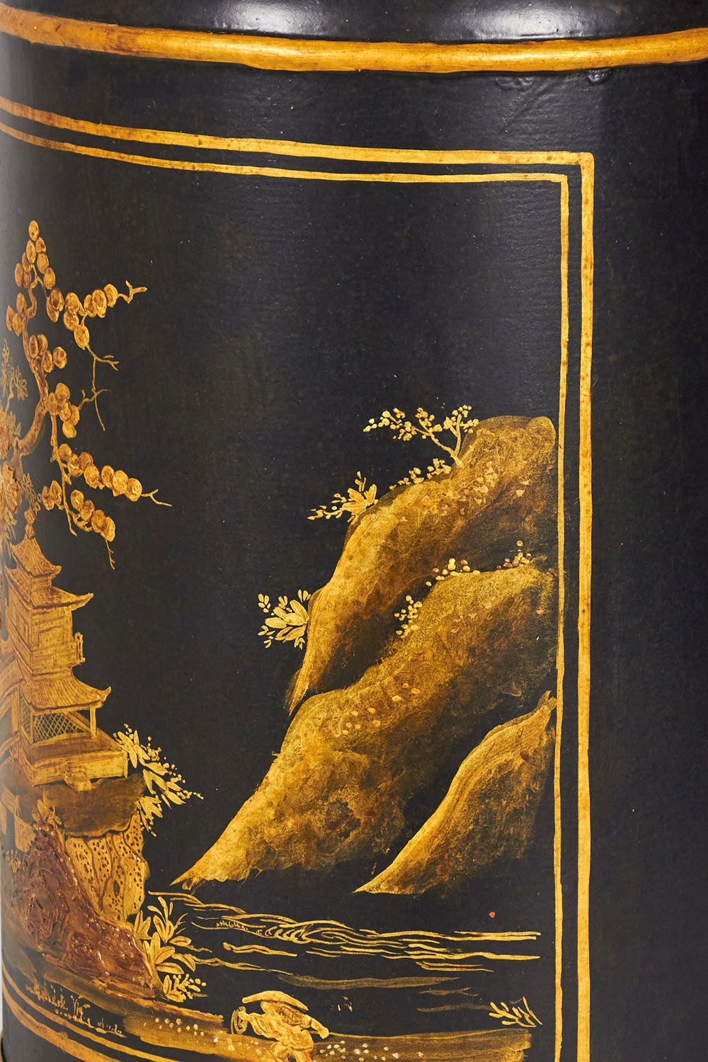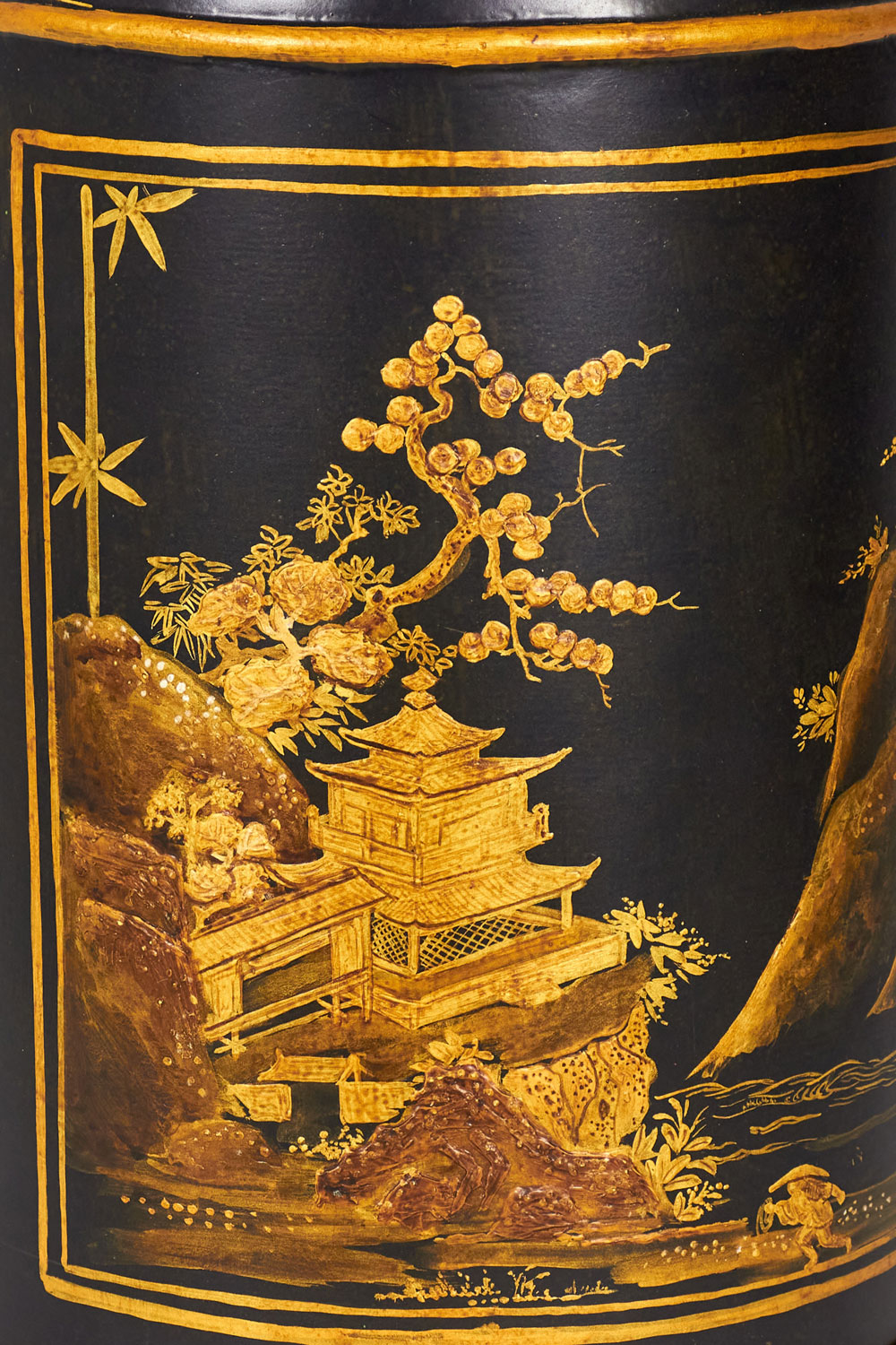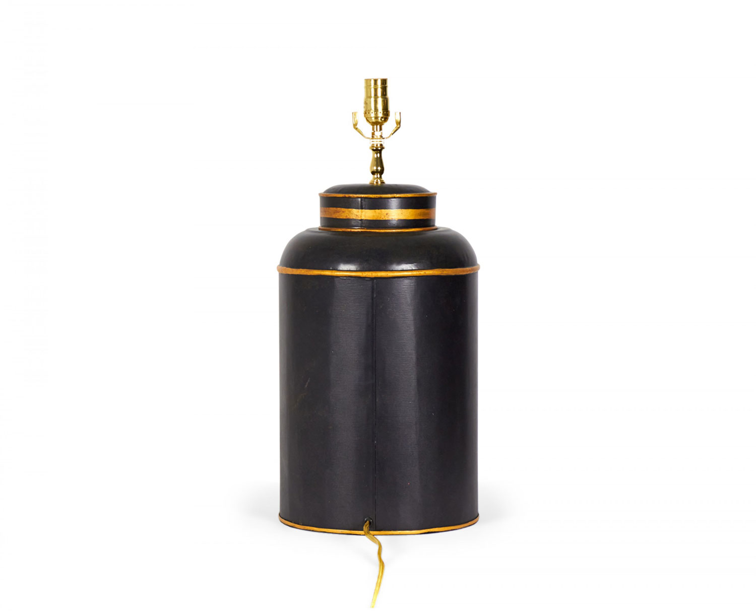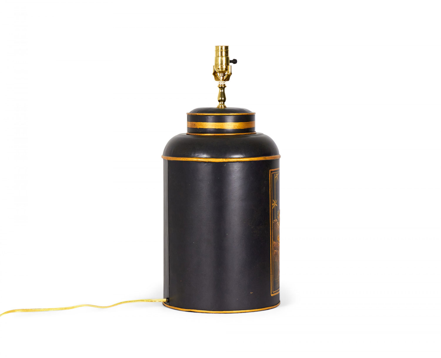Vintage English Chinoiserie Black and Gold Landscape Hand-Painted Tole Tea Caddy Table Lamp