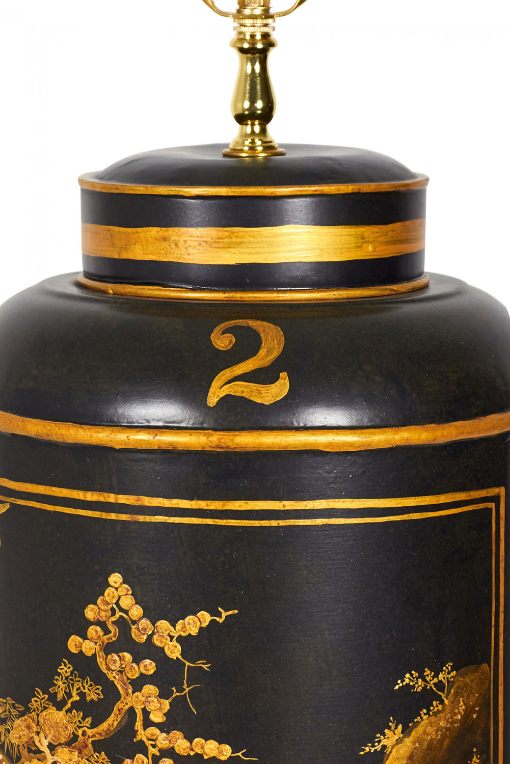 Vintage English export Chinoiserie-style table lamp made of a tole tea caddy mounted as a lamp with brass hardware, hand painted with gold a gold mountain landscape scene on one side against a black background, with painted gold trim and a numeral 2 on the upper rim. (Similar lamp: NWL2724)