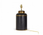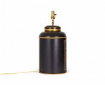 Vintage English export Chinoiserie-style table lamp made of a tole tea caddy mounted as a lamp with brass hardware, hand painted with gold a gold mountain landscape scene on one side against a black background, with painted gold trim and a numeral 2 on the upper rim. (Similar lamp: NWL2724).