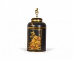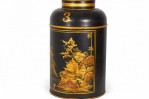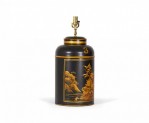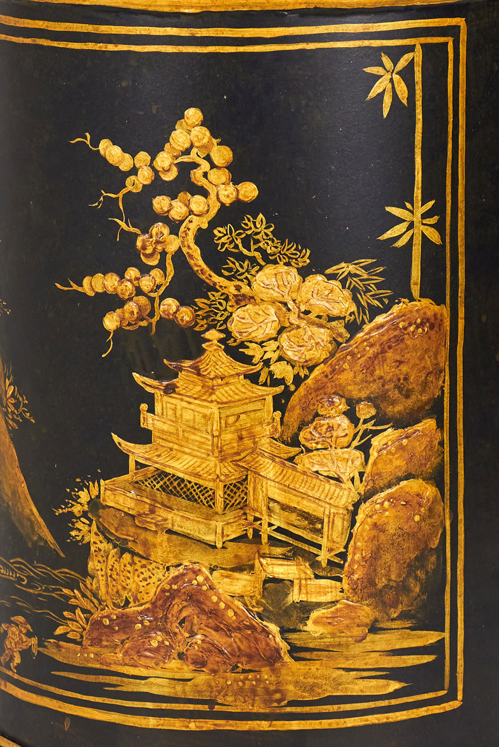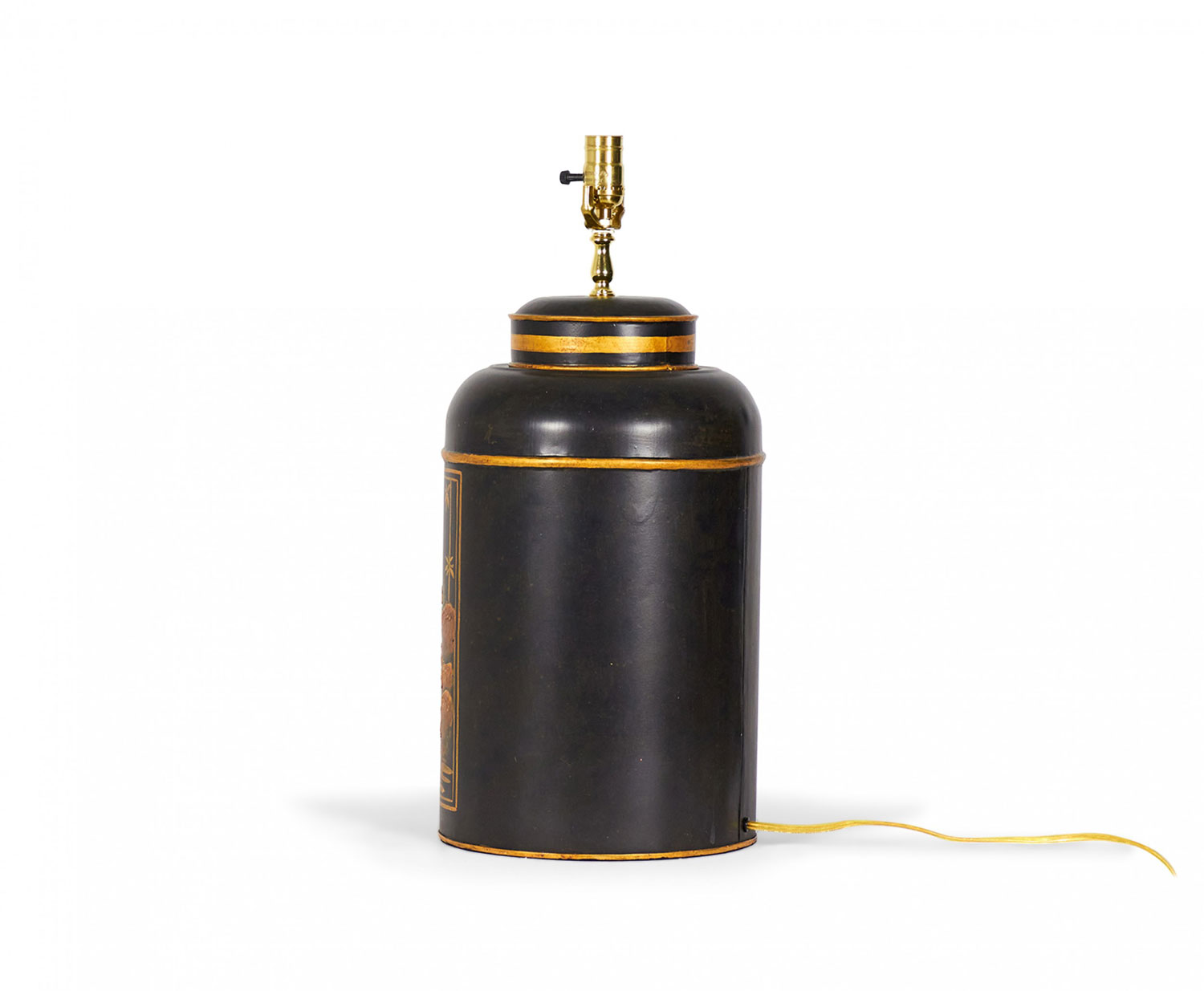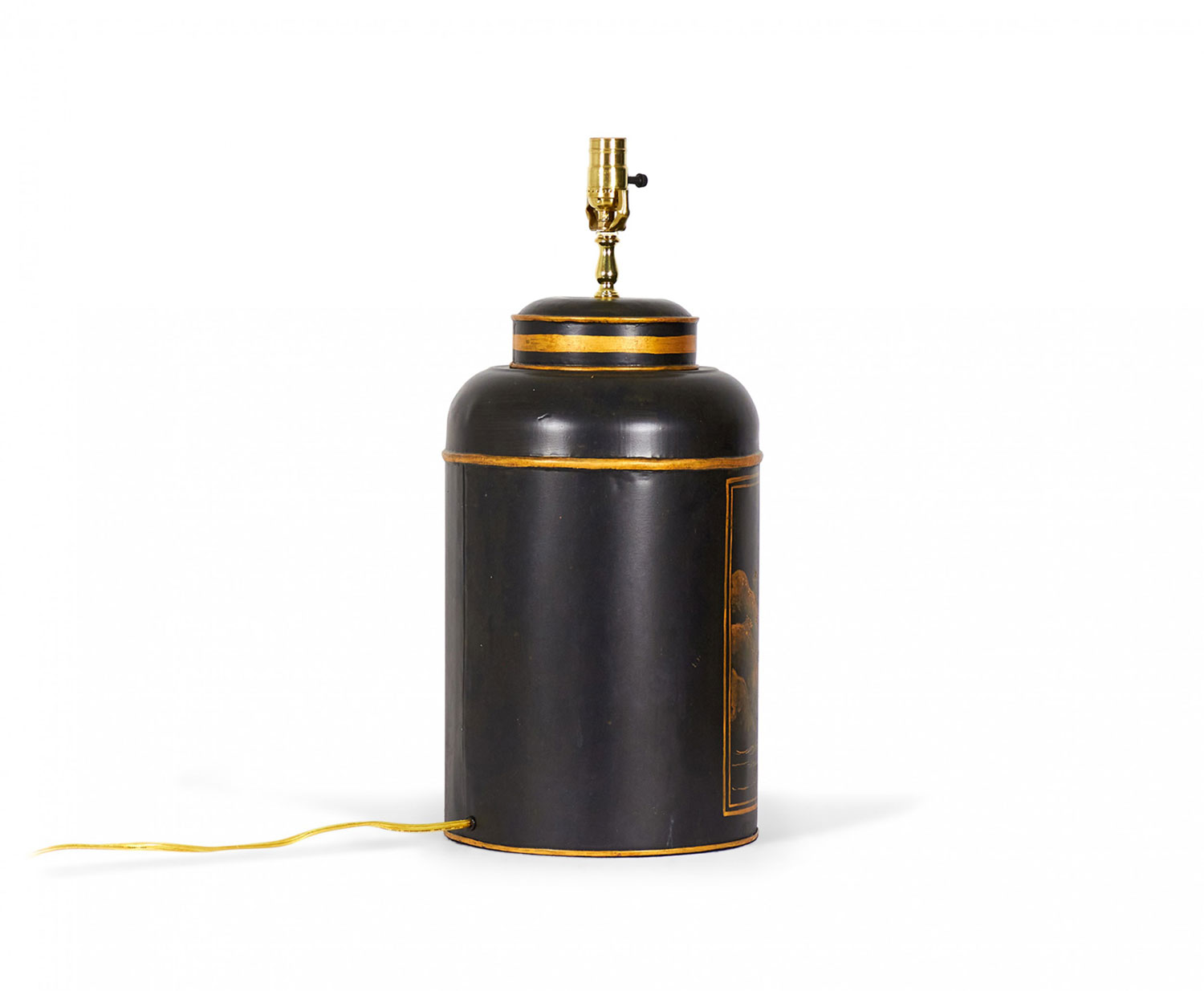 Vintage English Chinoiserie Black and Gold Landscape Hand-Painted Tole Tea Caddy Table Lamp
