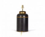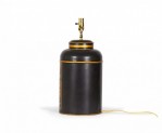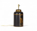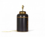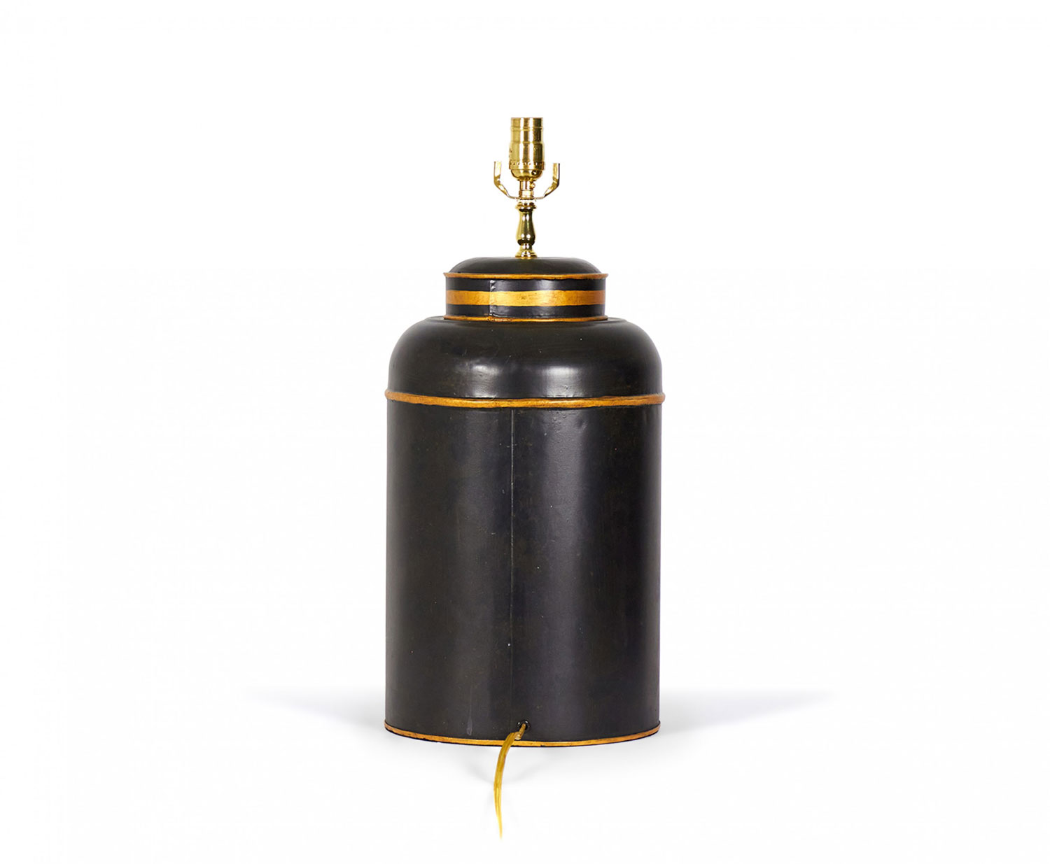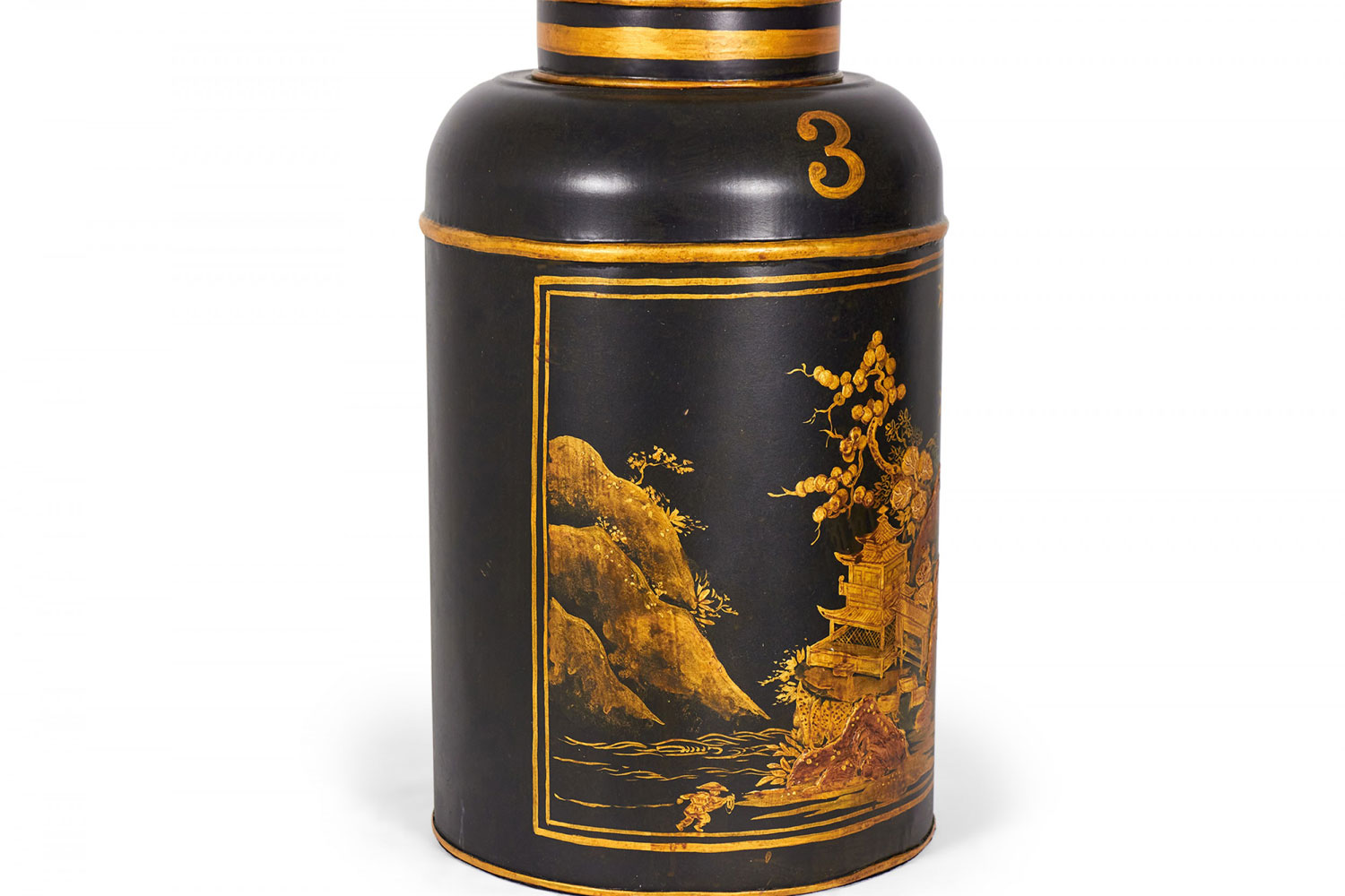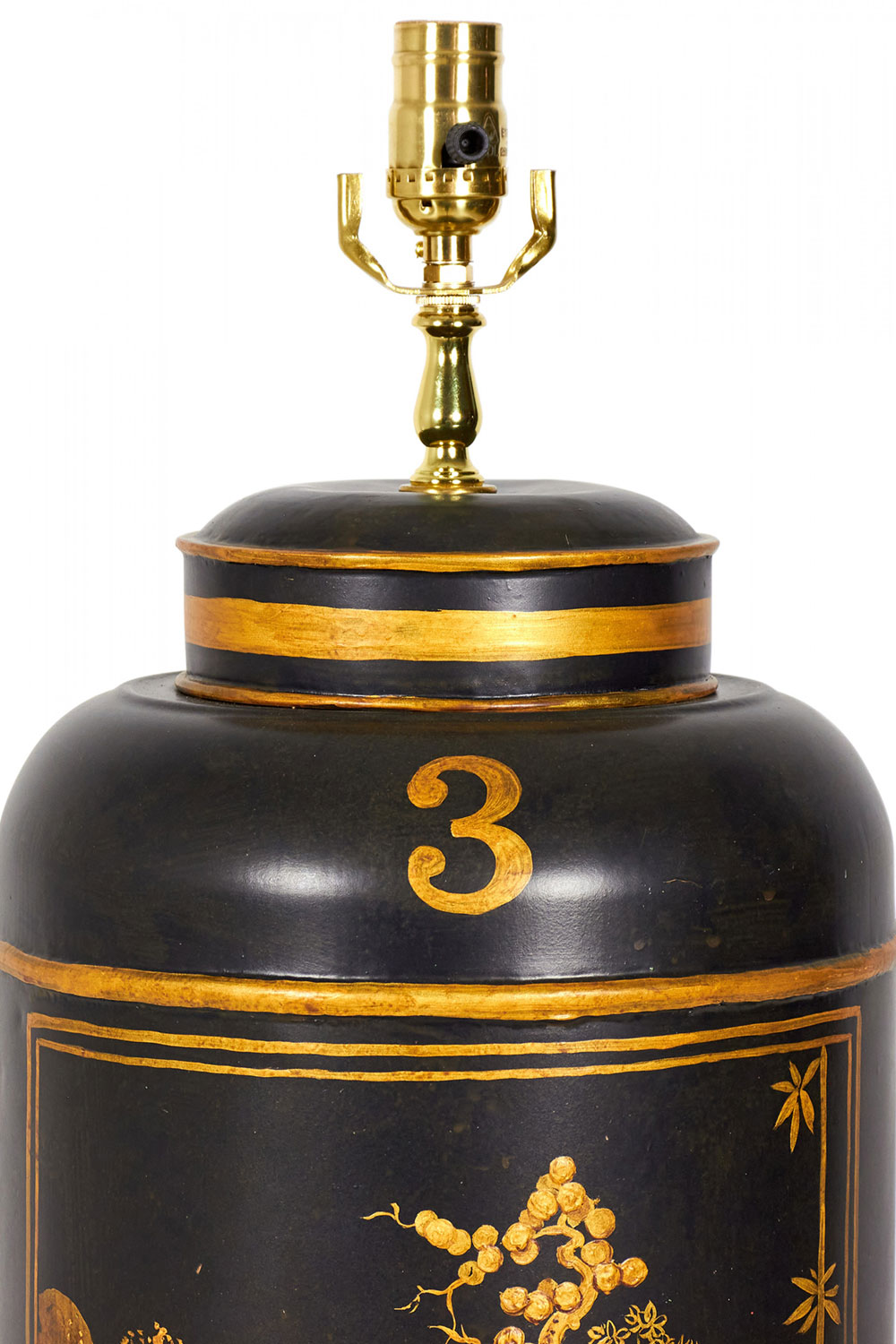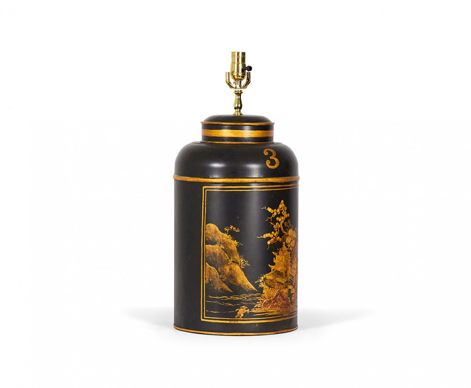 Vintage English export Chinoiserie-style table lamp made of a tole tea caddy mounted as a lamp with brass hardware, hand painted with gold a gold mountain landscape scene on one side against a black background, with painted gold trim and a numeral 3 on the upper rim. (Similar lamp: NWL2706).