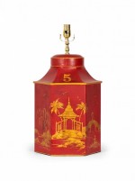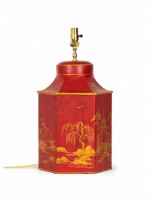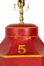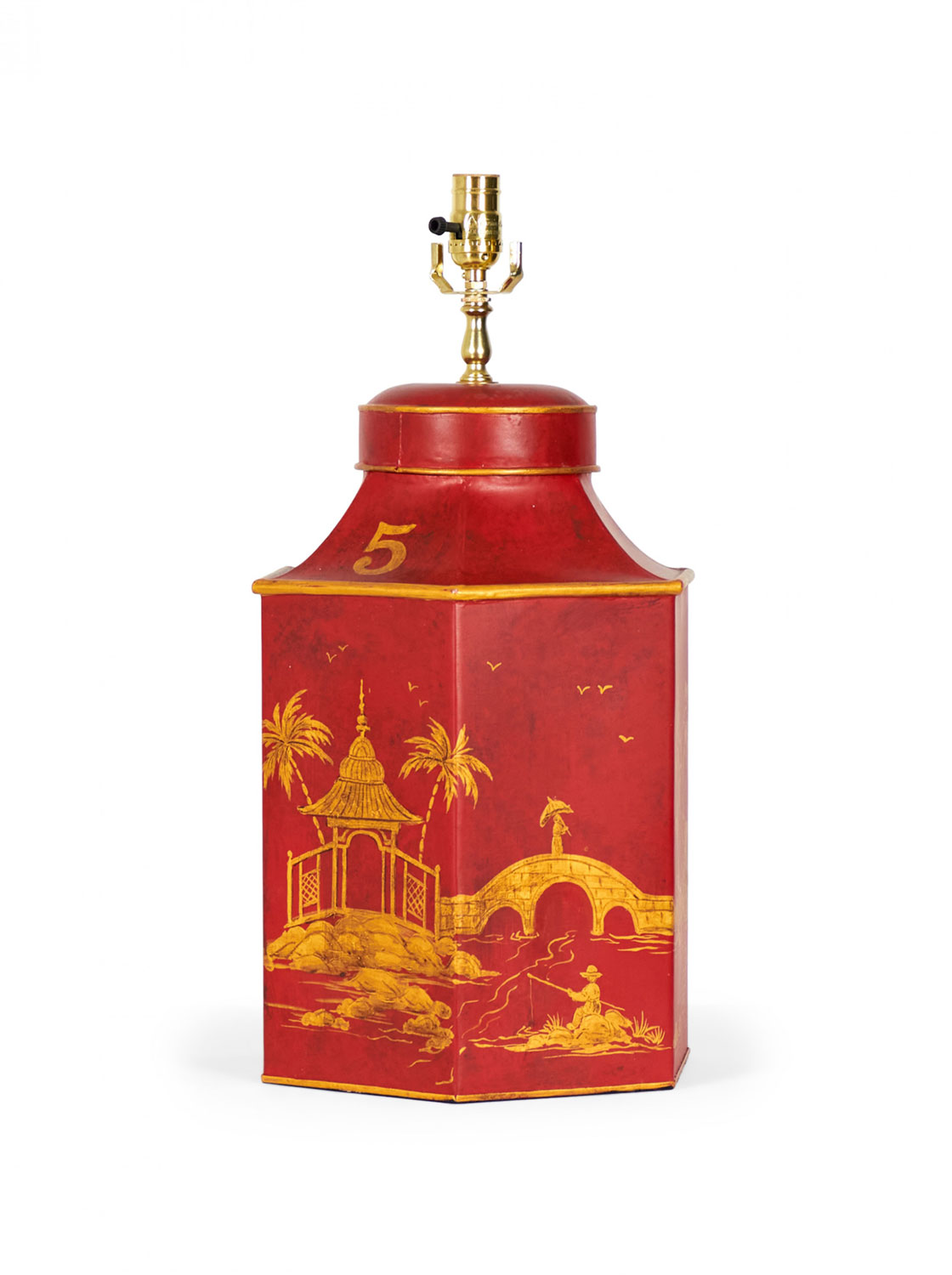 Vintage English export Chinoiserie-style table lamp made of a hexagonal tole tea caddy mounted as a lamp with brass hardware, hand painted with a landscape and garden scene in gold against a red background with gold painted trim and a numeral 5 on the top edge. (Similar lamp: NWL2723)