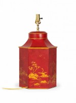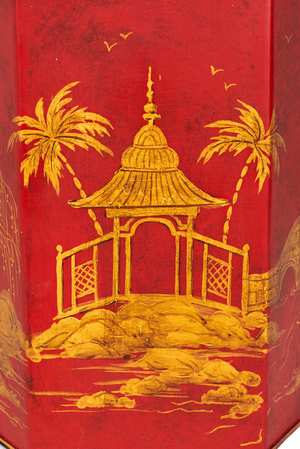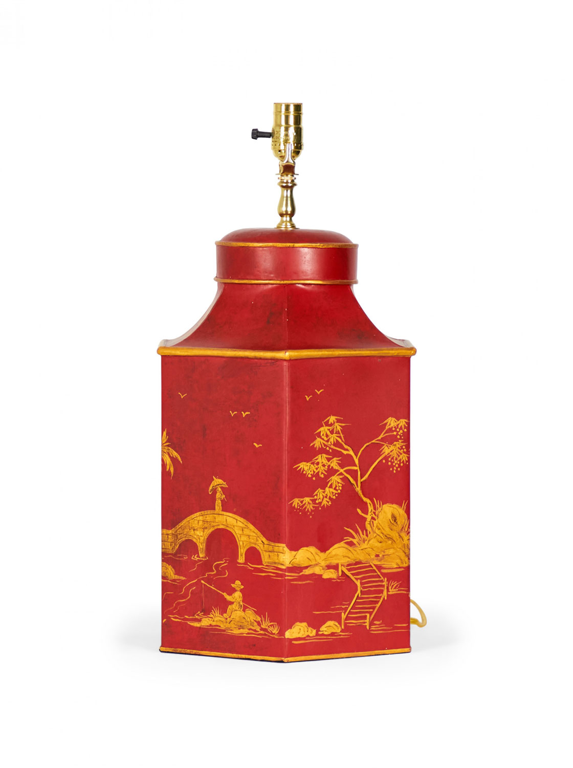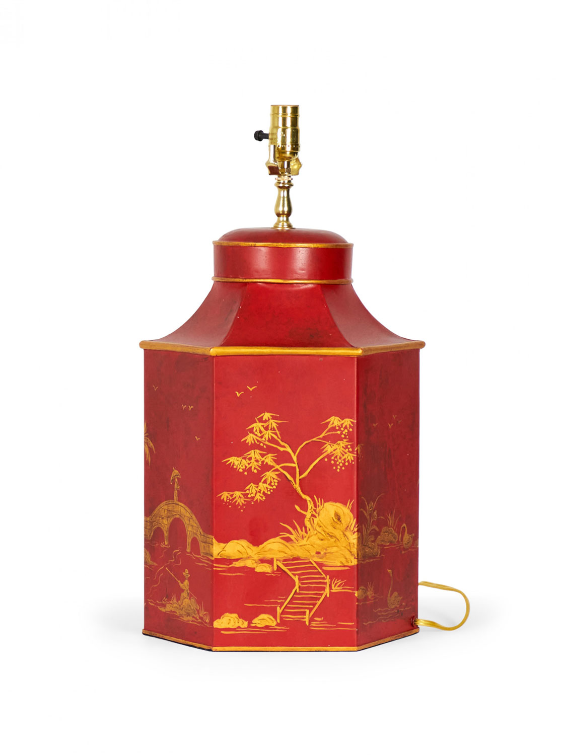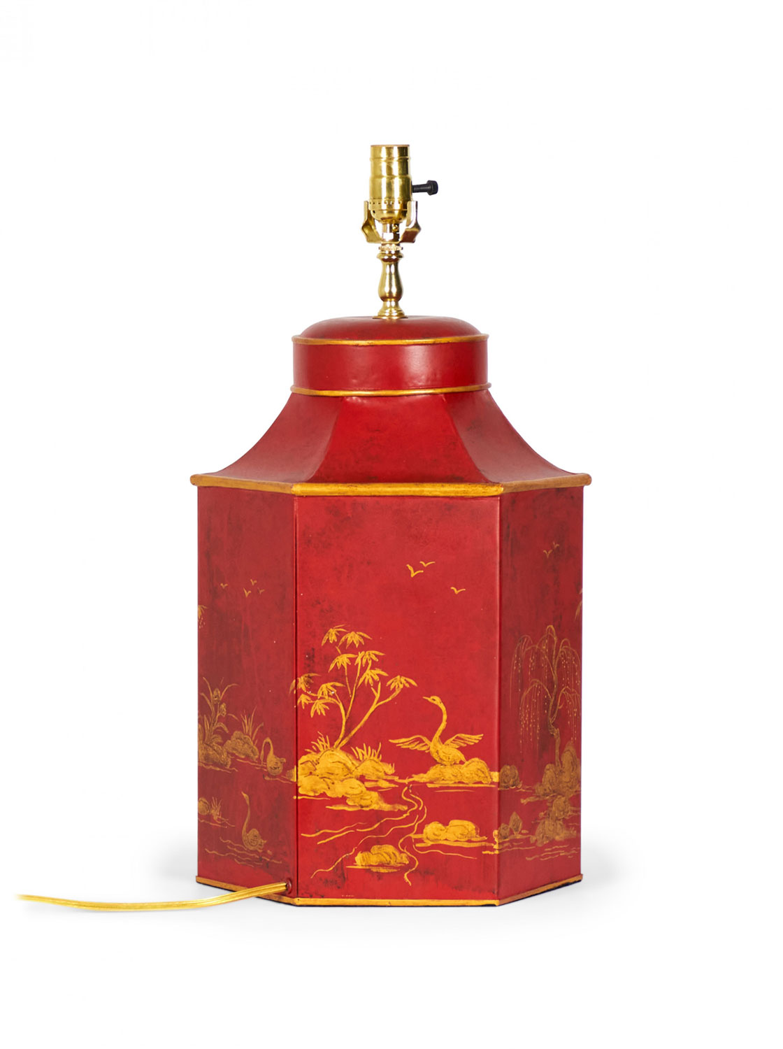 Vintage English Chinoiserie Red and Gold Hexagonal Hand-Painted Tole Tea Caddy Table Lamp