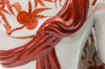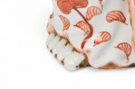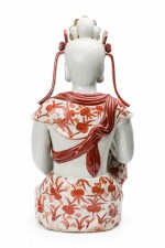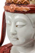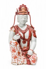 Vintage Japanese porcelain statue depicting a seated Bodhisattva, with hand painted orange detail..