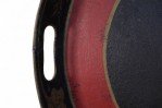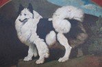 Vintage oval tole serving tray with a central portrait of a fluffy black and white dog in an outdoor setting surrounded by a dark red border with a shallow lip with gold and black painted design with two cut out handles. (Similar trays: NWL2594-NWL2597).