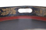 Vintage oval tole serving tray with a central portrait of a fluffy black and white dog in an outdoor setting surrounded by a dark red border with a shallow lip with gold and black painted design with two cut out handles. (Similar trays: NWL2594-NWL2597)