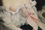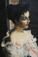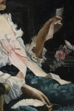 English Victorian style (20th Century) oil painting of a Victorian woman engaged in correspondence, seen with a feather quill in hand and seated at a desk, with romantic flourishes of florals and an oversized pink bow at the front of her dress. Painted on rectangular unframed canvas (Similar copy of painting with minor variations: NWL2246B)..