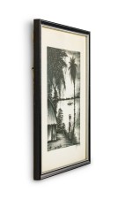 Vintage Asian Framed Ink Drawing of a Fishing Village Scene