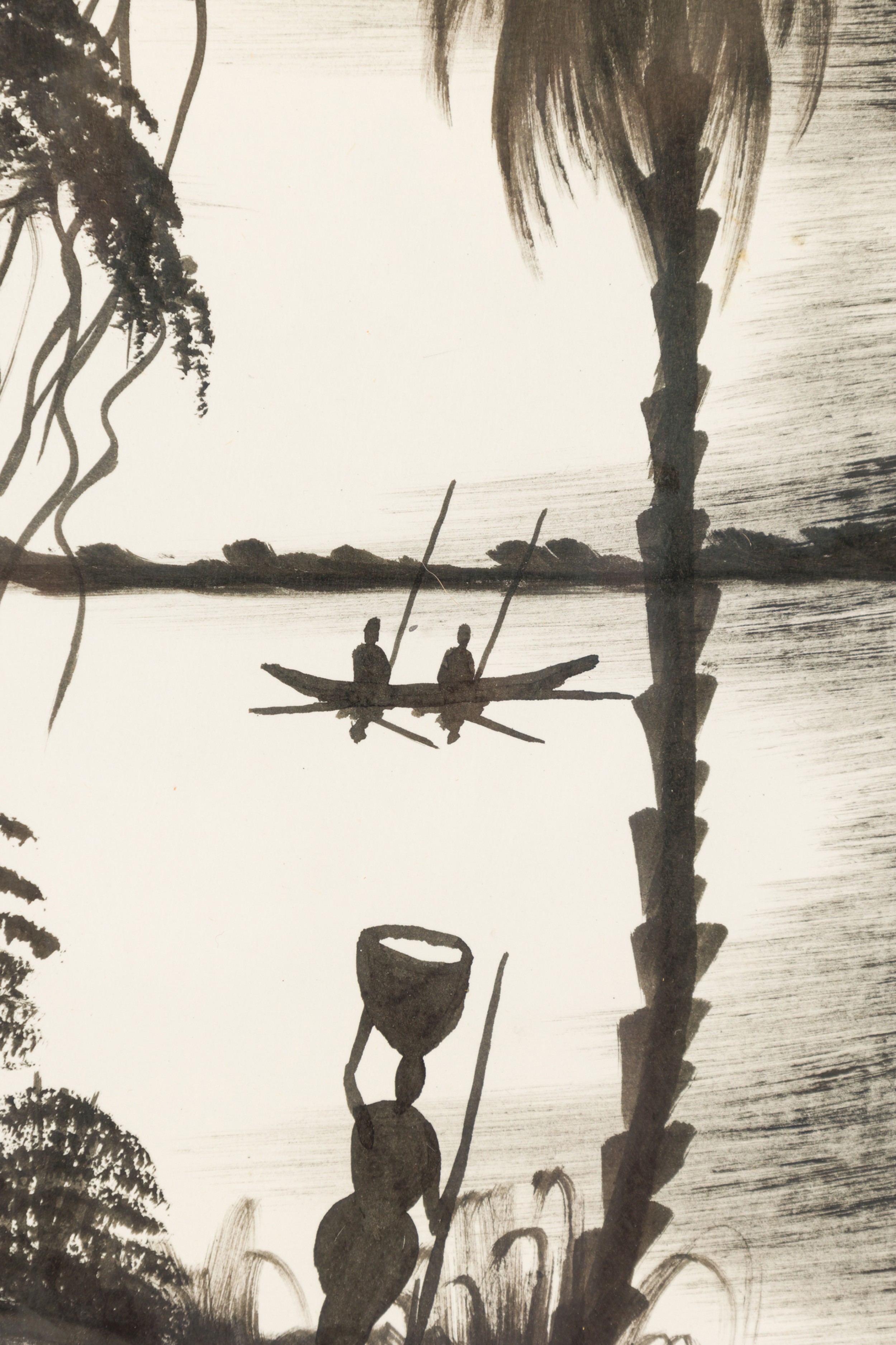 Vintage Asian Black Framed India Ink Drawings of a Fishing Village Scene with a boat having 2 figures and a hut (signed) (similar items: NWL7173 A, B)