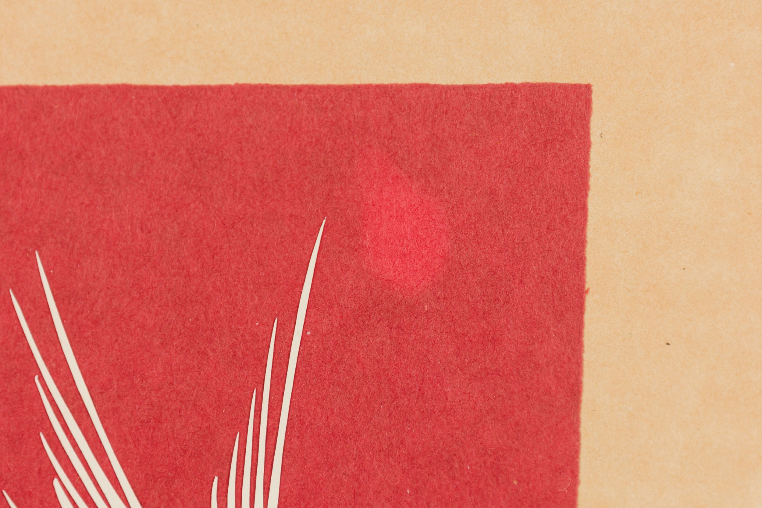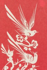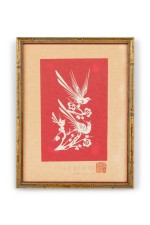Vintage Chinese gold framed red and white paper cut of two birds in a floral scene (signed).