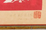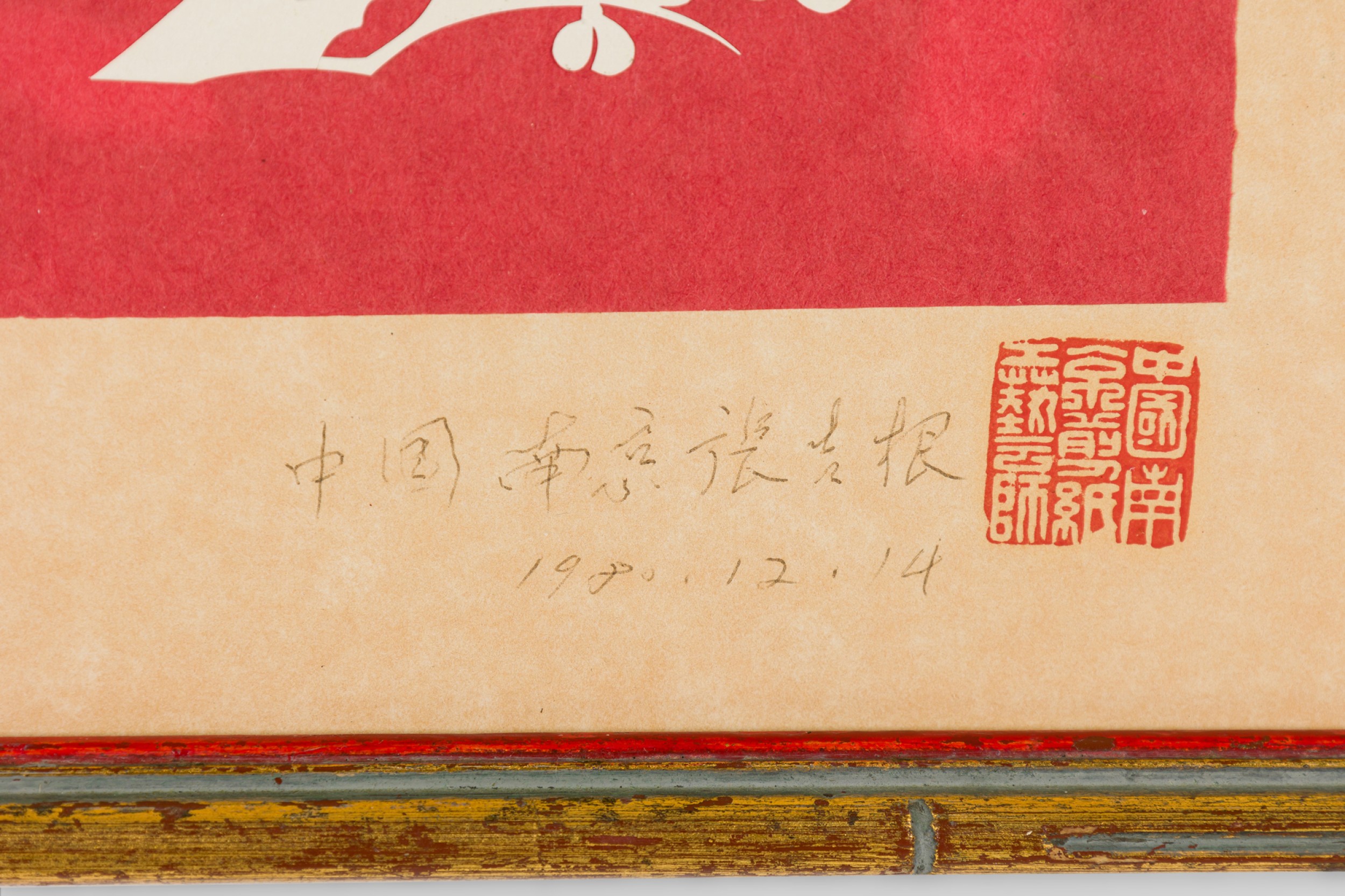 Vintage Chinese gold framed red and white paper cut of two birds in a floral scene (signed)