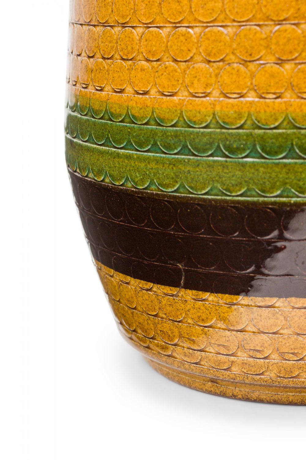 West German Mid-Century cylindrical ceramic vase with a gold, green, and blue horizontally striped glaze and faintly incised geometric banded pattern. (mark on bottom, WEST GERMANY 635-25)