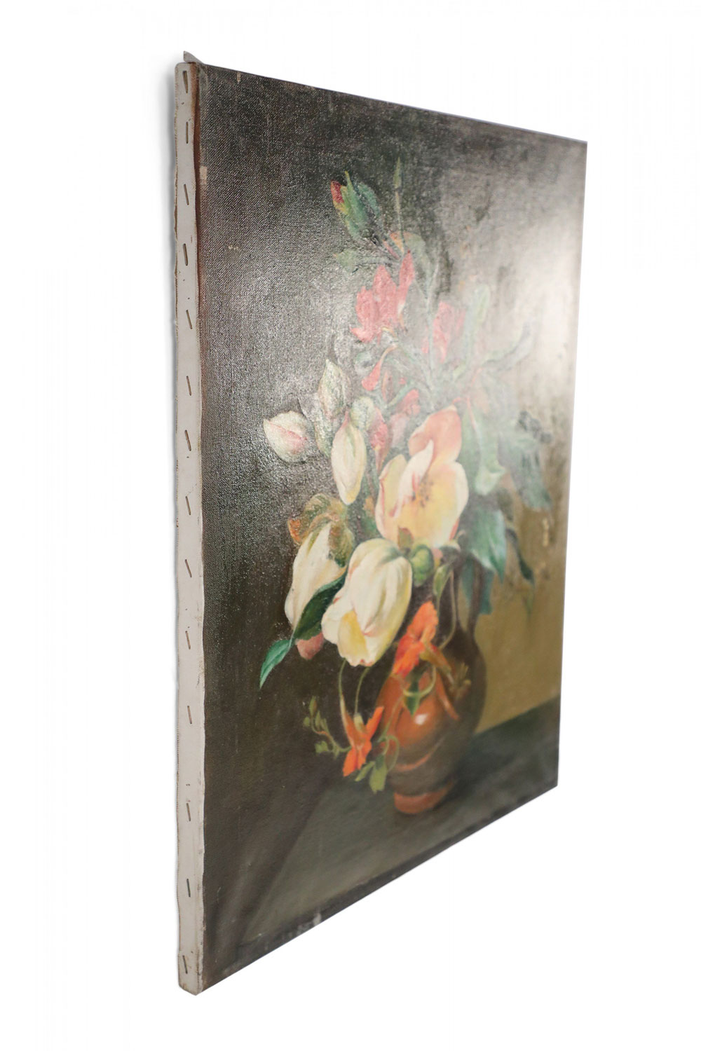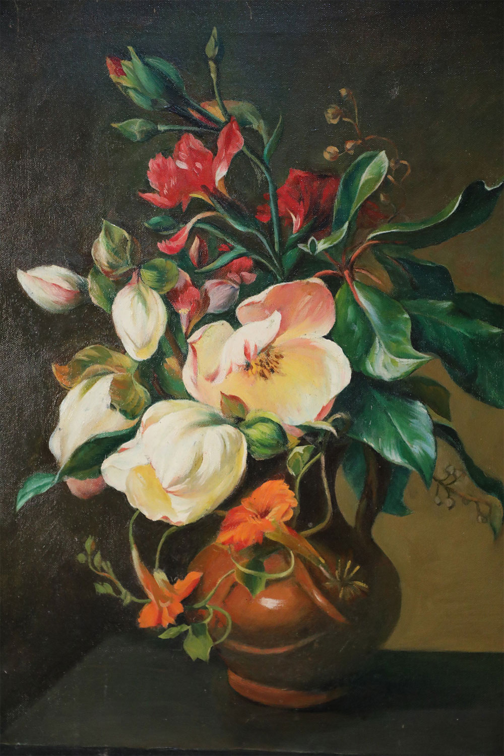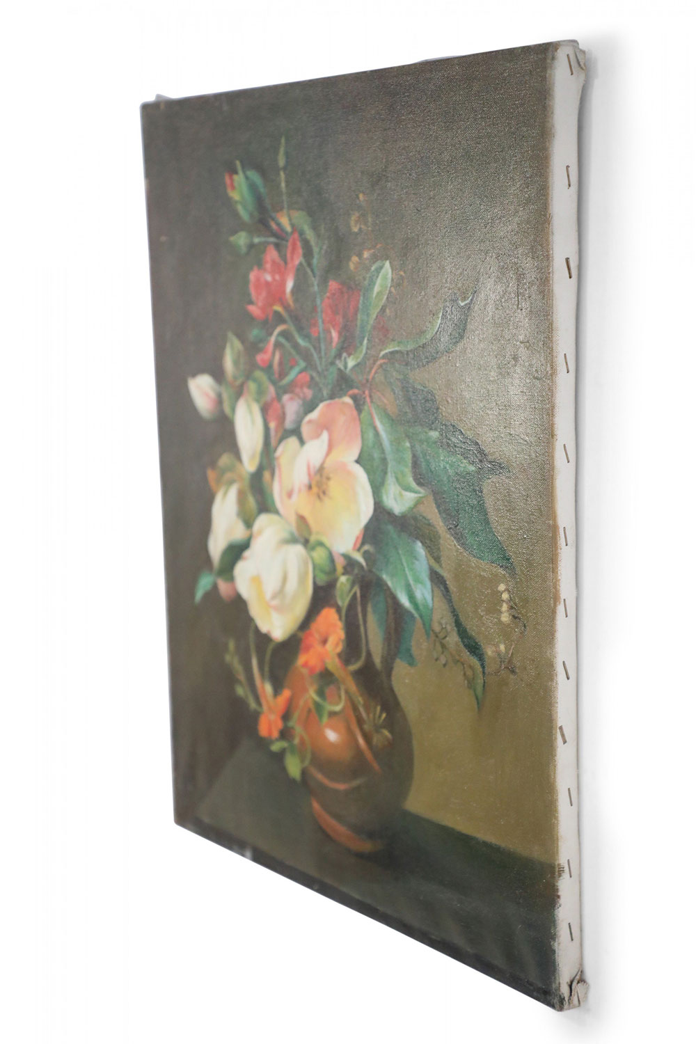Italian Neo-classic style (20th Century) still life oil painting of white and pink flowers with greenery arranged in a ceramic jug, on rectangular, unframed canvas (Similar painting: NWL2267B).