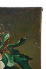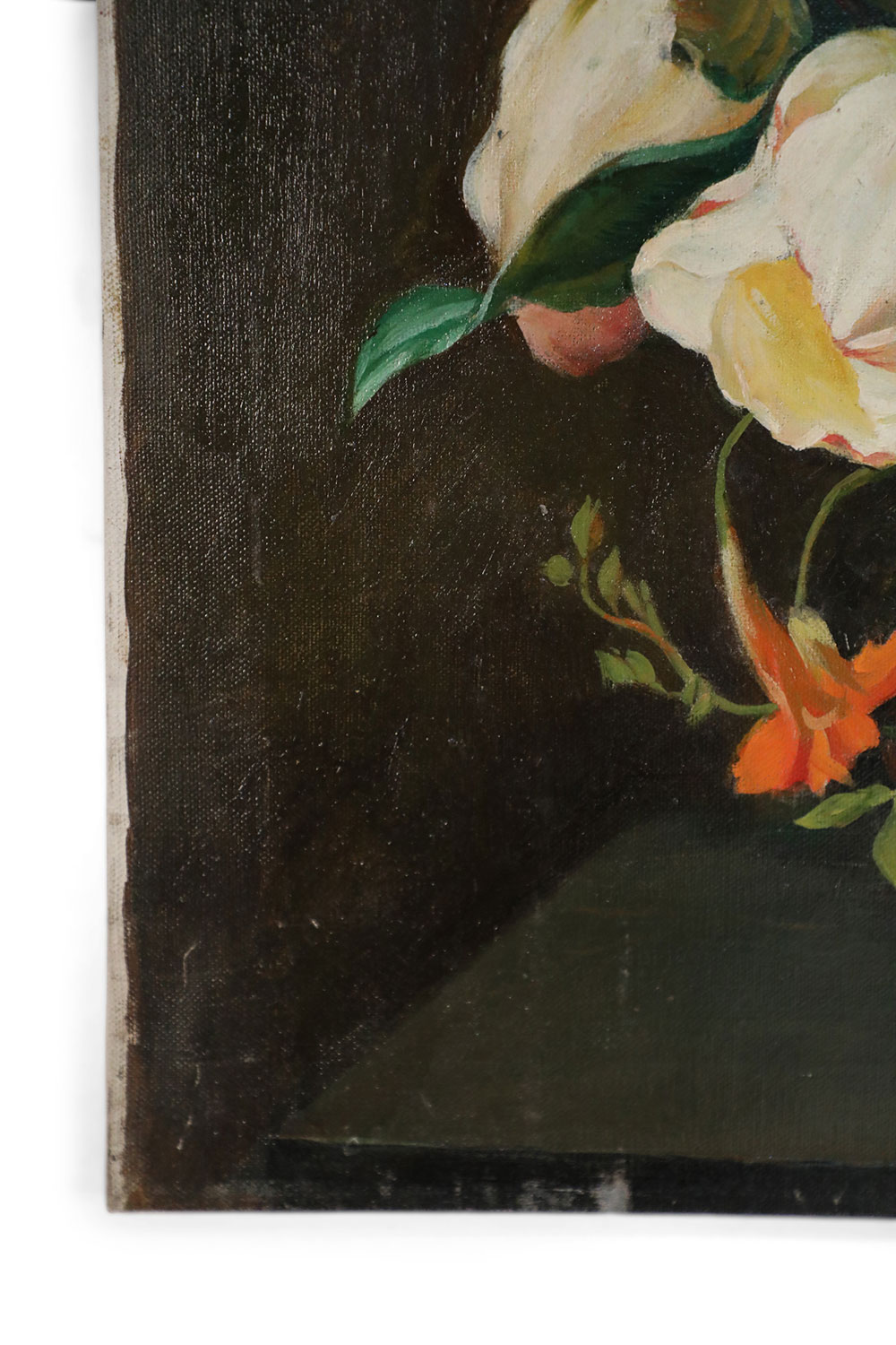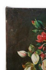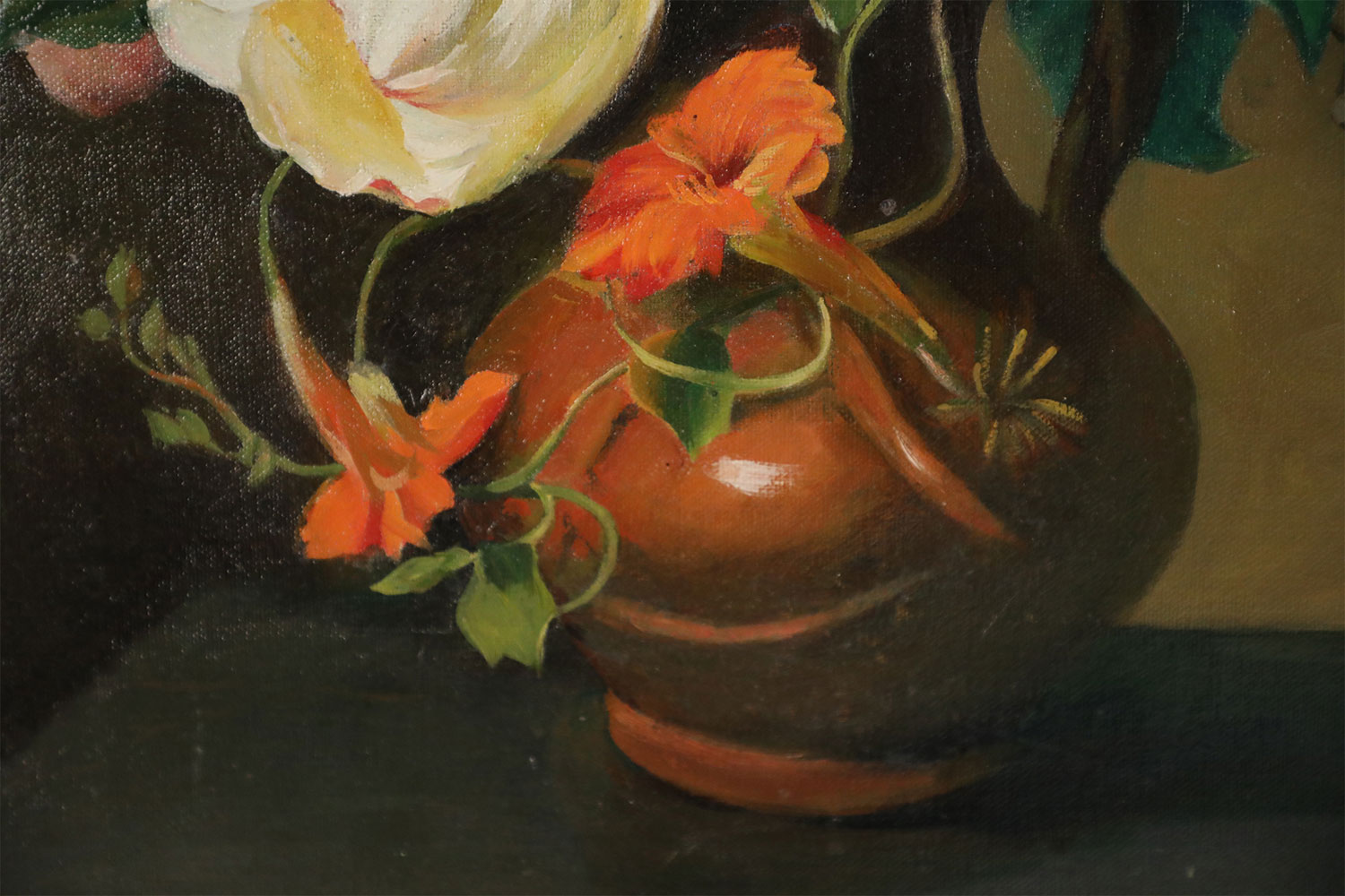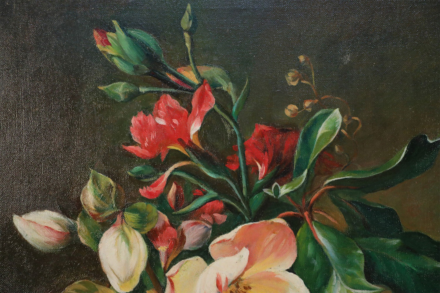 Italian Neo-classic style (20th Century) still life oil painting of white and pink flowers with greenery arranged in a ceramic jug, on rectangular, unframed canvas (Similar painting: NWL2267B).