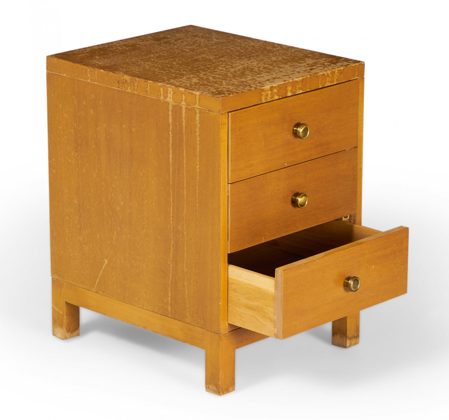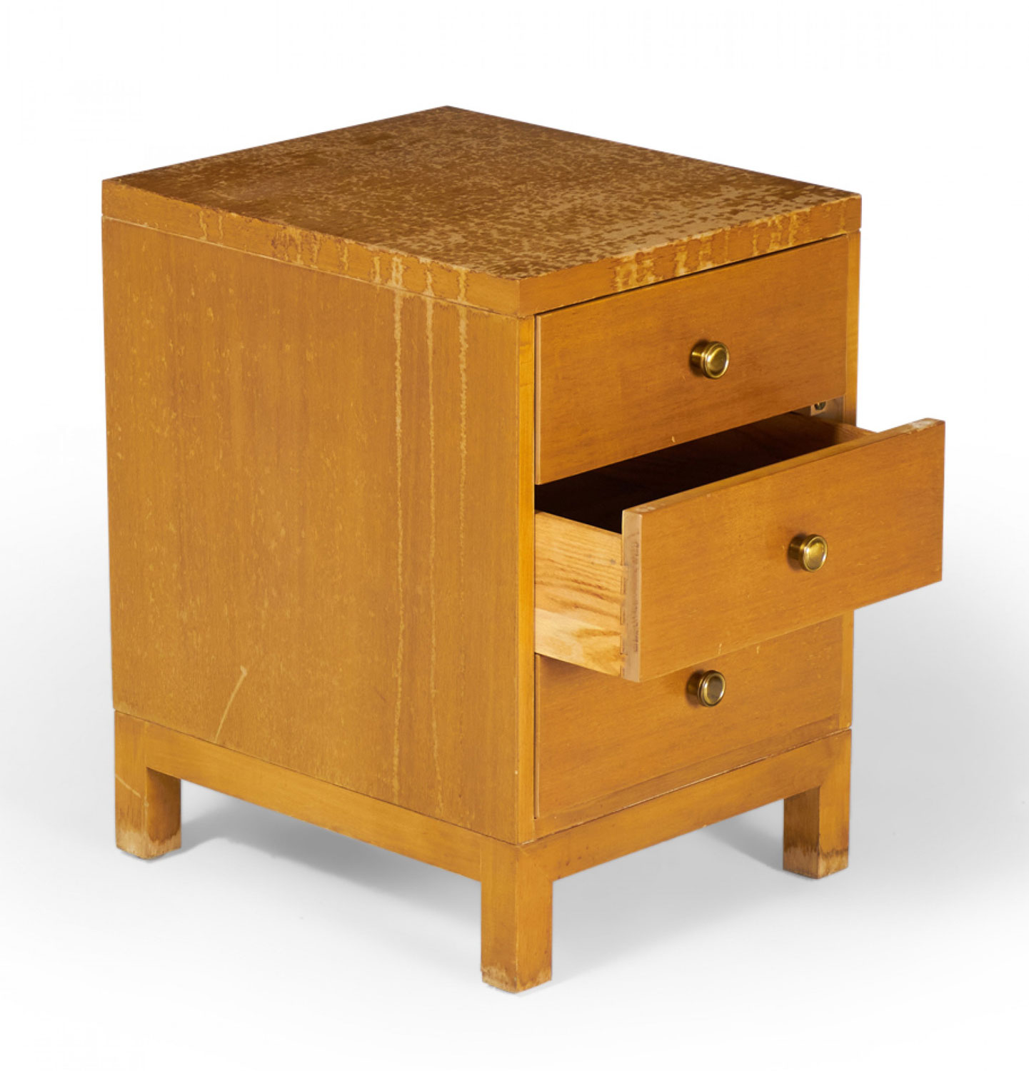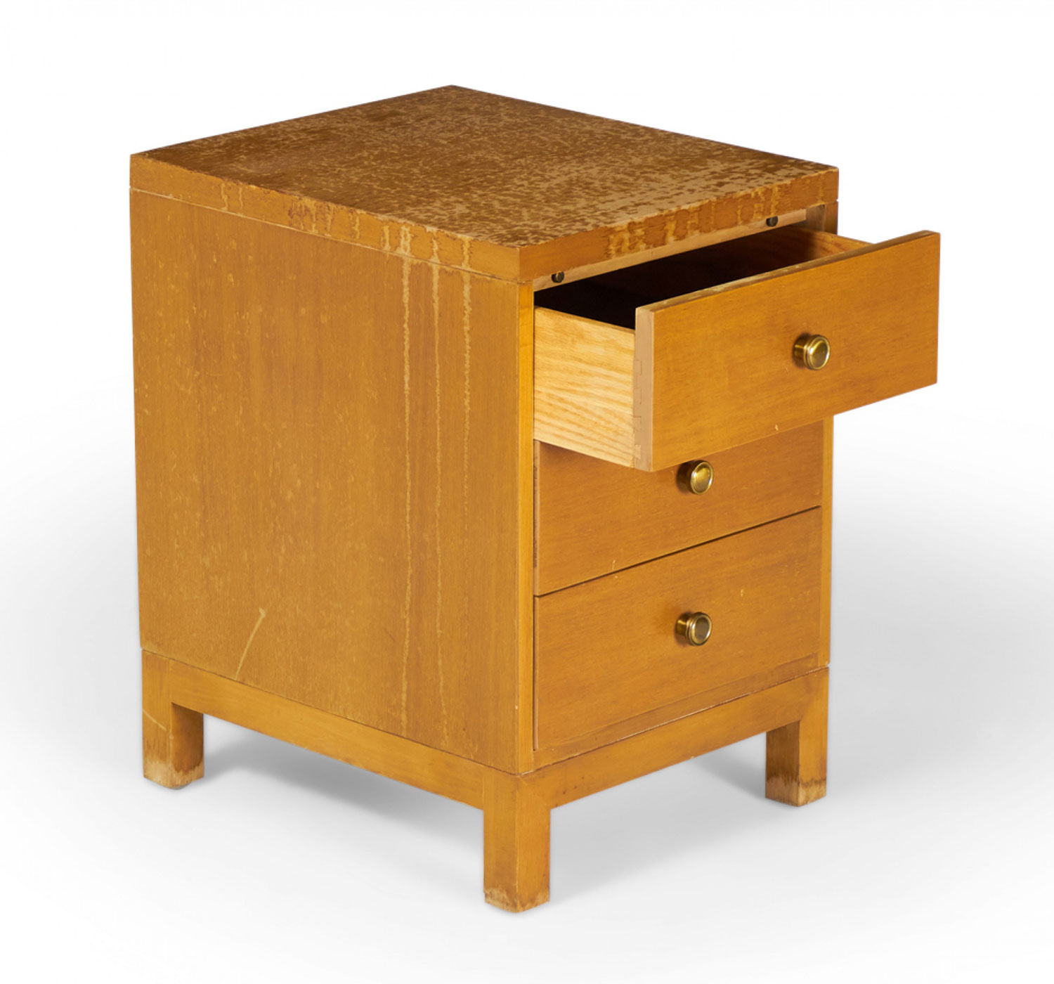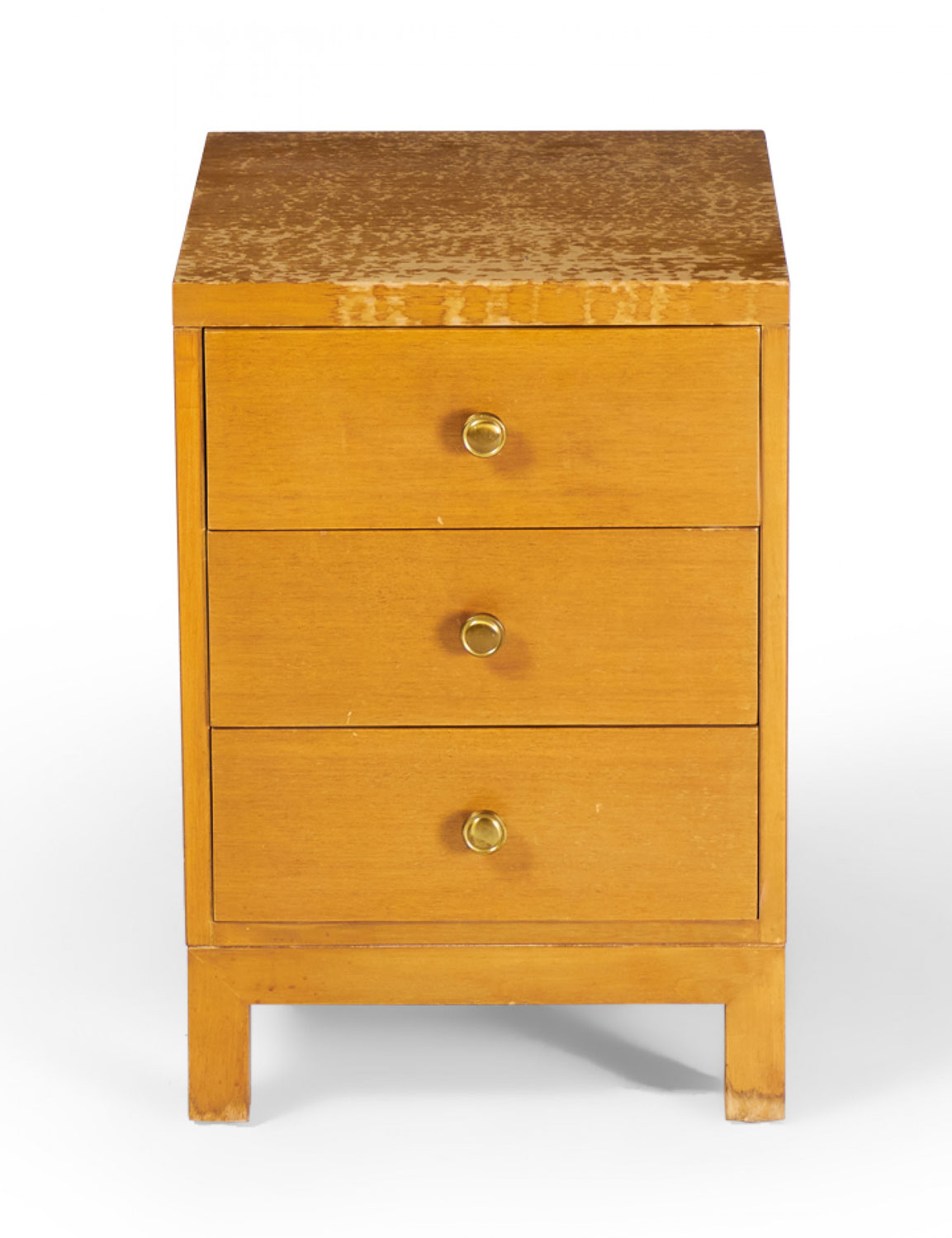 American Mid-Century walnut bedside table / nightstand with three drawers with circular brass drawer pulls resting on four square legs. (WIDDICOMB MODERN)(Similar nightstands: DUF0155B, DUF0155C)