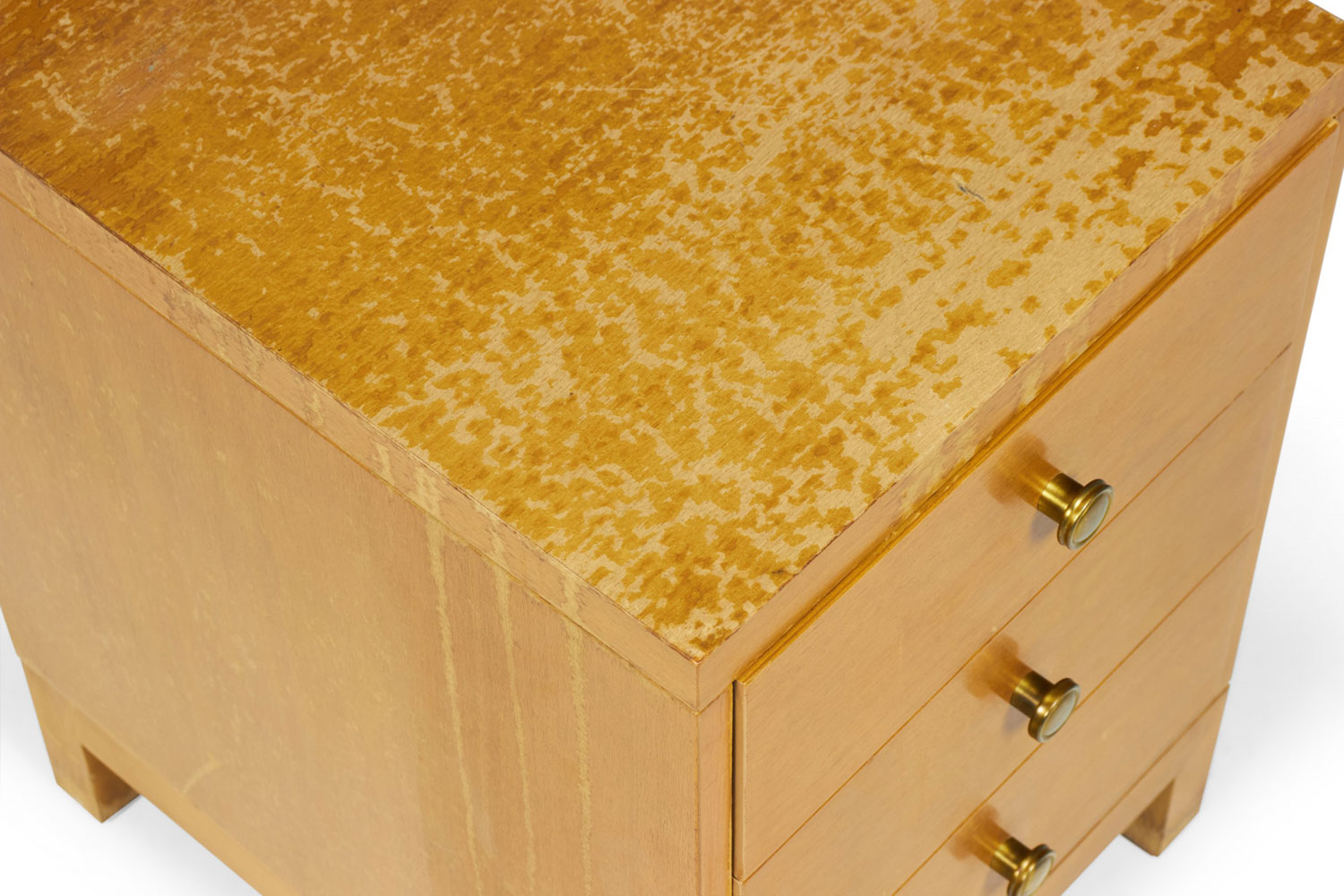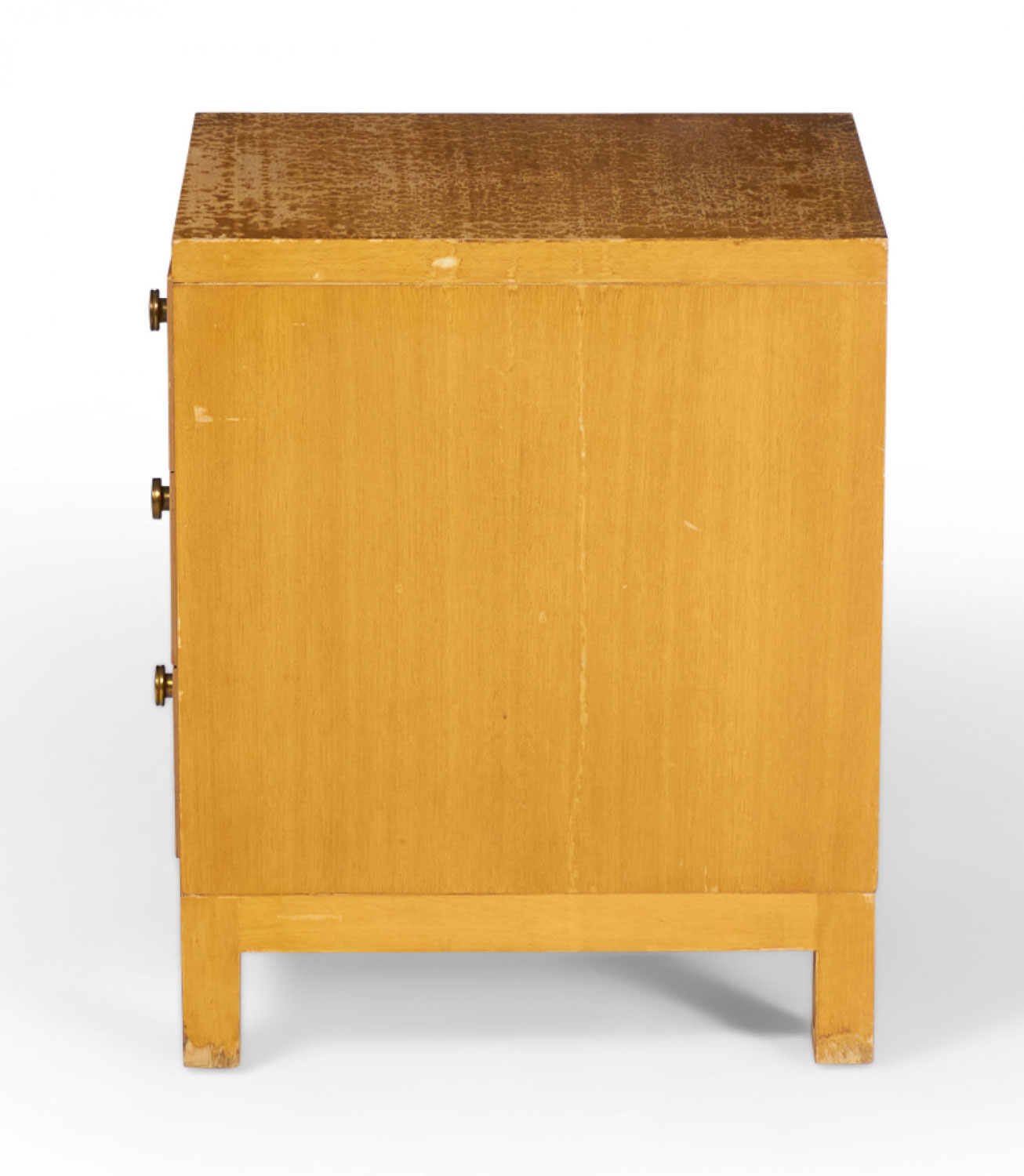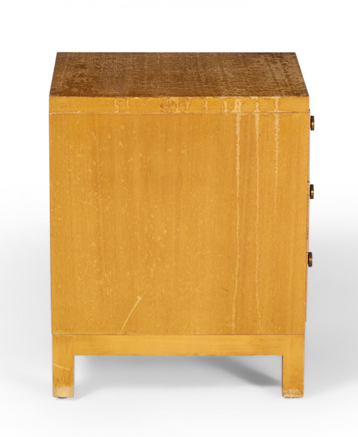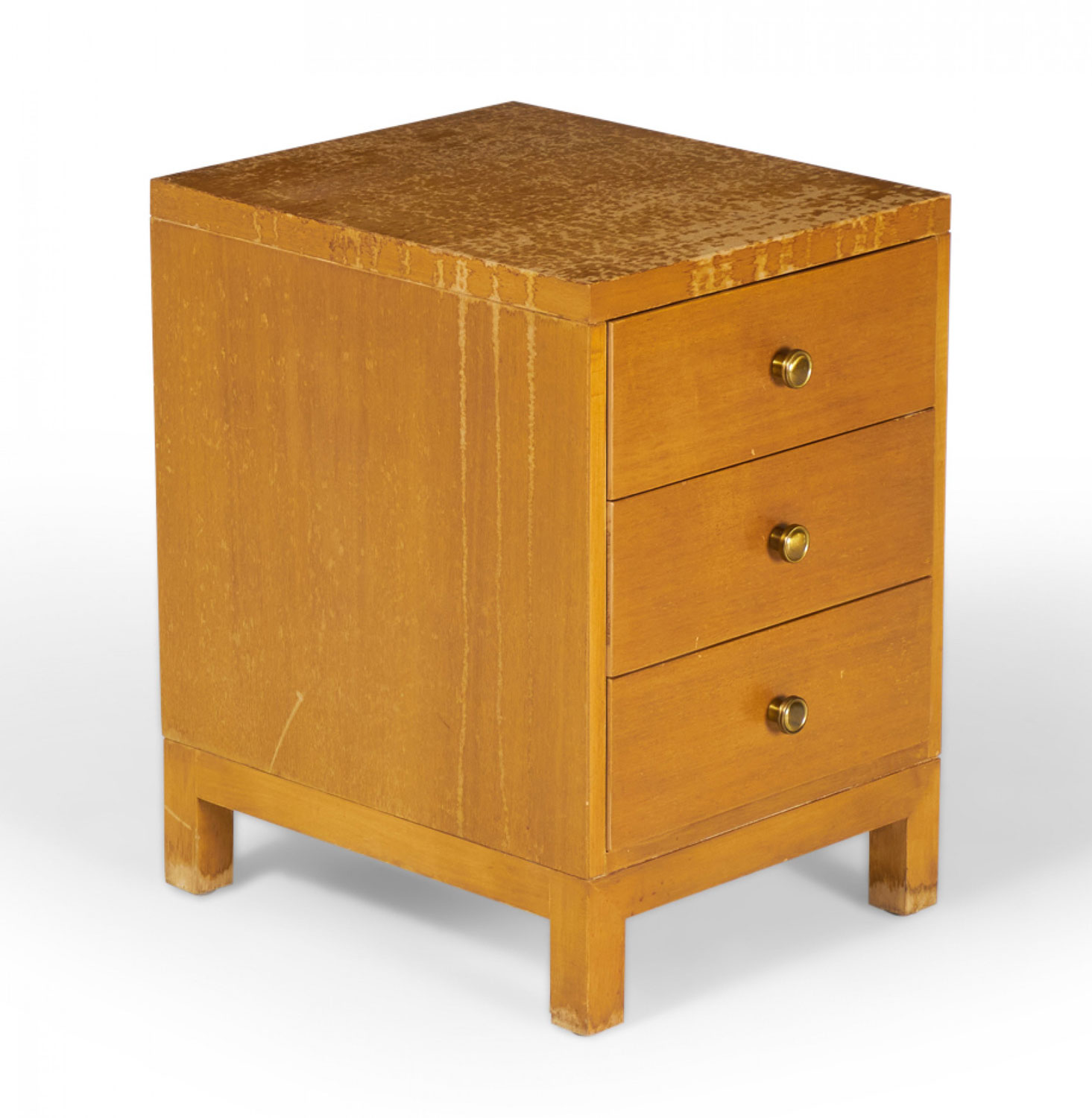 American Mid-Century walnut bedside table / nightstand with three drawers with circular brass drawer pulls resting on four square legs. (WIDDICOMB MODERN)(Similar nightstands: DUF0155B, DUF0155C)