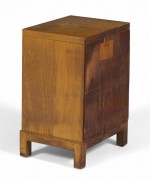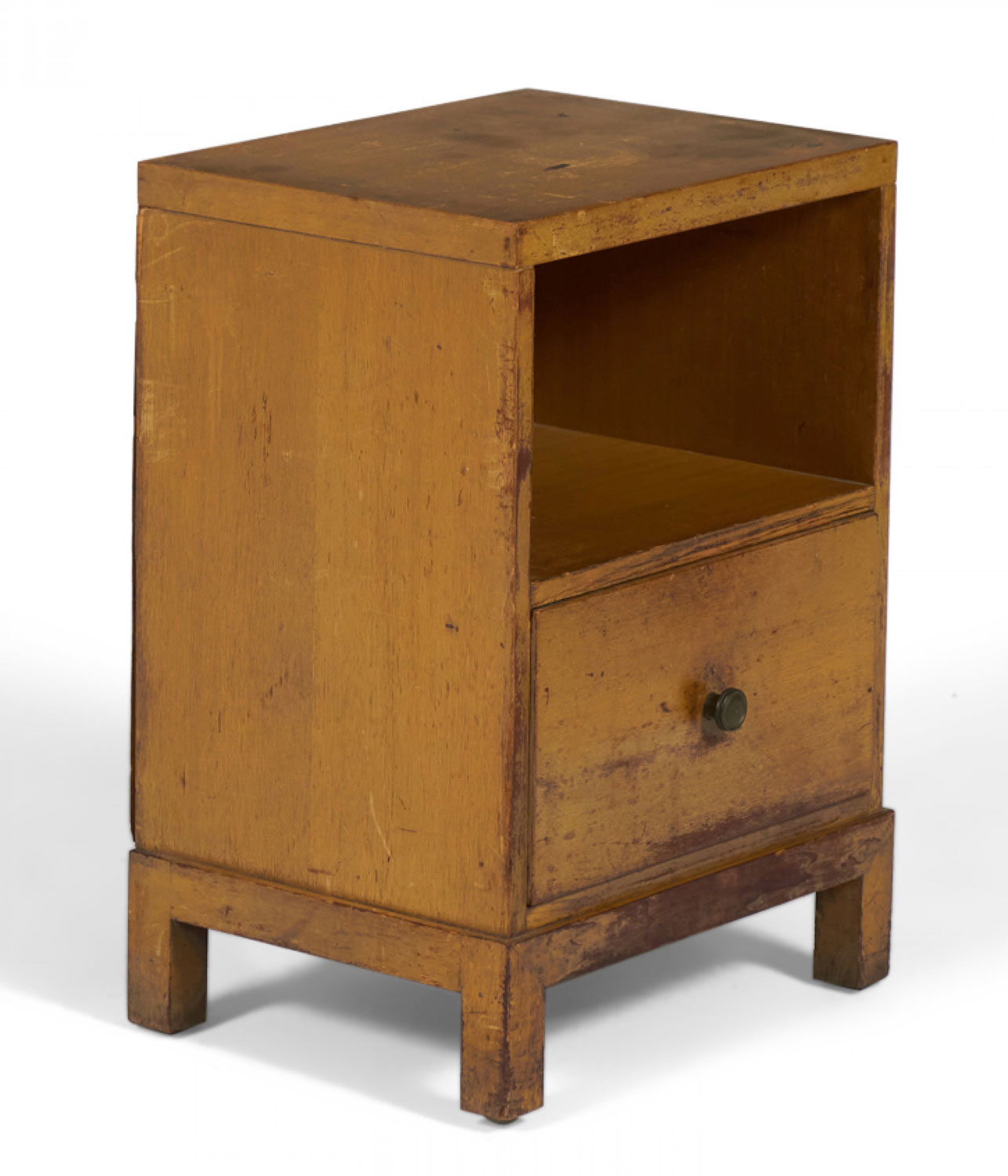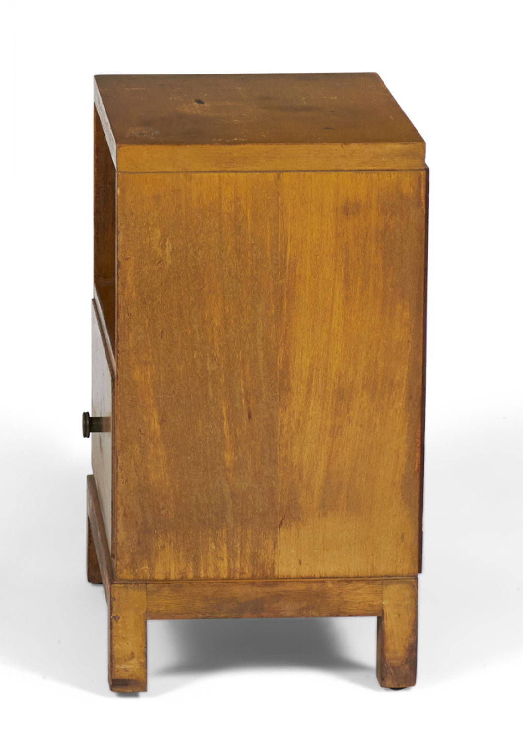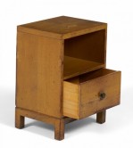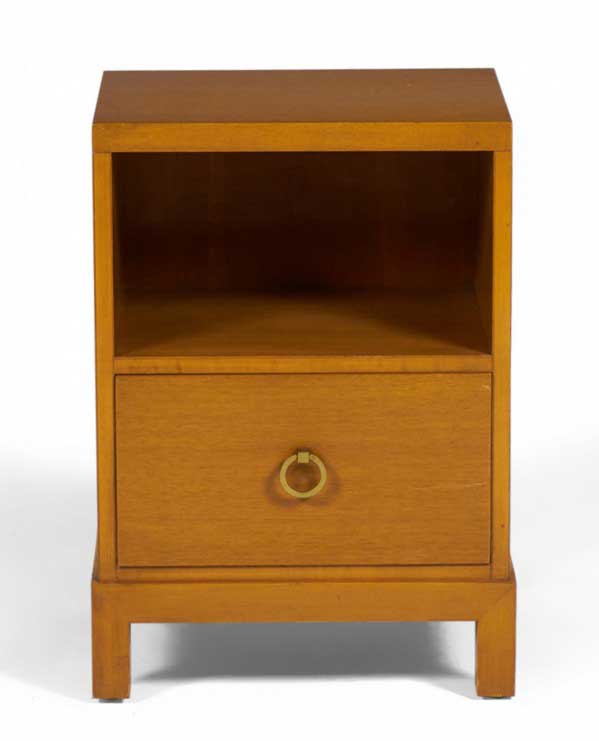 American Mid-Century (1950s) walnut nightstand with an open upper cabinet and a lower drawer with a circular metal drawer pull, resting on a square Chinese-style base. (WIDDICOMB MODERN)(Similar pieces: DUF0145A-D).