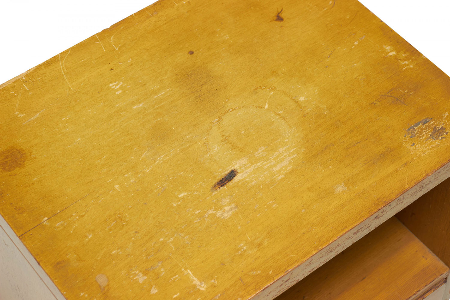 Style: Mid-Century Materials & Techniques: Metal, walnut, wood Category: Tables, Bedroom Condition: Finish is severely damaged.