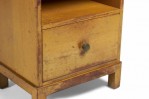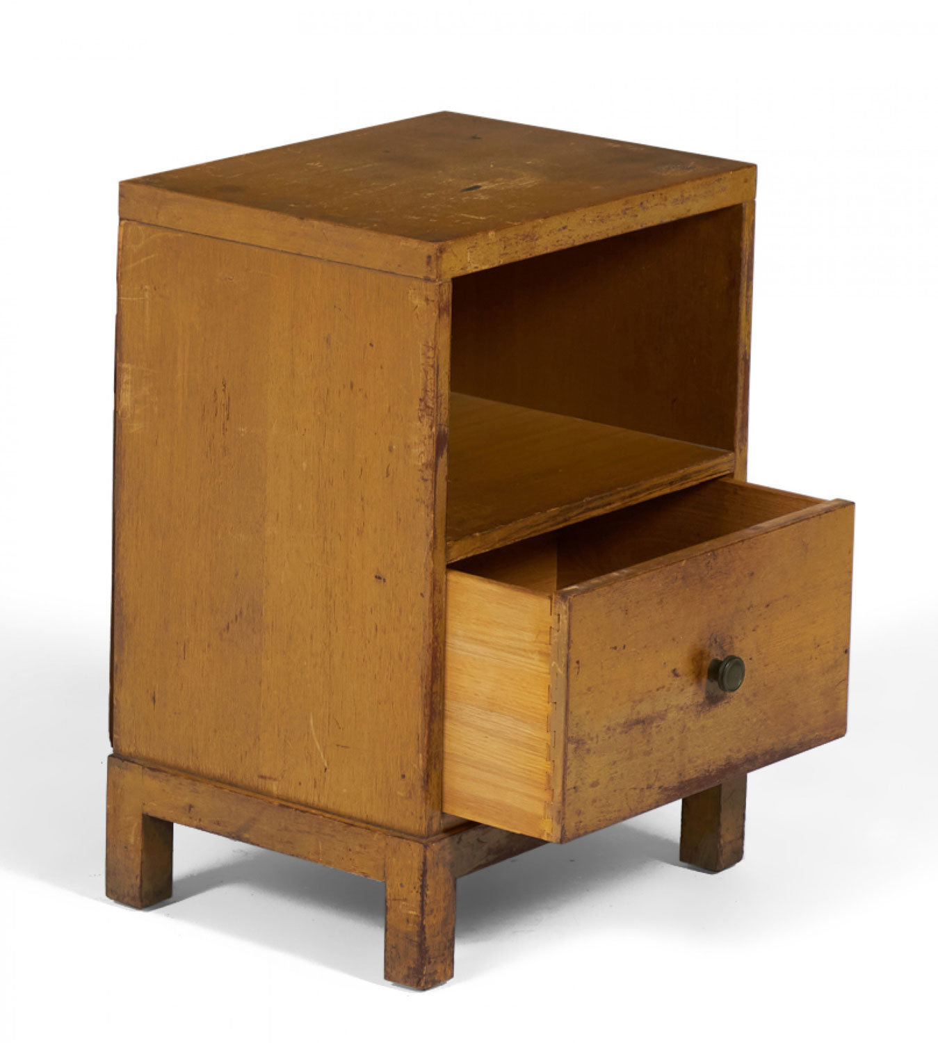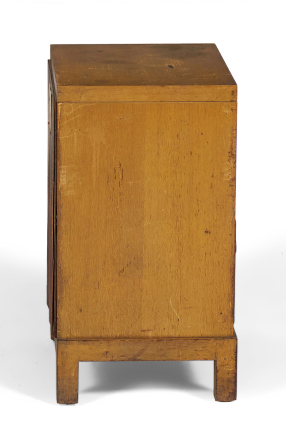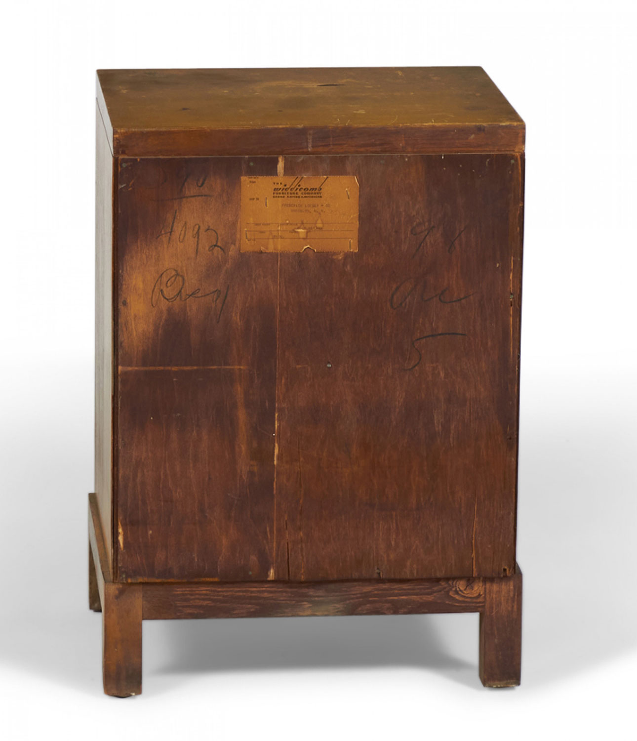 American Mid-Century (1950s) walnut nightstand with an open upper cabinet and a lower drawer with a circular metal drawer pull, resting on a square Chinese-style base. (WIDDICOMB MODERN)(Similar pieces: DUF0145A-D)