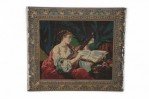Vintage (20th Century) tapestry featuring a woman playing a lute, alongside an open book and flowers, set in a wooden, bronze-finished frame carved with acanthus leaf designs..