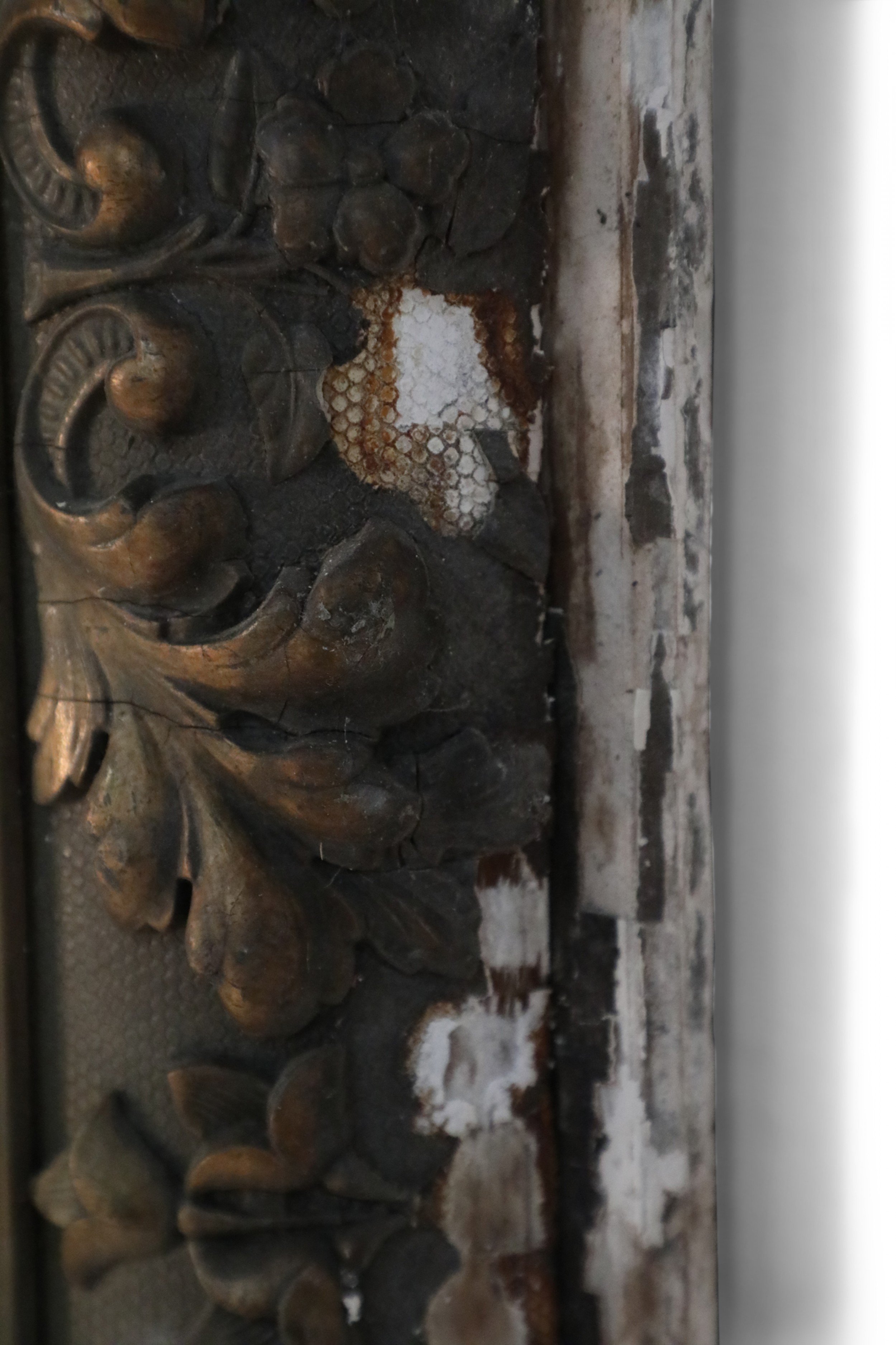 Vintage (20th Century) tapestry featuring a woman playing a lute, alongside an open book and flowers, set in a wooden, bronze-finished frame carved with acanthus leaf designs.