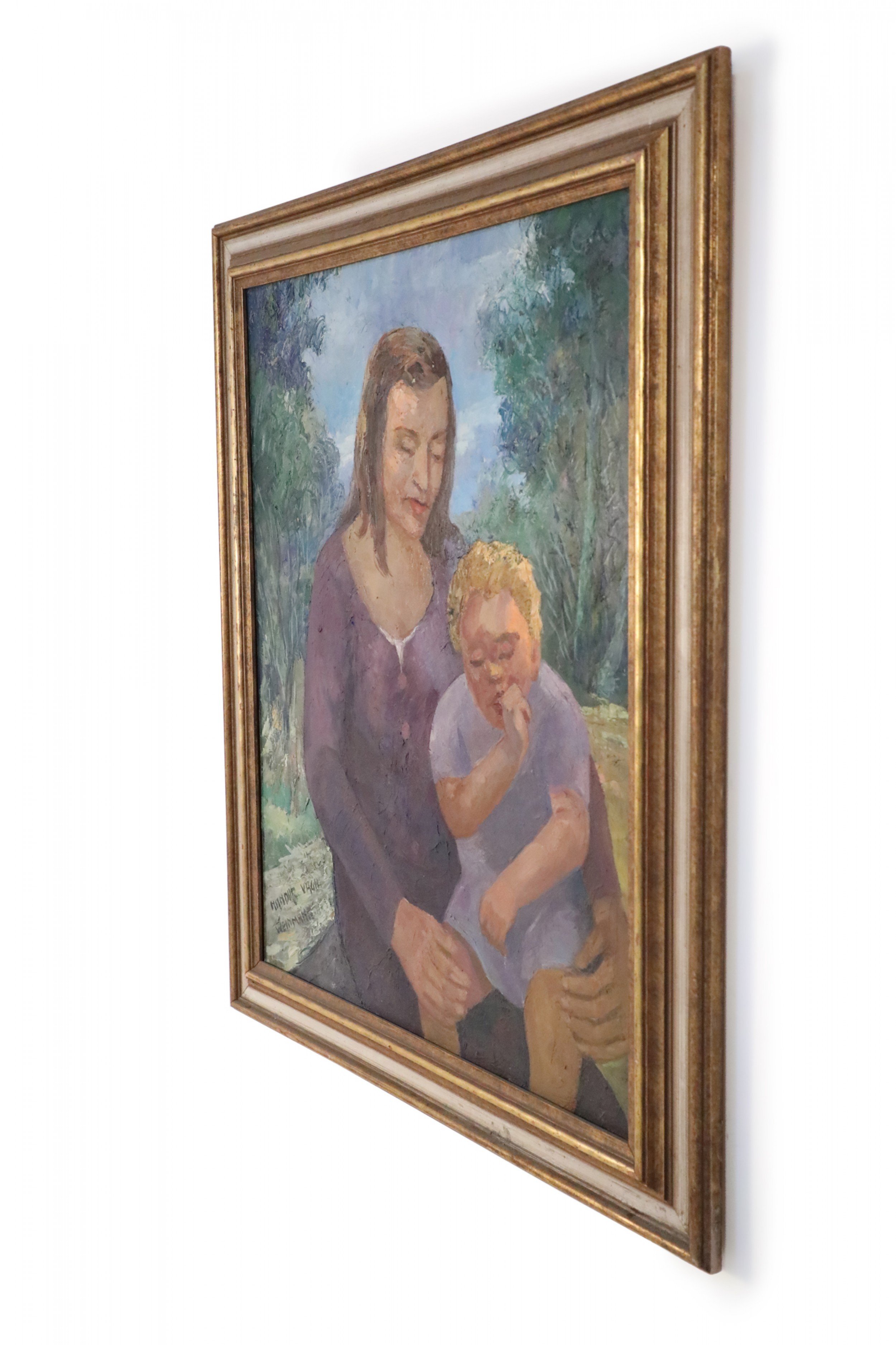 Vintage (20th Century) oil painting of a woman holding a thumb-sucking child on her knee, against a nature-filled background, in a rectangular, giltwood frame..