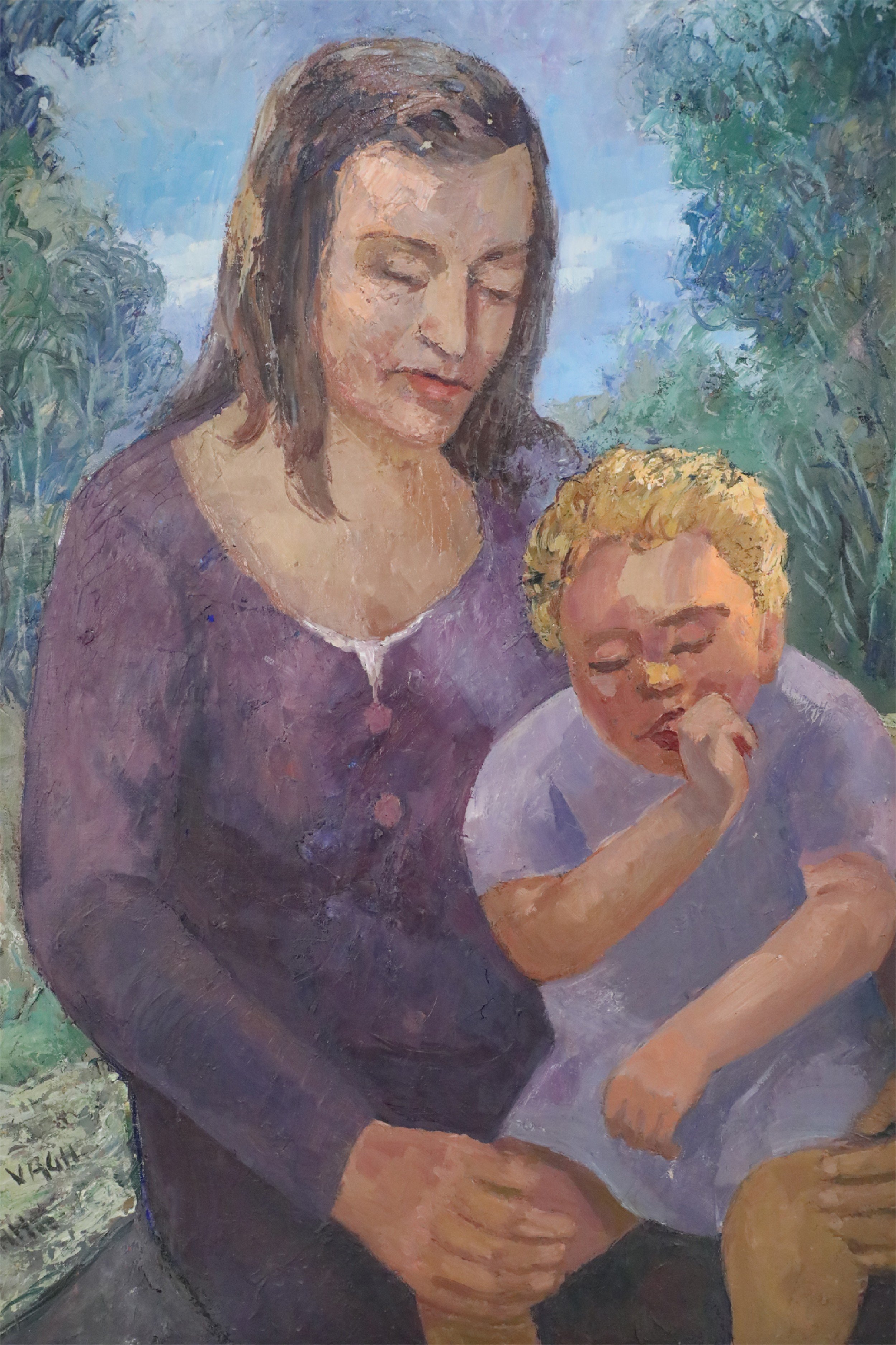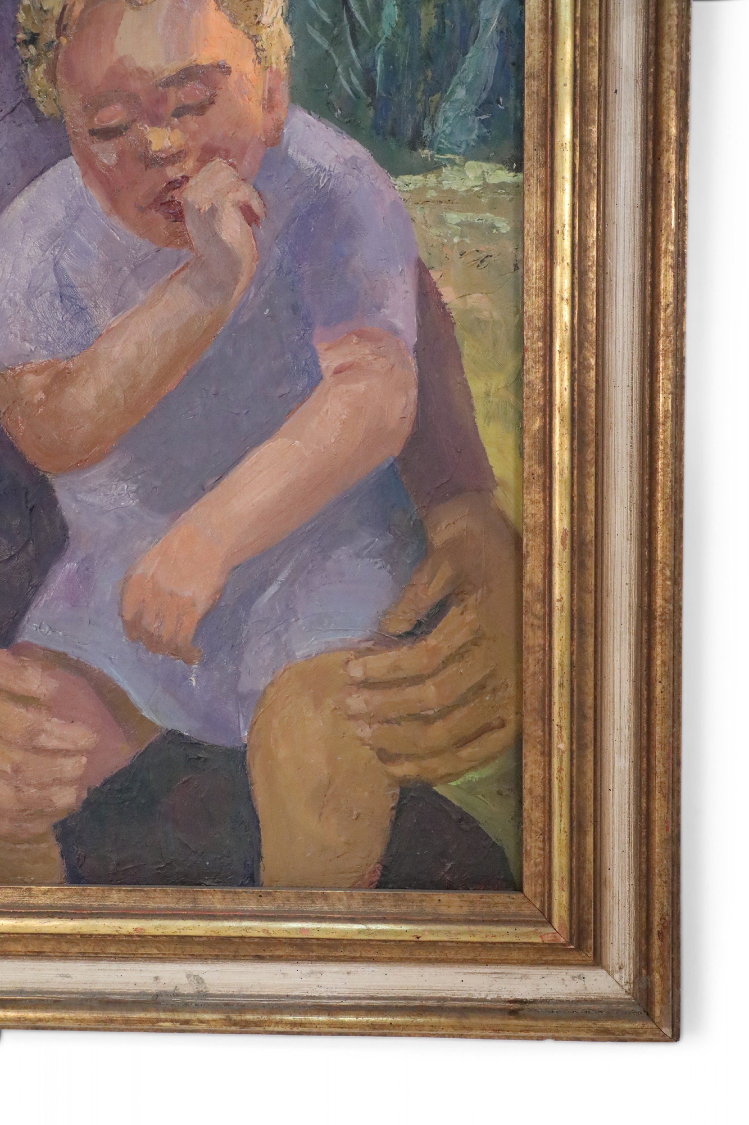 Vintage (20th Century) oil painting of a woman holding a thumb-sucking child on her knee, against a nature-filled background, in a rectangular, giltwood frame.