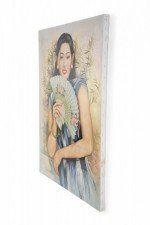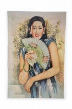 Vintage (20th Century) portrait of a smiling woman wearing a blue and white dress with a green jade bangle, holding a floral paper fan, against a backdrop of green and brown bamboo shoots, painted on rectangular, unframed canvas.