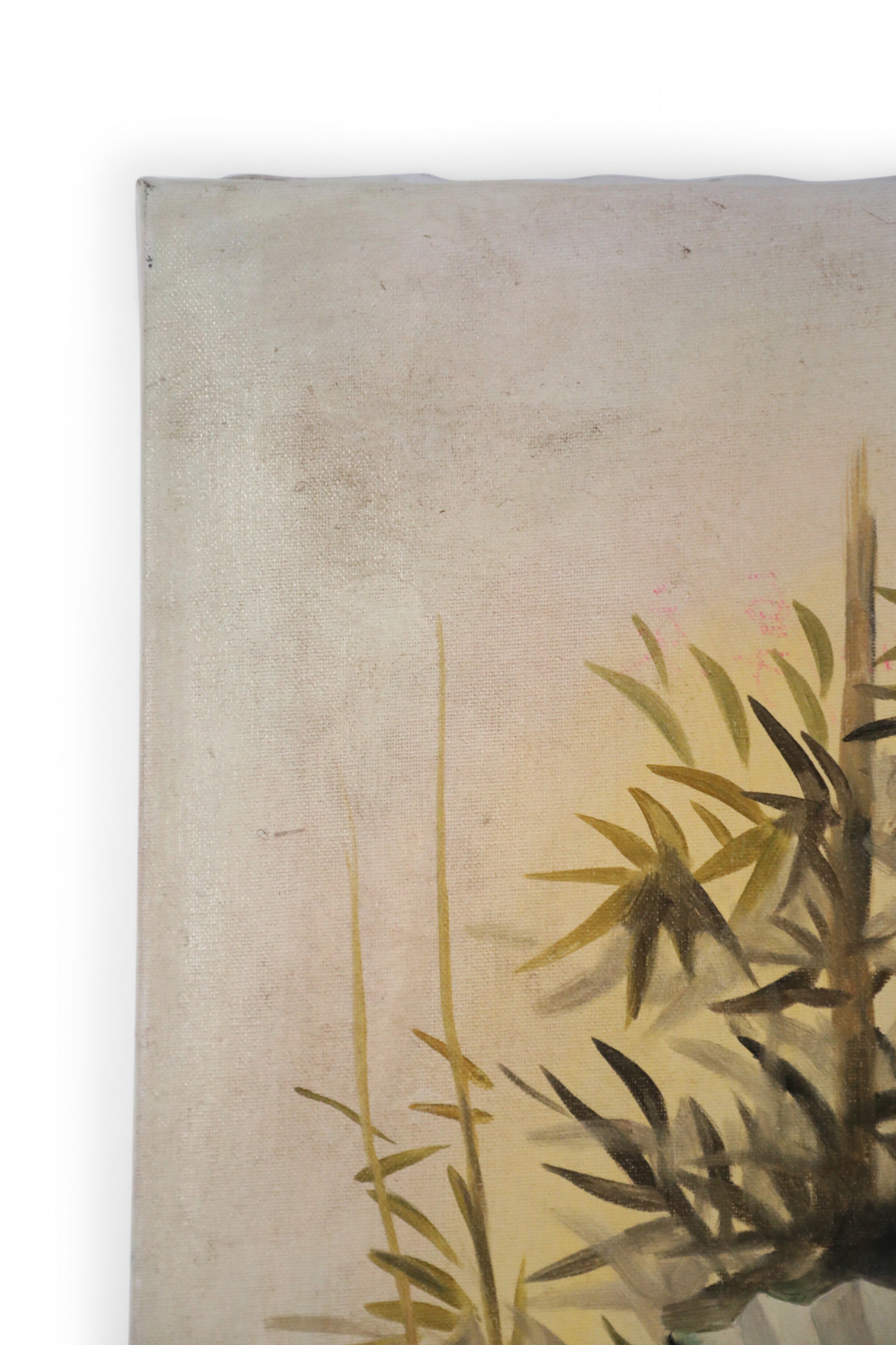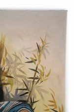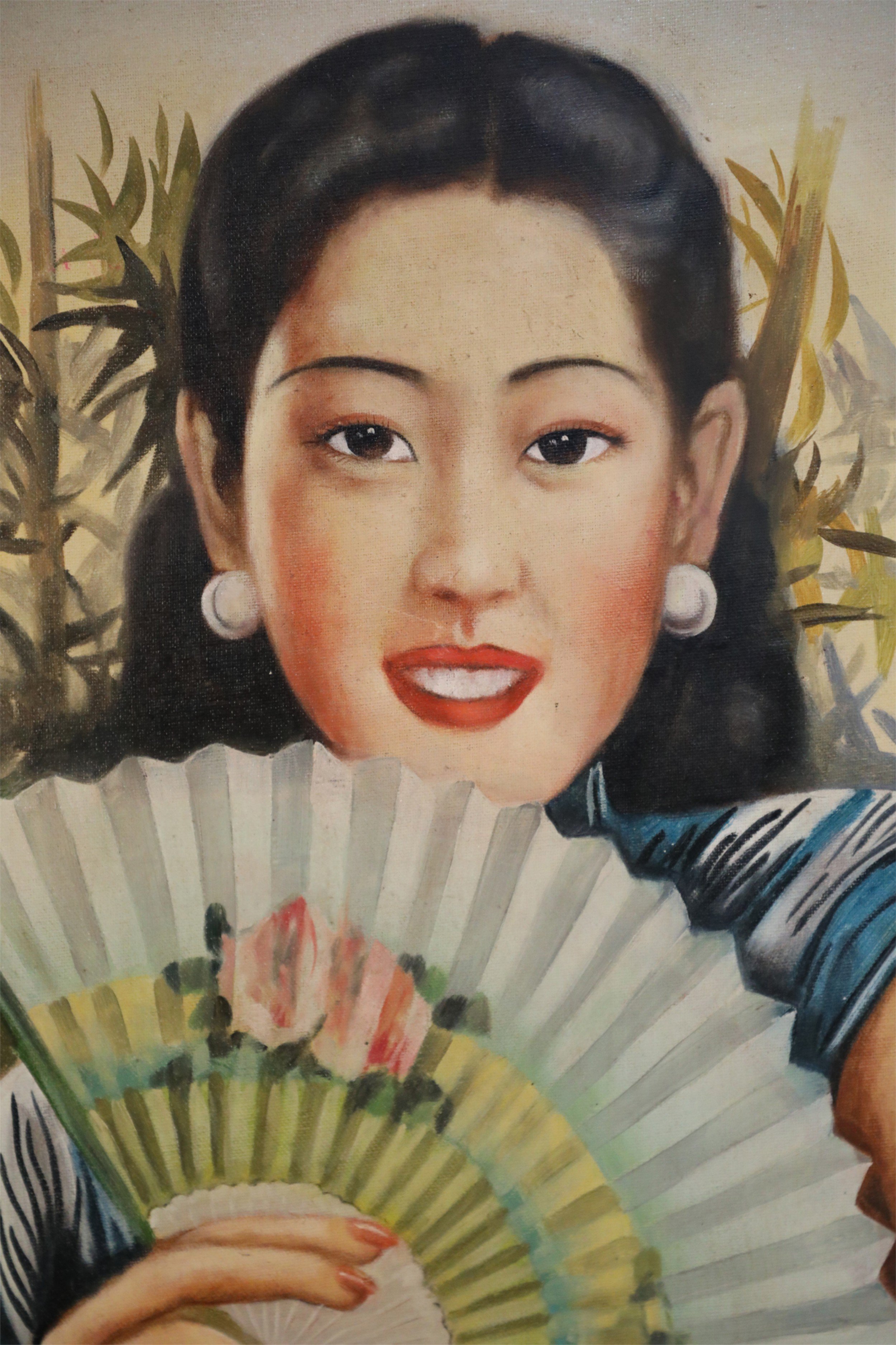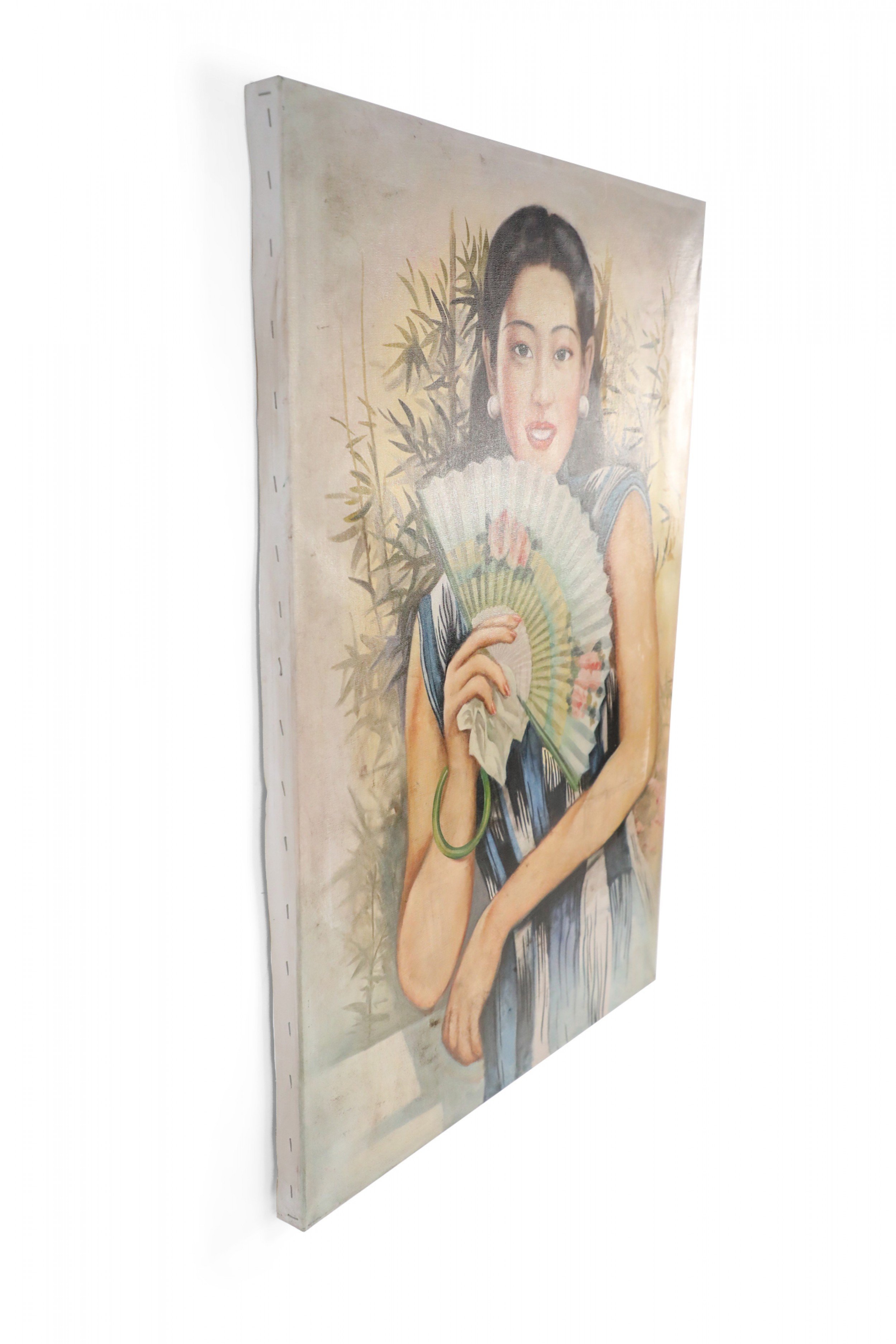 Vintage (20th Century) portrait of a smiling woman wearing a blue and white dress with a green jade bangle, holding a floral paper fan, against a backdrop of green and brown bamboo shoots, painted on rectangular, unframed canvas..