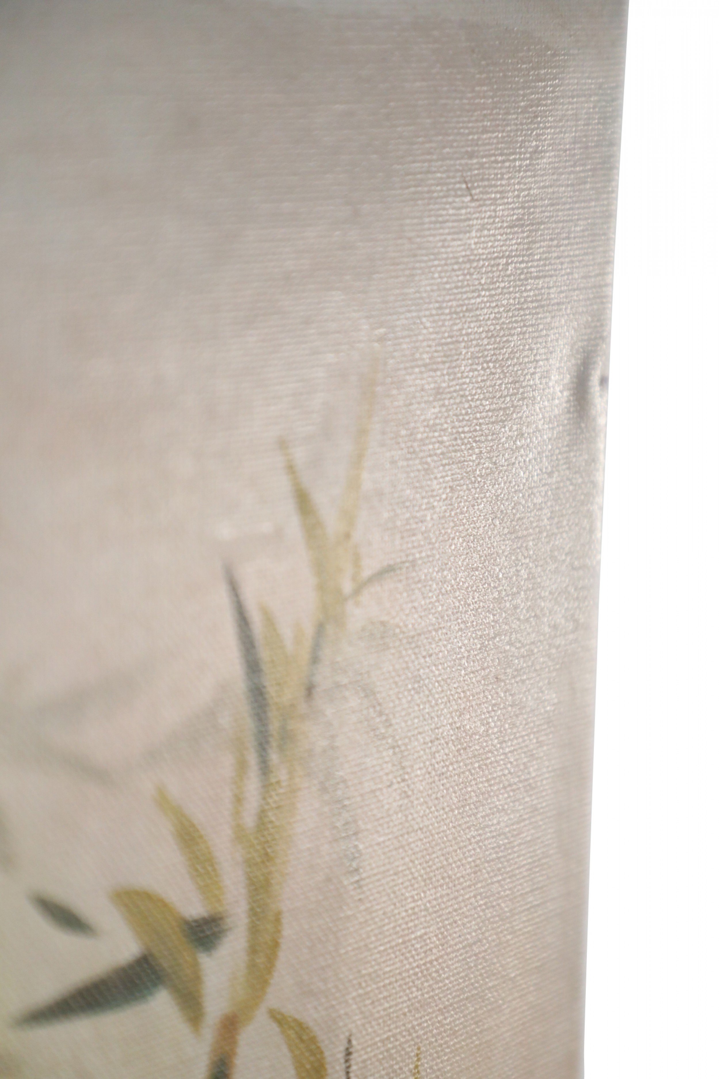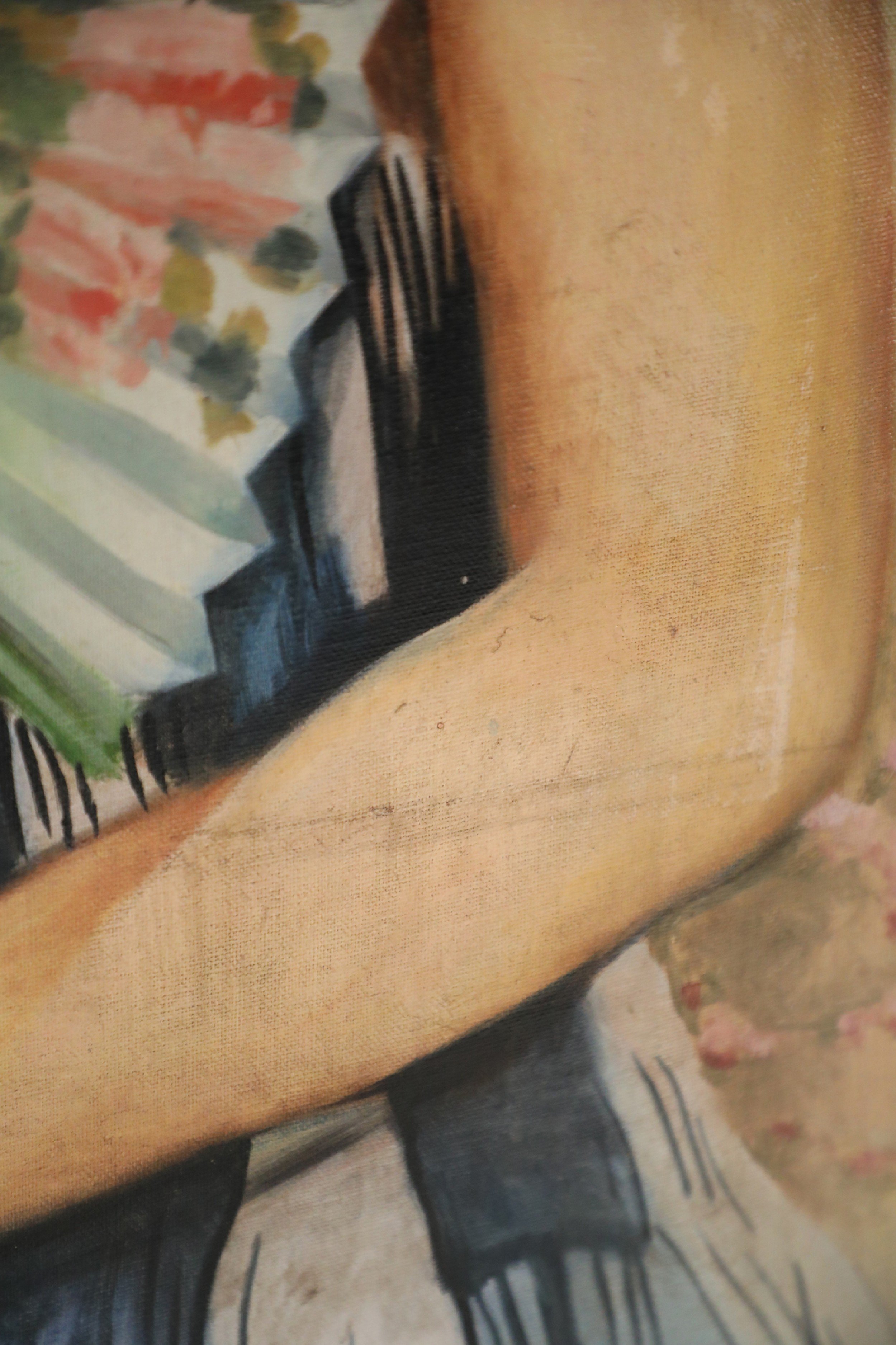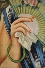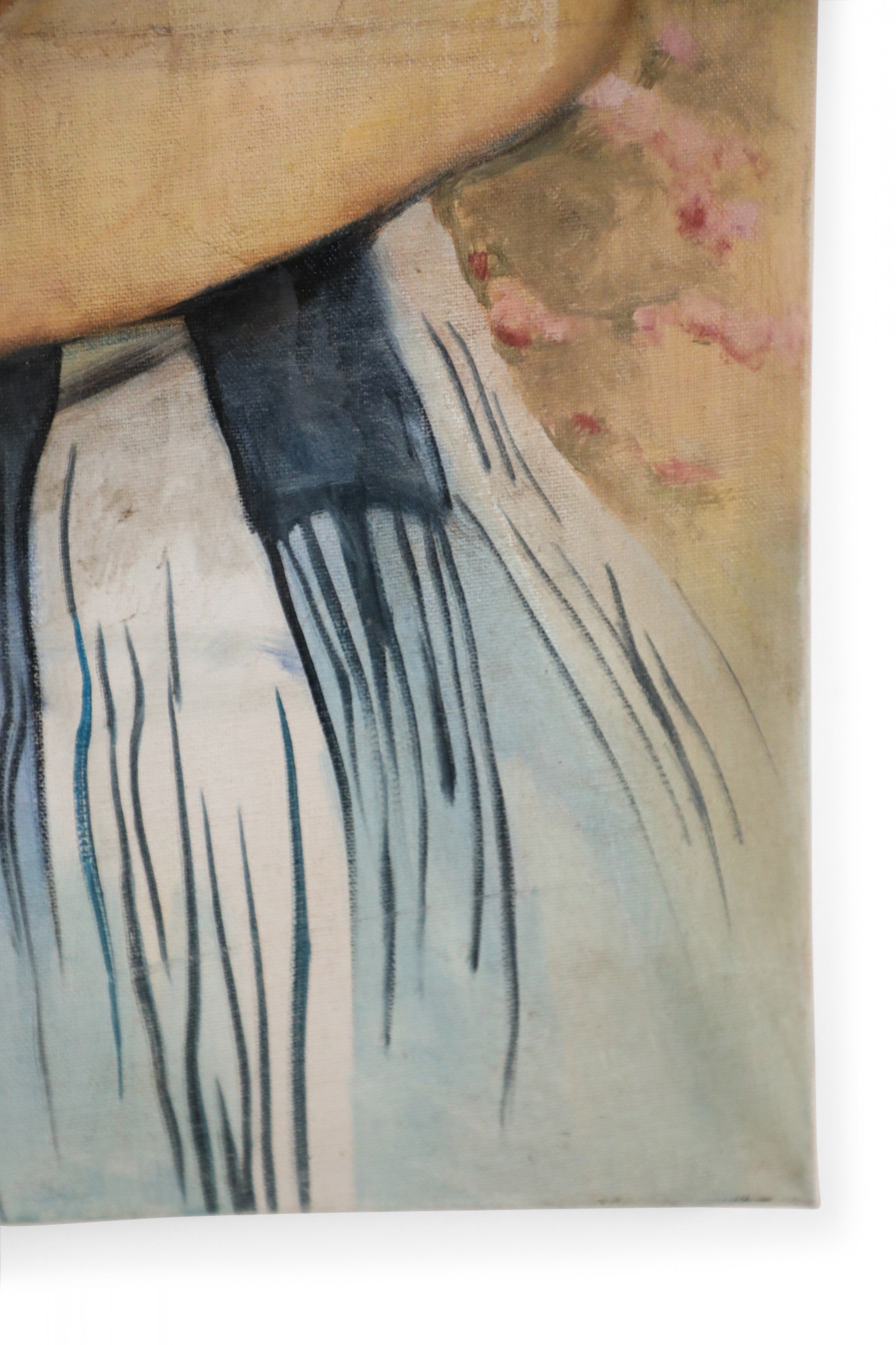 Vintage (20th Century) portrait of a smiling woman wearing a blue and white dress with a green jade bangle, holding a floral paper fan, against a backdrop of green and brown bamboo shoots, painted on rectangular, unframed canvas..