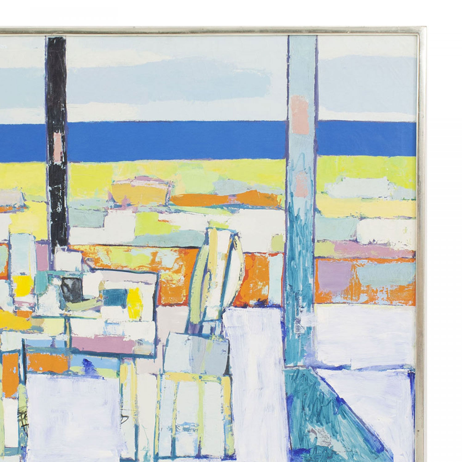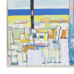 Contemporary abstract painting featuring multi-colored geometric shapes in a wooden frame (by DYANN KLEIN).