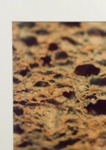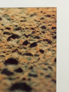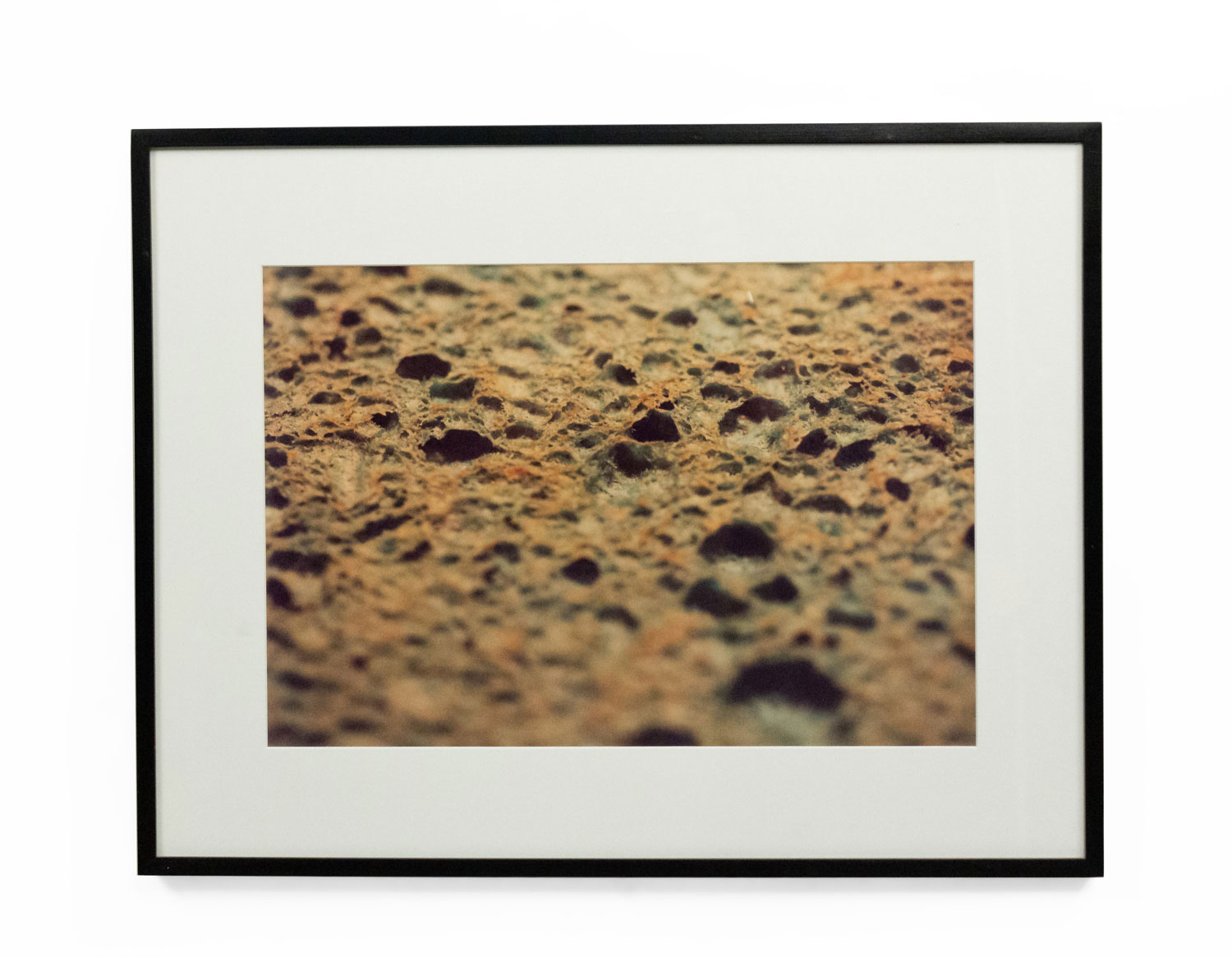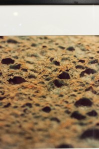 Abstracted color photograph of a piece of bread, landscape quality, with a black frame and a white matte. Photograph by Shelley Harrison.